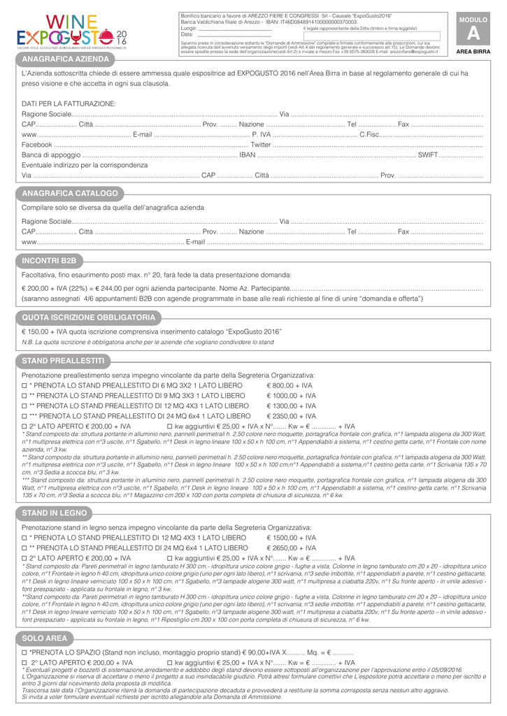 Bonifico bancario a favore di AREZZO FIERE E CONGRESSI Srl - Causale "ExpoGusto2016" Banca Valdichiana filiale di Arezzo - IBAN: IT46D0848914100000000370003 Il legale rappresentante della Ditta (timbro e firma leggibile) Luogo: _____________________________ Data: _____________________________ ANAGRAFICA AZIENDA Saranno prese in considerazione soltanto le "Domande di Ammissione" compilate e firmate conformemente alle prescrizioni, cui sia allegata ricevuta dell’avvenuto versamento degli importi (vedi Art.4 del regolamento generale e successivo art.15). Le Domande devono essere spedite presso la sede dell’organizzazione(vedi Art.2) o inviate a mezzo Fax +39 0575-383028 E-mail: [email protected] MODULO A AREA BIRRA L’Azienda sottoscritta chiede di essere ammessa quale espositrice ad EXPOGUSTO 2016 nell’Area Birra in base al regolamento generale di cui ha preso visione e che accetta in ogni sua clausola. DATI PER LA FATTURAZIONE: Ragione Sociale............................................................................................................. Via .................................................................................................... . CAP...................... Città ........................................................ Prov. ......... Nazione .......................................... Tel .................... Fax ..................................... . www.................................................. E-mail ................................................... P. IVA ............................................. C.Fisc....................................................... Facebook ....................................................................................................... Twitter ............................................................................................................... Banca di appoggio .................................................................................. IBAN .................................................................................... SWIFT........................ Eventuale indirizzo per la corrispondenza Via ........................................................................................ CAP ................... Città ......................................................... Prov. ............................................. ANAGRAFICA CATALOGO Compilare solo se diversa da quella dell’anagrafica azienda Ragione Sociale............................................................................................................. Via .................................................................................................... . CAP...................... Città ........................................................ Prov. ......... Nazione .......................................... Tel .................... Fax ..................................... . www.............................................................................. E-mail .................................................................................................................................................. INCONTRI B2B Facoltativa, fino esaurimento posti max. n° 20, farà fede la data presentazione domanda: € 200,00 + IVA (22%) = € 244,00 per ogni azienda partecipante. Nome Az. Partecipante..................................................................................................... . (saranno assegnati 4/6 appuntamenti B2B con agende programmate in base alle reali richieste al fine di unire “domanda e offerta”) QUOTA ISCRIZIONE OBBLIGATORIA € 150,00 + IVA quota iscrizione comprensiva inserimento catalogo “ExpoGusto 2016” N.B. La quota iscrizione è obbligatoria anche per le aziende che vogliano condividere lo stand STAND PREALLESTITI Prenotazione preallestimento senza impegno vincolante da parte della Segreteria Organizzativa: * PRENOTA LO STAND PREALLESTITO DI 6 MQ 3X2 1 LATO LIBERO € 800,00 + IVA ** PRENOTA LO STAND PREALLESTITO DI 9 MQ 3X3 1 LATO LIBERO € 1000,00 + IVA ** PRENOTA LO STAND PREALLESTITO DI 12 MQ 4X3 1 LATO LIBERO € 1300,00 + IVA *** PRENOTA LO STAND PREALLESTITO DI 24 MQ 6x4 1 LATO LIBERO € 2350,00 + IVA 2° LATO APERTO € 200,00 + IVA kw aggiuntivi € 25,00 + IVA x N°....... Kw = € ............. + IVA * Stand composto da: struttura portante in alluminio nero, pannelli perimetrali h. 2.50 colore nero moquette, portagrafica frontale con grafica, n°1 lampada alogena da 300 Watt, n°1 multipresa elettrica con n°3 uscite, n°1 Sgabello, n°1 Desk in legno lineare 100 x 50 x h 100 cm, n°1 Appendiabiti a sistema, n°1 cestino getta carte, n°1 Frontale con nome azienda, n° 3 kw. ** Stand composto da: struttura portante in alluminio nero, pannelli perimetrali h. 2.50 colore nero moquette, portagrafica frontale con grafica, n°1 lampada alogena da 300 Watt, n°1 multipresa elettrica con n°3 uscite, n°1 Sgabello, n°1 Desk in legno lineare 100 x 50 x h 100 cm,n°1 Appendiabiti a sistema,n°1 cestino getta carte, n°1 Scrivania 135 x 70 cm, n°3 Sedia a scocca blu, n° 3 kw. *** Stand composto da: struttura portante in alluminio nero, pannelli perimetrali h. 2.50 colore nero moquette, portagrafica frontale con grafica, n°1 lampada alogena da 300 Watt, n°1 multipresa elettrica con n°3 uscite, n°1 Sgabello, n°1 Desk in legno lineare 100 x 50 x h 100 cm, n°1 Appendiabiti a sistema, n°1 cestino getta carte, n°1 Scrivania 135 x 70 cm, n°3 Sedia a scocca blu, n°1 Magazzino cm 200 x 100 con porta completa di chiusura di sicurezza, n° 6 kw. STAND IN LEGNO Prenotazione stand in legno senza impegno vincolante da parte della Segreteria Organizzativa: * PRENOTA LO STAND PREALLESTITO DI 12 MQ 4X3 1 LATO LIBERO € 1500,00 + IVA ** PRENOTA LO STAND PREALLESTITO DI 24 MQ 6x4 1 LATO LIBERO € 2650,00 + IVA 2° LATO APERTO € 200,00 + IVA kw aggiuntivi € 25,00 + IVA x N°....... Kw = € ............. + IVA * Stand composto da: Pareti perimetrali in legno tamburat