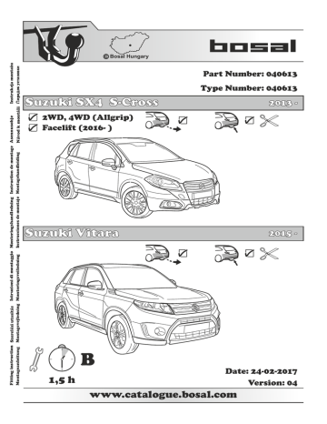 Fitting instruction Szerelési utasítás Istruzioni di montaggio Monteringshandledning Instruction de montage Asennusohje Instrukcja montazu Instrucciones de montaje Montagehandleiding Montageanleitung Montagevejledning Monteringsveiledning Návod k montázi op oK ycTaHoBK Bosal Hungary Part Number: 040613 Type Number: 040613 Suzuki SX4 S-Cross B 1,5 h 2013 - 2WD, 4WD (Allgrip) Facelift (2016- ) Suzuki Vitara 2015 - Date: 24-02-2017 Version: 04 www.catalogue.bosal.com E7 55R-011519 ECE R55 homologation S = 75 kg D= MAX KG X MAX KG MAX KG + MAX KG X 0,00981 < 8,30 kN 1870 kg 1500 kg D = 8,30 kN GB The clearance specified in appendix VII, diagram 25 of guideline ECE-R 55 must be guaranteed. GB at laden weight of the vehicle D Der Freiraum nach Anhang VII, Abbildung 25 der Richtlinie ECE-R 55 ist zu gewährleisten. D bei zulässigem Gesamtgewicht des Fahrzeuges H H rakománnyal terhelt járműsúly esetén. F Az ECE-R 55 irányelv VII. mellékletében, a 25. ábrán a vonógömb elhelyezése számára előírt szabad tér-adatokat biztosítani kell. La zone de dégagement doit être garantie conformément à l’annexe VII, illustration 25 de la directive ECE-R 55. I Deve essere garantito lo spazio libero secondo l’allegato VII, figura 25 della direttiva ECE-R 55. NL De tussenruimte conform supplement VII, afbeelding 25 van de richtlijn ECE-R 55 moet in acht worden genomen. E N pour poids total en charge autorisé du véhicule I per un peso complessivo ammesso del veicolo NL bij toelaatbaar totaal gewicht van het voertuig E Debe garantizarse el espacio libre, conforme al anexo VII, figura 25 de la directiva comunitaria ECE-R 55. con peso total autorizado del vehiculo FIN ajoneuvon suurimmalla sallitulla kokonaispainolla FIN Vapaa tila on taattava direktiivin ECE-R 55 liitteen VII, kuvan 25 mukaisesti. S F Spelrummet enligt bilaga VII, figur 25 i riktlinje ECE-R 55 skall garanteras. Frirommet etter tillegg VII, figur 25 i direktiv ECE-R 55 skal overholdes. S vid fordonets tillĺtna totalvikt N ved kjøretøyets tillatte totalvekt CZ při celkové přípustné hmotnosti vozidla CZ Volný prostor ve smyslu Přílohy VII, obr. 25 Směrnice č. ECE-R 55 musí být zaručen. PL Należy zagwarantować wolną wysokość określoną na rysunku nr 25 dyrektywy ECE-R 55 zawartej w załączniku nr VII. RU Необходимо обеспечить данные свободного пространства, предписанные для размещения тягового шарика в приложении VII. директивы ECE-R 55. DK Frirummet skal overholdes iht. bilag VII, fig. 25 i direktiv ECE-R 55. PL w przypadku największej dozwolonej masy całkowitej RU В случае нагруженного автомобиля. DK ved tilladt samlet vægt for køretøjet 15 Clearance space 100 Clearance space Vertical plane at limits of vehicle overal dimensions 65 max. 250 mm Vertical plane at limits of vehicle overal dimensions Ground 2 www.catalogue.bosal.com Przed holowaniem w każdym przypadku należy zapewnić dodatkowe połączenie, łańcuch bezpieczeństwa, który umożliwiają automatyczne zatrzymanie się przyczepy w przypadku oderwania się haka. English Polski W przypadku korzystania z zaczepu kulistego należy obowiązkowo przestrzegać przepisów producenta dotyczących maksymalnej masy przyczepy oraz maksymalnego pionowego obciążenia zaczepu, jak instrukcja użycia i dokumentacja WVTA. Proszę zapytać dystrybutora/miejscowego sprzedawcy, jaka jest maksymalna masa ciągniona Waszego samochodu. Specyfikacje dla zaczepu kulowego nie mogą być przekroczone. W skrajnych przypadkach, przeciążenie zaczepu kulistego może spowodować uwolnienie się sprzętu ciągnionego, a więc przyczepy, przyczepy kempingowej lub uchwytu na rower. Może to spowodować poważne lub śmiertelne obrażenia ciała osób znajdujących się w pojeździe ciągnącym i/lub przebywających w pobliżu przypadkowych przechodniów. The fixing points specified as standard must be observed. National guidelines concerning official approval of accessories must also be observed. All our products are adjusted upon dispatch with a weight control system. In the case of missing parts we can only accept a request of replacement with the weight control sticker. Guarantee is valid only for new towbars and accessories. The use of second-hand towbars is prohibited and could be life-threatening, where Bosal cannot be held responsible. Szélsőséges esetben a vonóhorog túlterhelése a vontatott berendezés, tehát az utánfutó, lakókocsi vagy kerékpártartó elszabadulását eredményezheti. Ez pedig súlyos vagy halálos kimenetelű sérülést okozhat a vontató járműben tartózkodó személyeknek és/vagy a területen tartózkodó vétlen nézelődőknek. A Bosal nem vonható felelősségre a termék olyan esetleges hibáiért, amelyeket helytelen vagy nem rendeltetésszerű használat okozott (többek között túlterhelés), akár a felhasználó, akár olyan személy részéről, akiért a felhasználó felelősséggel tartozik. Die Überbelastung der Anhängevorrichtung (bzw. das Missachten der Vorschriften) kann zu schweren Schäden am Fahrzeug und/oder der Anhängevorrichtung führen. A szabványosként meghatározott rögzítési pontoktól eltérni nem lehet. A tartozékok hatósági jóváhagyására vonatkozó nemzeti irányelveket is be kell tartani. Es dürfen keine Änderungen oder Umbauten an der Anhängevorrichtung vorgenommen werden ! Sie führen zum Erlöschen der Betriebserlaubnis. Die Anhängevorrichtung dient zum Ziehen von Anhängern, welche mit Zugkugelkupplungen ausgerüstet sind und zum Betrieb von Lastenträgern welche für die Montage auf der Kupplungskugel zugelassen sind, artfremde Benutzung ist verboten. Kiszállítás előtt valamennyi termékünket súlyellenőrző rendszerrel állítjuk be. Hiányzó alkatrész esetén, csak a súlyellenőrzés megtörténtét igazoló matrica