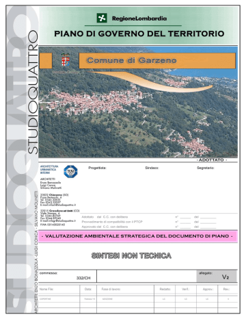 - ADOTTATO Progettista: Adottato Sindaco: Segretario: dal C.C. con delibera n° ______ del _________ Approvato dal C.C. con delibera n° ______ del _________ Provvedimento di compatibilità con il PTCP n° ______ del _________ - VALUTAZIONE AMBIENTALE STRATEGICA DEL DOCUMENTO DI PIANO - SINTESI NON TECNICA commessa: allegato: 332/CH Nome File: Data: COPERTINE Febbraio '15 Fase di lavoro: ADOZIONE Redatto: LC Verif.: LC Approv.: LC V2 Rev.: 0 PGT – COMUNE DI GARZENO - Valutazione ambientale strategica del documento di piano - VALUTAZIONE AMBIENTALE STRATEGICA DEL PGT DI GARZENO (COMO) - SINTESI NON TECNICA - 1. INQUADRAMENTO GENERALE Il territorio del Comune di Garzeno è situato in provincia di Como, nella Comunità Montana Valli del Lario e del Ceresio, il territorio comunale è interamente montano, collocato ad un’altitudine che va dai 500 mt. slm della frazione Catasco, fino ai 2.245 mt. slm del Pizzo di Gino , e ai 2.100 mt. slm del Monte Bregagno, le cui cime fanno da corona alla parte alta del territorio comunale. La valle Albano è percorsa dall’asse dell’omonimo torrente e si colloca tra il Lago di Como e lo spartiacque con la Val Morobbia, il suo territorio confina con le valli del Liro e la Val Cavargna . In questa vallata sono dislocati tre piccoli comuni, abitati complessivamente da circa 1.800 residenti. I paesi si snodano lungo la strada che da Dongo giunge a Garzeno : Stazzona (500 m. slm. circa ), Germasino (570 m s.l.m. circa ), e Garzeno (650 m s.l.m. circa ); attorniati da splendide montagne che conferiscono al paesaggio un aspetto aspro e austero. Il nucleo di Garzeno sorge a mezza costa a 600 m. d'altitudine sul versante sud della valle Albano, appena più a valle del capoluogo, a 500 m. d'altitudine sorge la frazione di Catasco, unita al capoluogo con una tortuosa strada a tornanti. I nuclei di Catasco e Garzeno sono le sole località del comune abitate tutto l’anno. Garzeno conta al 31/12/2010, 862 abitanti ed una superficie territoriale di 29,08 Kmq per una densità abitativa di 29,64 abitanti per chilometro quadrato. L’entità della popolazione dal 2005 al 2010 è in calo lento ma costante , passando da 947 a 862 abitanti. In Fig.1.1 è riportata la distribuzione percentuale per fasce d’età nel comune di Garzeno. Popolazione residente totale per classe di età. Totali al 1.1. 2011 Istat 0-5 6-10 13106 37 22 CLASSI DI ETA' 11-14 15-19 20-24 25-29 14 33 49 34 30-59 359 60-64 65 e + Totale 68 246 862 Fig.1.1 – Distribuzione per fasce di età della popolazione STUDIOQUATTRO _ Sintesi non tecnica- Rev 0 Pag. 1 di 11 PGT – COMUNE DI GARZENO - Valutazione ambientale strategica del documento di piano - Al gennaio 2011 la popolazione di oltre 60 anni rappresenta oltre 1/3del totale, confermando un dato simile a tutti i comuni del territorio della Valle. Anche il numero delle famiglie anagrafiche è in costante calo passando dalle 434 del 2001 alle 390 del 2010, con numero medio di componenti da 2,37 a 2,21 . Dal 2001 al 2010 la popolazione è diminuita del 16,31%. La parte più elecata del territorio del comune di Garzeno, confina con Parco Locale di Interesse Sovracomunale (PLIS) della valle Albano che icade in territorio di Germasino. STUDIOQUATTRO _ Sintesi non tecnica- Rev 0 Pag. 2 di 11 PGT – COMUNE DI GARZENO - Valutazione ambientale strategica del documento di piano - 2. QUADRO AMBIENTALE ATTUALE È stato innanzi tutto descritto il sistema ambientale nelle sue condizioni attuali, evidenziando i livelli di qualità delle sue componenti più rilevanti e individuandone eventuali criticità. L’obiettivo primario della pianificazione deve essere, come esplicitato dalle Direttive europee e dalla normativa nazionale e regionale, quello dello sviluppo sostenibile e, quindi, quello di un miglioramento della qualità della vita e dei servizi nel rispetto della qualità ambientale, per la quale si deve mirare, ove possibile, ad un miglioramento, senza accettare, in nessun caso, un peggioramento. In generale, nel territorio di Garzeno non sono presenti rilevanti fonti di emissioni inquinanti in atmosfera e le concentrazioni di inquinanti rilevate nella stazione ARPA più prossima al comune (Colico) sono per lo più compatibili con gli standard di legge (D.Lgs. 155/2010). Le emissioni provenienti dagli autoveicoli che transitano sulla strada provinciale e dagli usi domestici degli edifici civili sono da considerare elementi secondari di inquinamento. Inoltre, l’ambiente montano con la rilevante presenza di patrimonio naturalistico e la circolazione delle masse d’aria influenzata dalla morfologia del territorio, contribuiscono a mantenere una buona qualità complessiva dell’aria. Nel territorio comunale scorre il torrente l’Albano con diversi piccoli affluenti laterali. Come per la maggior parte dei corsi d’acqua della porzione settentrionale della provincia di Como, nell’Albano la qualità delle acque non sembra presentare particolari problemi, mentre si rilevano alterazioni della morfologia degli alvei e significative interruzioni della continuità ecologica fluviale. Per il torrente Albano il Piano ittico provinciale riscontra alterazioni della morfologia degli alvei e significative interruzioni della continuità ecologica fluviale. Le acque di pregio ittico come classificate dal Piano ittico provinciale sono : corso principale dalle sorgenti alla diga della Reggea, Lami Rosso dalle sorgenti alla presa Edison, Lami di Marnotto dalle sorgenti alla presa Edison, Lami di Moredina, Valle Bedolina, Valle di Lumia, Valle del Dosso, Valle di Brenzeglio, Valle di Gromo, Valle di Gino o Lami delPozzo, Valle dei Dosseli Il tratti classificati come “Acque di pregio ittico potenziale” sono: Torrente Albano, dalla diga della Reggea alla foce in lago Valle di Marnotto, dalla presa Edison alla confluenza nell’Albano Per tale categoria di acque le alterazioni morfologiche comportano impatti significativi sulla qualità degli habitat acquatici. I princ