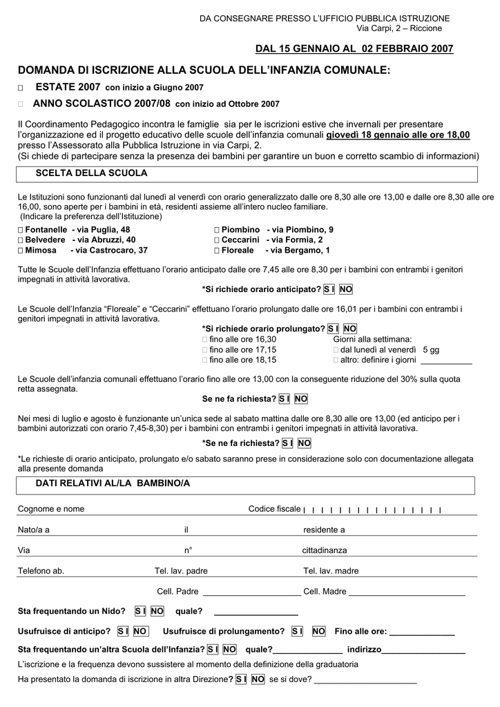 DA CONSEGNARE PRESSO L’UFFICIO PUBBLICA ISTRUZIONE Via Carpi, 2 – Riccione DAL 15 GENNAIO AL 02 FEBBRAIO 2007 DOMANDA DI ISCRIZIONE ALLA SCUOLA DELL’INFANZIA COMUNALE: ESTATE 2007 con inizio a Giugno 2007 ANNO SCOLASTICO 2007/08 con inizio ad Ottobre 2007 Il Coordinamento Pedagogico incontra le famiglie sia per le iscrizioni estive che invernali per presentare l’organizzazione ed il progetto educativo delle scuole dell’infanzia comunali giovedì 18 gennaio alle ore 18,00 presso l’Assessorato alla Pubblica Istruzione in via Carpi, 2. (Si chiede di partecipare senza la presenza dei bambini per garantire un buon e corretto scambio di informazioni) SCELTA DELLA SCUOLA Le Istituzioni sono funzionanti dal lunedì al venerdì con orario generalizzato dalle ore 8,30 alle ore 13,00 e dalle ore 8,30 alle ore 16,00, sono aperte per i bambini in età, residenti assieme all’intero nucleo familiare. (Indicare la preferenza dell’Istituzione) Fontanelle - via Puglia, 48 Belvedere - via Abruzzi, 40 Mimosa - via Castrocaro, 37 Piombino - via Piombino, 9 Ceccarini - via Formia, 2 Floreale - via Bergamo, 1 Tutte le Scuole dell’Infanzia effettuano l’orario anticipato dalle ore 7,45 alle ore 8,30 per i bambini con entrambi i genitori impegnati in attività lavorativa. *Si richiede orario anticipato? S I NO Le Scuole dell’Infanzia “Floreale” e “Ceccarini” effettuano l’orario prolungato dalle ore 16,01 per i bambini con entrambi i genitori impegnati in attività lavorativa. *Si richiede orario prolungato? S I NO fino alle ore 16,30 Giorni alla settimana: fino alle ore 17,15 dal lunedì al venerdì 5 gg fino alle ore 18,15 altro: definire i giorni ___________ Le Scuole dell’infanzia comunali effettuano l’orario fino alle ore 13,00 con la conseguente riduzione del 30% sulla quota retta assegnata. Se ne fa richiesta? S I NO Nei mesi di luglio e agosto è funzionante un’unica sede al sabato mattina dalle ore 8,30 alle ore 13,00 (ed anticipo per i bambini autorizzati con orario 7,45-8,30) per i bambini con entrambi i genitori impegnati in attività lavorativa. *Se ne fa richiesta? S I NO *Le richieste di orario anticipato, prolungato e/o sabato saranno prese in considerazione solo con documentazione allegata alla presente domanda DATI RELATIVI AL/LA BAMBINO/A Cognome e nome Codice fiscale ן ן ן ן ן ן ן ן ן ן ן ן ן ן ן ן Nato/a a il residente a Via n° cittadinanza Telefono ab. Tel. lav. padre Tel. lav. madre Cell. Padre _____________________ Cell. Madre _________________________ Sta frequentando un Nido? S I NO Usufruisce di anticipo? S I NO quale? __________________ Usufruisce di prolungamento? S I Sta frequentando un’altra Scuola dell’Infanzia? S I NO NO Fino alle ore: ______________ quale?_______________ indirizzo__________________ L’iscrizione e la frequenza devono sussistere al momento della definizione della graduatoria Ha presentato la domanda di iscrizione in altra Direzione? S I NO se si dove? ______________________ STATO DI SALUTE DEL MINORE Cognome e nome del pediatra: ………………………………………………………………………………………………………… La certificazione in caso di disagio o handicap dovrà essere rilasciata dall’A.U.S.L. di competenza Segnalazione di eventuali notizie sullo stato di salute e/o presentazione di adeguata certificazione. …………………………………………………………………………………………… Diete speciali certificate dal Centro Allergologico o Universitario come da Regolamento sanitario dell’AUSL 40 - Riccione S I NO Se SI produrre certificazione e far riferimento alla Dott.ssa Calesini Serafina Dietista del Comune di Riccione-0541 428850 DATI RELATIVI AL NUCLEO FAMILIARE Il nucleo familiare residente nel Comune di Riccione risulta così composto: PADRE: Cognome e nome …………………………………………… data e luogo di nascita ……………………………….. MADRE: Cognome e nome …………………………………………… data e luogo di nascita ……………………………….. FRATELLI/SORELLE……………………… data di nascita …………………… nido/scuola/lavoro …………………..…….. …………………………………… data di nascita ……………………nido/scuola /lavoro …………………………. ……………………………………... data di nascita ……………………nido/scuola/lavoro ……………………..……. ALTRI CONVIVENTI - nome, cognome e grado di parentela ………………………………………………………………………………………………………………………………….. In caso di assenza dal nucleo familiare di un genitore e’ richiesta la documentazione (es: separazione o divorzio) DATI RELATIVI ALL’ABITAZIONE Dimensioni dell’abitazione del nucleo familiare: Fino a 20 mq di superficie per componente del nucleo familiare Superficie procapite superiore a 20 e fino a 30 mq Superficie procapite superiore a 30 e fino a 40 mq Superficie procapite superiore a 40 e fino a 50 mq Superficie procapite superiore a 50 mq N.B. Per superficie si intende quella convenzionalmente soggetta alla tassa dei rifiuti solidi urbani (TARSU ex RSU) Categoria catastale dell’immobile abitato dal nucleo familiare: categoria catastale A1 - A7 - A8 - A11 categoria catastale A2 categoria catastale A3 categoria catastale A4 categoria catastale A5 – A6 N.B. Per immobili appartenenti ad altre categorie catastali non sarà assegnato alcun punteggio. Anche in caso di locazione o comodato ad uso gratuito valgono le stesse categorie. DATI RELATIVI AL LAVORO O STUDIO DELLA MADRE Cognome e nome ______________________________________ SCHEDA ANAGRAFICA I dati di questa sezione vanno sempre compilati anche nei casi di assenza del genitore dal nucleo familiare (escluso il decesso) Nata a _______________________ il _____________