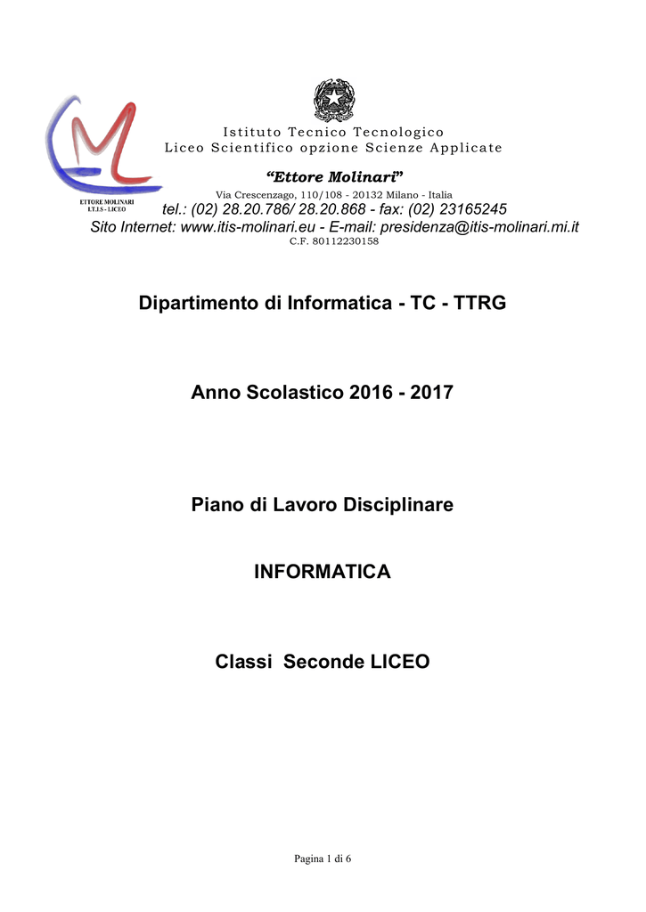 Istituto Tecnico Tecnologico Liceo Scientifico opzione Scienze Applicate “Ettore Molinari” Via Crescenzago, 110/108 - 20132 Milano - Italia tel.: (02) 28.20.786/ 28.20.868 - fax: (02) 23165245 Sito Internet: www.itis-molinari.eu - E-mail: [email protected] C.F. 80112230158 Dipartimento di Informatica - TC - TTRG Anno Scolastico 2016 - 2017 Piano di Lavoro Disciplinare INFORMATICA Classi Seconde LICEO Pagina 1 di 6 PROGRAMMAZIONE DISCIPLINARE SCIENZE E TECNOLOGIE APPLICATE 1 - Le Reti e Internet: la struttura e i servizi della rete Internet. Finalità: fornire agli studenti il concetto di rete di elaboratori, di condivisione di risorse e di problematiche relative alla comunicazione tra sistemi di comunicazione. Saper sviluppare un sito con HTML, CSS. Competenze: Al termine dell’unità l’allievo è in grado di: - Conosce la struttura della rete Internet - Sa classificare una rete in base alla sua estensione e alla sua topologia - Sa sfruttare i principali servizi offerti dalla rete Internet in maniera produttiva e consapevole Prerequisiti: Conoscenza dei sistemi Contenuti: -Dalla rete di terminali alle reti di elaboratori. -Panoramica su Internet: modello client-server, i protocolli, l’URL, indirizzi numerici e indirizzi mnemonici, il DNS, i domini. -Connessione ad Internet tramite rete commutata, ISDN e ADSL. -I principali servizi di Internet: il WWW e i motori di ricerca -La posta elettronica e il trasferimento di file 2 – Web Design(*) Finalità: realizzare semplici pagine web. Competenze: Al termine dell’unità l’allievo è in grado di: - costruire una pagina web. - utilizzare un motore di ricerca Pagina 2 di 6 - Sa sfruttare i principali servizi offerti dalla rete Internet in maniera produttiva e consapevole Prerequisiti: Conoscenza metodologie di progettazione Capacità logiche Contenuti: -Il linguaggio HTML -Creazione di pagine web mediante i principali tag html. -Progettare e pubblicare un sito web. -CSS -Integrare un sito con altre componenti: dbms, e-mail, news,… -Netiquette 3 - Uso di un linguaggio di programmazione (*) Finalità: abituare gli alunni ad analizzare e a formalizzare i problemi tramite la costruzione di modelli, a ricercare algoritmi risolutivi e a descriverli tramite pseudolinguaggio e strumenti specifici come i flow-chart; far acquisire una precisa metodologia di lavoro finalizzata alla precisione e al rigore; avvicinare agli allievi alla programmazione di tipo procedurale, utilizzando un linguaggio strutturato per sviluppare le capacità progettuali e le facoltà logiche; far cogliere la trasversalità dell’informatica. Competenze: Al termine dell’unità l’allievo è in grado di: 1. Conoscere le tipologie dei linguaggi, essere in grado di astrarre e costruire modelli 2. Formulare e comprendere e risolvere i problemi 3. Sa rappresentare un algoritmo risolutivo utilizzando uno pseudolinguaggio e diagrammi di 4. Flusso applicando i costrutti della programmazione strutturata 5. Conoscere l’ambiente di programmazione e sapersi muovere. 6. Utilizza correttamente i tipi di dati, le variabili e le costanti, gli operatori, le espressioni, le strutture di controllo e le strutture iterative. Pagina 3 di 6 7. individuare soluzioni ai problemi indipendentemente da uno specifico linguaggio di programmazione (algoritmi); 8. Costruire un programma funzionante in uno specifico linguaggio di programmazione rispettandone la relativa sintassi e utilizzando le principali strutture di controllo 9. Scrivere, compilare, correggere ed eseguire programmi Prerequisiti: nessuno Contenuti: L’analisi del problema Definizione di algoritmo Rappresentazione dell’algoritmo tramite diagrammi di flusso e pseudolinguaggio Le costanti, le variabili e la loro tipologia; la dichiarazioni di costanti e variabili Le istruzioni di assegnamento, di input e output Le istruzioni di selezione a una via e a due vie, la selezione multipla Le istruzioni di iterazione pre-condizionale, post-condizionale ed enumerativa 4– Teoria dei sistemi ed Automi. Finalità: far capire agli studenti l’importanza e le applicazioni dei sistemi (caratteristiche, a catena aperta e chiusa, classificazione e modelli) Competenze: Al termine dell’unità l’allievo è in grado di: - costruire e rappresentare semplici automi tramite il diagramma a stati e le tabelle di transizione. - essere in grado di realizzare un automa Prerequisiti: matematica ed informatica di base Contenuti: - Il processo di astrazione. - i tipi di modello e loro classificazione. - Gli automi: definizione e caratteristiche. - rappresentazione di automi Pagina 4 di 6 - diagramma di stati e tabelle di transizione. 5 - LABORATORIO Competenze: Tutte le attività sono contestuali allo svolgimento delle unità di apprendimento menzionate in precedenza Obiettivi: Utilizzare correttamente strumentazione elettronica di base e software di simulazione Saper usare in modo corretto la sintassi di un linguaggio di programmazione Essere in grado di codificare gli algoritmi e di validarli con il computer effettuando le necessarie correzioni Realizzare programmi in C o Scratch Progettare e realizzare pagine HTML Prerequisiti: conoscere i fondamenti di programmazione strutturata, le strutture di controllo, i dati strutturati, i sottoprogrammi saper realizzare algoritmi saper utilizzare correttamente le strutture di controllo saper utilizzare dati semplici e strutturati I principali tag html Contenuti: L'ambiente Dev-C (Windows) Struttura di un programma C Implementazione degli algoritmi studiati e assegnati come compiti in C usando le principali strutture di controllo. Realizzazione di pagine web. Ambiente Scratch (su tablet o Pc) Implementazione di algoritmi usando le principali strutture di controllo Realizzazione di pagine Web obiettivi minimi Gli argomenti segnalati con (*) riguardano gli obiettivi minimi di conoscenze e competenze che gli alunni devono acquisire al termine dell’anno scolastico. Pagina 5 di 6 METODOLOGIA DI LAVORO Lezioni
