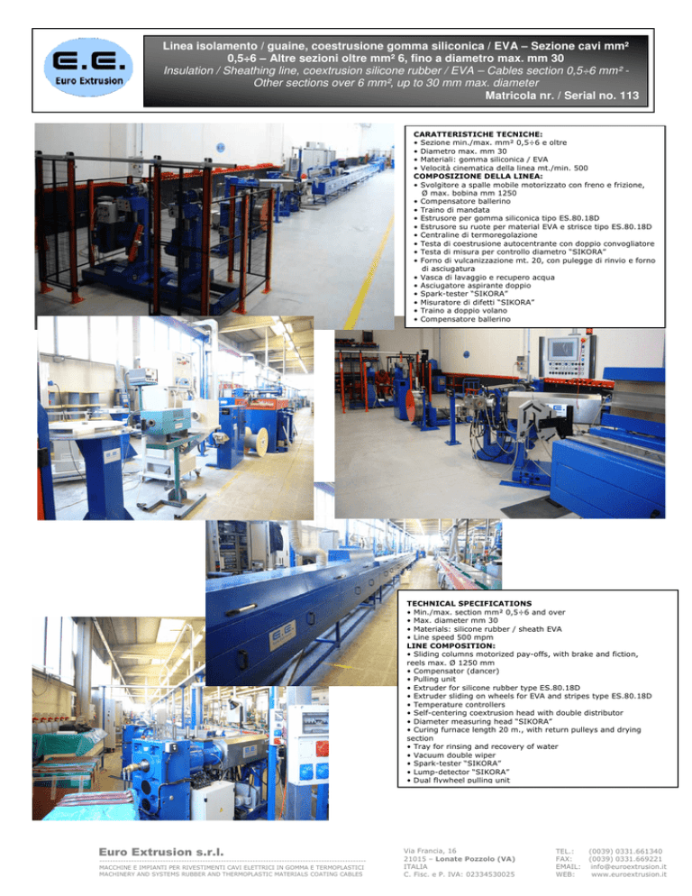 Linea isolamento / guaine, coestrusione gomma siliconica / EVA – Sezione cavi mm² 0,5÷6 – Altre sezioni oltre mm² 6, fino a diametro max. mm 30 Insulation / Sheathing line, coextrusion silicone rubber / EVA – Cables section 0,5÷6 mm² Other sections over 6 mm², up to 30 mm max. diameter Matricola nr. / Serial no. 113 5/6#787&779:#;' 537'#7&77 5!';<#77;#8 5;#'=7'>;;;7'87 5/?#;<'#@;;7#A;7#'#66'##"#"6# B7&A#A77 5#7@'#A;;# 5#>7>' 5'%#@<#77;#'@#/C C3 5'%#%%#'@7';''@#/C C3 5';>'7#<#;6# 5'>#'%#%'#''#>#@@##?#<;'# 5'>7%@#'#;;#>7'#D/E1.F 5##>?%;666#7'#@%;<<>?#"## >%<'% 5>;?<<#%@#G% 5%<'#@'>#@@# 5/@H+''D/E1.F 5!%'#>>"''D/E1.F 5#>#@@#?#;# 5#7@'#A;;# 5!87&'#779:>#? 5!&>7'77 5!';;#%AA8I'I 5@>7@7 5/;><#;%77#'#6>@J+#""*'IAH>"'# ;7&B 77 5#7@'#> 5%;;<%' 5&'%>"#;#%AA'J@/C C3 5&'%>;><#*I;"#>'@'J@/C C3 57@'%#'#;; 5/;"+'<#&'%#I>*'I>#%A;>'A%'# 537'7%<I>D/E1.F 5%<"%;<'I7*'I'%@%;;J>>J< '# 5J"#<>#?J#"*' 5%%7>#%A;*@ 5/@H+''D/E1.F 5%7@+>''#D/E1.F 53%;";J*I;@%;;<%' +++++++++++++++++++++++++++++++++++++++++++++++++++++++++++++++++++++++++++++++++++++++++++++++++++++ !,-!-../!-.-01!!.!1/ !,-.2-3/2/!/.4)).-3,.!1/!./1-0)/ !"#$%#&'%#' () ***%#&'%#'