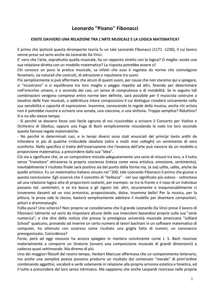 Leonardo "Pisano" Fibonacci ESISTE DAVVERO UNA RELAZIONE TRA L'ARTE MUSICALE E LA LOGICA MATEMATICA? Il primo che ipotizzò questa dirompente teoria fu un tale Leonardo Fibonacci (1171 -1230), il cui lavoro venne preso sul serio anche da Leonardo Da Vinci. E' vero che l'arte, soprattutto quella musicale, ha un rapporto stretto con la logica? O meglio: esiste una sua relazione diretta con un modello matematico? La risposta potrebbe essere si! Chi conosce un poco la pratica musicale, sa infatti che essa è regolata da norme che coinvolgono fenomeni, sia naturali che costruiti, di attrazione e repulsione tra suoni. Più semplicemente si può affermare che alcuni di questi suoni, per cause che non staremo qui a spiegare, si "incastrano" o si equilibrano tra loro meglio o peggio rispetto ad altri, finendo per determinare nell'orecchio umano, e a seconda dei casi, un senso di compiutezza o di instabilità. Se in seguito tali combinazioni vengono comprese entro norme ben definite, sarà possibile per il musicista costruire a tavolino delle frasi musicali, o addirittura intere composizioni il cui distìnguo risiederà unicamente nella sua sensibilità e capacità di espressione. Insomma, conoscendo le regole della musica, anche chi artista non è potrebbe riuscire a scrivere una sonata, una ciaccona, o una sinfonia. Troppo semplice? Riduttivo? Si e no allo stesso tempo. - Si perché se davvero fosse così facile ognuno di noi riuscirebbe a scrivere il Concerto per Violino e Orchestra di Sibelius, oppure una Fuga di Bach semplicemente miscelando le note tra loro secondo queste famose regole matematiche. - No perché in determinati casi, e in tempi diversi sono stati enunciati dei principi tanto arditi da infondere in più di qualche irriducibile idealista (oltre a molti miei colleghi) un sentimento di vero sconforto. Nello specifico si tratta dell'osservazione che l'essenza dell'arte può nascere da un modello o proporzione matematica, a prescindere dalla sua "Idea". Ciò sta a significare che, se un compositore miscela adeguatamente una serie di misure tra loro, e il tutto senza "transitare" attraverso la propria coscienza (intesa come vena artistica, emozione, sentimento), inevitabilmente il risultato finale sarà positivo sia dal punto della forma ma, (e sia) udite, udite, anche da quello artistico. Fu un matematico italiano vissuto nel "200, tale Leonardo Fibonacci il primo che giunse a questa conclusione. Egli osservò che il concetto di "bellezza" - nel suo significato più esteso - sottostava ad una relazione logica atta di proporzioni costanti, per esempio: se tra la fronte e il naso di un individuo passano tot. centimetri, e se tra bocca e gli zigomi tot. altri, sicuramente e inequivocabilmente ci troveremo davanti ad un viso armonico, proporzionato, dolce, insomma bello! Per la musica, per la pittura, la prosa vale lo stesso, basterà semplicemente adottare il modello per diventare compositori, pittori e drammaturghi. Follia pura? Uno scherzo? Non proprio se consideriamo che il grande Leonardo Da Vinci prese il lavoro di Fibonacci talmente sul serio da impostare alcune delle sue invenzioni basandosi proprio sulla sua "serie numerica"; e che dire della notizia che presso la prestigiosa università musicale americana "Julliard School" qualcuno, provando ad inserire un certo numero di lavori bachiani in un software matematico di computer, ha ottenuto con sorpresa come risultato una griglia fatta di numeri, un canovaccio preorganizzato. Coincidenza? Forse, però ad oggi nessuno ha ancora spiegato in maniera convincente come J. S. Bach riuscisse materialmente a comporre un Oratorio (ovvero una composizione musicale di grandi dimensioni) a cadenza quasi settimanale. Ma diremo di più. Uno dei maggiori filosofi del nostro tempo, Herbert Marcuse affermava che un componimento letterario, ma anche una semplice poesia possono produrre un risultato dal contenuto "morale" di prim'ordine combinando aggettivi, vocaboli e verbi solamente in relazione alla propria armonia estetica e fonetica, ed il tutto a prescindere dal loro senso intrinseco. Ma sappiamo che anche Leopardi ricercava nelle proprie 1 opere la proporzione, la fonia, la cifra. Ed il nostro giudizio? Difficile a dire. Saremmo troppo presuntuosi. Però osserviamo, e proprio osservando ci ricordiamo che qualcuno molto più importante di noi come Teddy Riley (uno dei maggiori compositori contemporanei) senza nessun dubbio afferma "lo sono come un costruttore di case, datemi gli elementi, le note che dosiderate e io compongo un'opera", sappiamo inoltre che il musicista cubano Leo Brouwer scrive i suoi celebri "Pajage" dedicandoli alla famosa "serie aurea" di Fibonacci. Fantasie? Disinformazione? Realtà artefatta? Chi può dirlo! Del resto è vero: ricondurre ogni opera d'arte, ogni melodia ad una serie di numeri è molto difficile da dimostrare, però quando Fibonacci ebbe l'intuizione correva l'anno 1112, ora siamo nel 2002 ed ancora se ne parla. Giorgio Tortora PROPORZIONI & FASCINO La bellezza? E' un teorema Marilyn perfetta, Lollo meglio della Schiffer. Autore: AMANDOLA GIAN PIERO ARGOMENTI: ANTROPOLOGIA E ETNOLOGIA, INCHIESTA NOMI: FIBONACCI LEONARDO LUOGHI: ITALIA NOTE: Criteri di bellezza e bruttezza L'ESTATE, con i bagnanti seminudi sparsi su tutte le spiagge, ci porta inesorabilmente a fare i conti con il corpo, e quindi con la bellezza (e la bruttezza, ovviamente). Conti nei quali la scienza non sembra possa aiutarci. No, la scienza non «capisce» la bellezza. Il computer non sa leggere l'attrazione di un volto, gli antropologi non possono individuare lo zigomo o la pupilla che incanta, non si possono fare banche dati, campionare le narici o gli incarnati che danno le maggiori armonie al volto. Infatti le due indagini iperscientifiche, informatizzate, che la rivista inglese «Nature» ha tentato qualche mese fa provano inequivocabilmente (la prima) che la bellezza umana è data dai caratteri «medi» della popolazione, e (la second