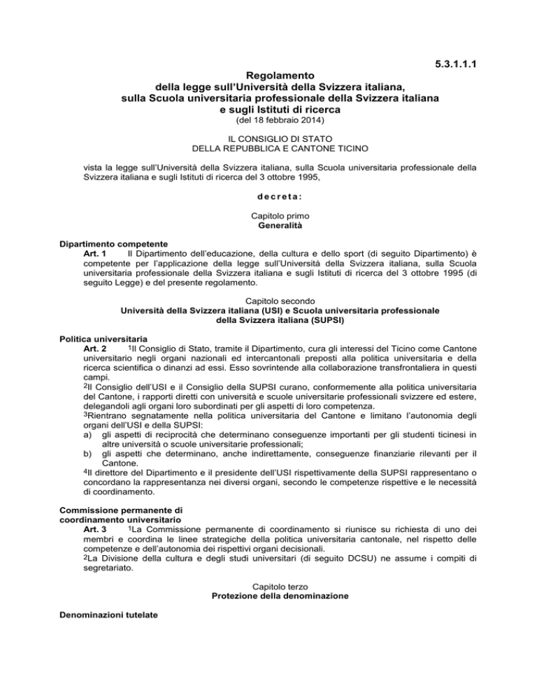 5.3.1.1.1 Regolamento della legge sull’Università della Svizzera italiana, sulla Scuola universitaria professionale della Svizzera italiana e sugli Istituti di ricerca (del 18 febbraio 2014) IL CONSIGLIO DI STATO DELLA REPUBBLICA E CANTONE TICINO vista la legge sull’Università della Svizzera italiana, sulla Scuola universitaria professionale della Svizzera italiana e sugli Istituti di ricerca del 3 ottobre 1995, decreta: Capitolo primo Generalità Dipartimento competente Art. 1 Il Dipartimento dell’educazione, della cultura e dello sport (di seguito Dipartimento) è competente per l’applicazione della legge sull’Università della Svizzera italiana, sulla Scuola universitaria professionale della Svizzera italiana e sugli Istituti di ricerca del 3 ottobre 1995 (di seguito Legge) e del presente regolamento. Capitolo secondo Università della Svizzera italiana (USI) e Scuola universitaria professionale della Svizzera italiana (SUPSI) Politica universitaria 1Il Consiglio di Stato, tramite il Dipartimento, cura gli interessi del Ticino come Cantone Art. 2 universitario negli organi nazionali ed intercantonali preposti alla politica universitaria e della ricerca scientifica o dinanzi ad essi. Esso sovrintende alla collaborazione transfrontaliera in questi campi. 2Il Consiglio dell’USI e il Consiglio della SUPSI curano, conformemente alla politica universitaria del Cantone, i rapporti diretti con università e scuole universitarie professionali svizzere ed estere, delegandoli agli organi loro subordinati per gli aspetti di loro competenza. 3Rientrano segnatamente nella politica universitaria del Cantone e limitano l’autonomia degli organi dell’USI e della SUPSI: a) gli aspetti di reciprocità che determinano conseguenze importanti per gli studenti ticinesi in altre università o scuole universitarie professionali; b) gli aspetti che determinano, anche indirettamente, conseguenze finanziarie rilevanti per il Cantone. 4Il direttore del Dipartimento e il presidente dell’USI rispettivamente della SUPSI rappresentano o concordano la rappresentanza nei diversi organi, secondo le competenze rispettive e le necessità di coordinamento. Commissione permanente di coordinamento universitario 1La Commissione permanente di coordinamento si riunisce su richiesta di uno dei Art. 3 membri e coordina le linee strategiche della politica universitaria cantonale, nel rispetto delle competenze e dell’autonomia dei rispettivi organi decisionali. 2La Divisione della cultura e degli studi universitari (di seguito DCSU) ne assume i compiti di segretariato. Capitolo terzo Protezione della denominazione Denominazioni tutelate Art. 4 Le denominazioni tutelate che necessitano di autorizzazione, inclusi i casi di declinazioni al plurale o al femminile, di utilizzo dei termini in nomi composti, di uso di termini omologhi o analoghi in altre lingue, sono le seguenti: a) università, universitario; b) accademia, accademico; c) ateneo; d) politecnico (sostantivo e aggettivo); e) alta scuola (o altre accezioni corrispondenti ai termini «Hochschule» oppure «haute école»); f) facoltà; g) campus, college. Effetti dell’autorizzazione 1È vietato usare le denominazioni tutelate senza autorizzazione da parte delle scuole e Art. 5 degli istituti che sul territorio cantonale offrono in proprio, attraverso terzi o per conto di terzi ed in forma completa o parziale, corsi di livello terziario volti all’ottenimento di titoli universitari (bachelor, master, dottorato). 2L’utilizzo senza autorizzazione delle denominazioni tutelate è precluso ai soggetti di cui al cpv. 1 nelle forme seguenti: a) nella definizione principale; b) nelle definizioni secondarie; c) nel testo che definisce lo scopo nell’iscrizione a Registro di commercio; d) negli atti ufficiali e nella comunicazione a terzi (pubblicazioni, internet ecc.). Autorizzazione provvisoria 1L’autorizzazione provvisoria è concessa dal Consiglio di Stato quando l’autorità di Art. 6 accreditamento o l’ente da essa delegato stabilisce l’entrata in materia dichiarando superato l’esame preliminare. 2L’autorizzazione provvisoria è valida al massimo per due anni e può venire rinnovata per giustificati motivi. A tal fine il titolare informa il Consiglio di Stato sullo stato della procedura di accreditamento. 3L’autorizzazione provvisoria è revocata se la decisione di accreditamento è negativa. 4L’autorizzazione provvisoria deve essere esplicitamente dichiarata come tale nella comunicazione a terzi secondo la formulazione indicata nella decisione del Consiglio di Stato. Autorizzazione definitiva 1L’autorizzazione definitiva è concessa dal Consiglio di Stato quando l’autorità di Art. 7 accreditamento ha concesso l’accreditamento istituzionale. 2L’autorizzazione definitiva ha validità fino alla scadenza del periodo di accreditamento e può essere rinnovata solo dopo comprovato rinnovo dell’accreditamento stesso. Titolarietà e procedura 1Le richieste di autorizzazione provvisoria o definitiva sono presentate da un soggetto Art. 8 giuridico titolare della scuola o dell’istituto. 2Esse non possono essere trasferite ad altro soggetto giuridico senza il consenso del Consiglio di Stato. 3Le richieste devono essere inviate alla DCSU corredate dei seguenti documenti: a) in caso di richiesta di autorizzazione provvisoria, la lettera di conferma di entrata in materia dell’autorità di accreditamento o dell’ente da essa delegato; b) in caso di richiesta di autorizzazione definitiva, la decisione di accreditamento dell’autorità di accreditamento; c) gli statuti e i regolamenti; d) la lista degli studenti iscritti e delle matricole per provenienza (Svizzera, Italia, altri Paesi) all’inizio dell’ultimo semestre autunnale; e) il numero di diplomi del precedente anno per tipologia (bachelor, master, dottorato). Obbligo di informare Art. 9 I titolari di un’autorizzazione provvisoria o definitiva sono responsabili della comunicazion