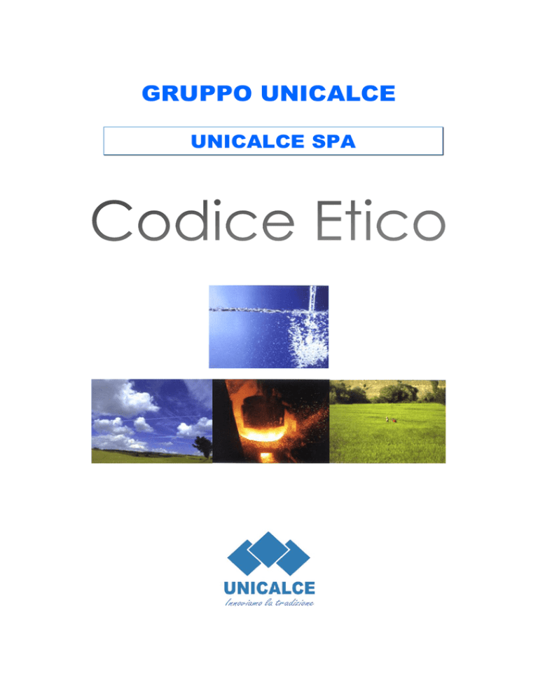 GRUPPO UNICALCE UNICALCE SPA INDICE Valori aziendali e adozione del Codice Etico pag. 3 Principi generali pag. 4 Attività del Gruppo pag. 5 Principi e norme di riferimento pag. 6 Rapporti con pubblici dipendenti, Pubbliche Amministrazioni e interlocutori privati pag. 7 Disciplina amministrativa degli appalti pubblici pag. 9 Disciplina della concorrenza pag. 11 Disciplina della concorrenza sleale pag. 13 Conflitto di interessi pag. 14 Tutela della riservatezza pag. 15 Tutela del lavoro pag. 16 Tutela dell’ambiente pag. 17 Tutela della privacy pag. 18 Rispetto della normativa in materia di tutela della incolumità e personalità individuale pag. 19 Comunicazioni sociali e illeciti in materia societaria pag. 20 Divieto di impedire controlli pag. 21 Divieto di ostacolare l’esercizio delle funzioni delle autorità pubbliche di vigilanza pag. 22 Divieto di compiere operazioni in pregiudizio dei creditori pag. 23 Rispetto del Codice Etico pag. 24 2 VALORI AZIENDALI E ADOZIONE DEL CODICE ETICO Il Gruppo Unicalce, nell’adempimento della sua attività sociale, persegue il raggiungimento dei propri obiettivi attraverso un’azione aziendale svolta nel rispetto della legalità e dei diritti fondamentali della persona, improntata a regole chiare e trasparenti e in sintonia con l’ambiente esterno e con gli obiettivi della comunità. Al fine di una tutela sempre più concreta dell’immagine positiva del Gruppo, UNICALCE Spa e le società da essa direttamente o indirettamente controllate ai sensi del disposto dell’art. 2359 Codice Civile, hanno deciso di adottare un Codice Etico che, in linea con i principi di lealtà e onestà di comportamento che sono ad esse già propri, è volto a regolare attraverso norme comportamentali l’attività aziendale del Gruppo. Il Codice Etico del Gruppo Unicalce, individua pertanto i valori aziendali ed evidenzia l’insieme dei diritti e dei doveri di tutti coloro che, a qualsiasi titolo, operano nel Gruppo indicando le norme di comportamento da osservare nei confronti di tutti gli interlocutori quali gli azionisti, i dipendenti, i collaboratori, i consulenti, gli agenti, i partners, la Pubblica Amministrazione e, in generale, tutti i soggetti legati da un rapporto di collaborazione con il Gruppo Unicalce. L’adozione del presente Codice è espressione di un contesto aziendale nel quale obiettivo primario è quello di soddisfare le necessità e le aspettative degli interlocutori tutti del Gruppo Unicalce attraverso un elevato standard di professionalità e il divieto di quelle condotte che si pongono in contrasto con le disposizioni di legge e con i valori che il Gruppo Unicalce intende promuovere. Ogni dipendente, collaboratore e portatore d’interessi del Gruppo Unicalce, si dovrà pertanto attenere alle regole contenute nel Codice Etico che, unitamente alle previsioni normative in materia sia civile che penale, rappresentano l’insieme dei diritti, dei doveri e delle responsabilità agli stessi attribuiti. In nessun caso, il perseguimento dell’interesse o del vantaggio del Gruppo Unicalce, può giustificare una condotta non in linea con il presente Codice. Il Gruppo Unicalce assicura a tutti i dipendenti e collaboratori una adeguata informativa e sensibilizzazione in relazione al contenuto del Codice Etico e alle problematiche ad esso attinenti. 3 PRINCIPI GENERALI Il Gruppo Unicalce ha come principio imprescindibile il rispetto di leggi e regolamenti vigenti in tutti i Paesi in cui esso opera. Ogni dipendente, collaboratore e chiunque abbia rapporti con il Gruppo Unicalce deve impegnarsi al rispetto delle leggi vigenti in ogni Paese in cui lo stesso opera, nonché delle prescrizioni contenute in questo documento e nei regolamenti interni. Tale impegno dovrà valere anche per i consulenti, fornitori, clienti e per chiunque abbia rapporti con il Gruppo Unicalce. E’ essenziale che ciascuno di coloro che lavorano o che lavoreranno in futuro in nome e per conto del Gruppo Unicalce siano essi amministratori, responsabili, dipendenti, consulenti esterni o partner commerciali, prima di iniziare a svolgere la propria attività, prenda visione delle presenti istruzioni in quanto le stesse contengono un sommario delle normative applicabili nelle varie materie nel seguito indicate. Nel presente Codice Etico vengono inoltre riportate, situazione per situazione, considerazioni e raccomandazioni pratiche relativamente ai comportamenti da adottarsi o da evitarsi a seconda dei casi. La mancata conoscenza delle leggi non esonera da alcuna responsabilità. I dipendenti e i collaboratori devono essere a conoscenza delle leggi e dei comportamenti conseguenti; qualora esistessero dei dubbi su come procedere, il Gruppo Unicalce dovrà informare adeguatamente i propri dipendenti e collaboratori. 4 ATTIVITÀ DEL GRUPPO Tutte le azioni e le operazioni del Gruppo Unicalce devono essere legittime e devono avere una registrazione adeguata. In particolare, deve essere possibile la verifica del processo di decisione, autorizzazione e di svolgimento delle operazioni stesse. Per ogni operazione vi deve essere un adeguato supporto documentale che consenta di procedere, in ogni momento, all’effettuazione di controlli che attestino le caratteristiche e le motivazioni dell’operazione medesima e individuino chi ha autorizzato, effettuato, registrato e verificato la stessa. La predisposizione di qualsiasi documentazione, ivi compresa quella contabile, va effettuata con chiarezza e trasparenza. I dati relativi andranno riportati in modo accurato, obiettivo e veritiero. I dipendenti e i soggetti che agiscono per conto del Gruppo Unicalce devono operare, anche negli acquisti, con diligenza e nel rispetto dei principi di liceità, economicità, qualità e correttezza. 5 PRINCIPI E NORME DI RIFERIMENTO L’onestà rappresenta il principio fondamentale di tutte le attività del Gruppo Unicalce e costituisce elemento imprescindibile della gestione aziendale. In nessun caso il perseguime