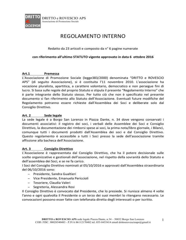 DRITTO e ROVESCIO APS Associazione di Promozione Sociale REGOLAMENTO INTERNO Redatto da 23 articoli e composto da n° 6 pagine numerate con riferimento all’ultimo STATUTO vigente approvato in data 6 ottobre 2016 Art.1 Premessa L’Associazione di Promozione Sociale (legge383/2000) denominata “DRITTO e ROVESCIO APS” (di seguito Associazione), si è costituita l'11 novembre 2010. L’associazione ha vocazione pluralista, apartitica, a carattere volontario, democratico e non persegue fini di lucro. Si basa sulle regole del proprio Statuto e stipula il presente “Regolamento Interno” che è parte integrante dello Statuto stesso. Per tutto ciò che non è specificato nel presente documento si fan riferimento allo Statuto dell’Associazione. Eventuali future modifiche del Regolamento potranno essere richieste dall'Assemblea dei Soci e deliberate solo dal Consiglio Direttivo. Art. 2 Sede legale La sede legale è a Borgo San Lorenzo in Piazza Dante, n. 34 dove vengono conservati i documenti associativi: il registro dei soci, i verbali delle Assemblee dei Soci e Consiglio Direttivo, la documentazione dei rimborsi spese ai soci, la prima nota/libro giornale, i Bilanci, comunque tutti i documenti prodotti dall'Assemblea dei soci e dal Consiglio Direttivo. Questo regolamento è accessibile a tutti i Soci presso la sede dell'associazione tramite affissione alla bacheca dell’Associazione. Art. 3 Consiglio Direttivo L’Associazione è rappresentata dal Consiglio Direttivo, che ha il potere decisionale sulle scelte organizzative e gestionali dell’associazione, nel rispetto della sovranità dello Statuto e dell’assemblea dei Soci, e se ne fa carico. I Soci del Consiglio Direttivo nominati al 05/10/2016 e approvati dall’Assemblea straordinaria del 06/10/2016 sono: − Presidente, Sandra Gualtieri − Vice Presidente, Emanuela Periccioli − Tesoriere, Claudia Valeri − Segreteria, Alessandra Rosi Il Consiglio Direttivo è convocato dal Presidente, che lo presiede. Si riunisce almeno 4 volte l'anno e ogni qualvolta il Presidente o un terzo dei suoi membri lo ritengano necessario. Le convocazioni possono esser fatte con telefonata diretta degli interessati o per iscritto. DRITTO e ROVESCIO APS sede legale Piazza Dante, n.34 – 50032 Borgo San Lorenzo COD. FISC. 90028540483 - P.IVA 06112170482 tel. 055-8453414 email [email protected] 1 DRITTO e ROVESCIO APS Associazione di Promozione Sociale Il Consiglio Direttivo è investito dei più ampi poteri per la gestione dell'Associazione, di conseguenza, onde realizzare il programma di attività, pone in essere ogni atto esecutivo necessario che deve essere avallato dal Presidente. Il Consiglio Direttivo, per adempiere alle sue funzioni, può avvalersi dell'opera di esperti consulenti che possono partecipare alle sue sedute senza diritto di voto. Il Consiglio è validamente costituito quando è presente almeno la metà più uno dei suoi membri con diritto di voto e delibera con le stesse modalità previste per l’Assemblea. Le deliberazioni del Consiglio Direttivo sono adottate a maggioranza semplice dei presenti; nelle votazioni palesi, in caso di parità, prevale il voto del Presidente. Non è ammesso il voto per delega. I verbali e le deliberazioni sono redatte a cura del Segretario con sua firma e quella del Presidente.I componenti del Consiglio Direttivo non ricevono alcun emolumento o remunerazione, ma solo un rimborso delle spese sostenute nello svolgimento delle attività elencate nello statuto nell’art. 3 “Finalità e attività”. Art. 4 Riunioni telematiche del Consiglio Direttivo Le riunioni per via telematica verranno effettuate tramite i sistemi informatici che il Consiglio Direttivo riterrà opportuni (tipo Skype, Facebook, ecc). Il verbale steso durante le riunioni dal segretario deve essere firmato dal Presidente e riportato in forma cartacea nell'archivio dell'Associazione. Art. 5 Soci Il numero dei Soci è illimitato. Può diventare Socio chiunque si riconosca nel presente statuto ed abbia compiuto il diciottesimo anno di età, indipendentemente dalla propria appartenenza politica o religiosa, sesso, cittadinanza, appartenenza etnica e professione. L'aspirante Socio è tenuto a prendere visione e ad accettare il contenuto dello statuto, del regolamento interno e ad accettare il pagamento della quota d’iscrizione e dare autorizzazione al trattamento dei dati personali per le sole finalità associative. Art. 6 Iscrizione dei Soci Per diventare “Soci ordinari” è possibile iscriversi all'Associazione partecipando ad una delle attività proposte dalla stessa, come persone fisiche, e occorre compilare l’apposito modulo e consegnarlo o indirizzarlo alla sede dell'Associazione, con firma e data, indicante le proprie generalità (nome, cognome, data di nascita, residenza, cod. fiscale, telefono, email). La domanda di ammissione a Socio deve essere presentata al Consiglio Direttivo e quest’ultimo deciderà sull’accoglimento o il rigetto dell’ammissione dell’aspirante, oppure nel caso in cui la domanda viene accolta alla presenza di almeno 2/3 dei componenti del Consiglio Direttivo si procede alla diretta valutazione di accettazione apponendo le firme sopra la domanda e con pagamento diretto della quota associativa. L’Associazione si riserva la possibilità di raccogliere le domande di ammissione anche durante eventi e manifestazioni nelle quali verrà predisposto un punto di raccolta con le domande di ammissione a socio. Il Socio è tenuto a comunicare al Consiglio Direttivo variazioni delle proprie generalità. DRITTO e ROVESCIO APS sede legale Piazza Dante, n.34 – 50032 Borgo San Lorenzo COD. FISC. 90028540483 - P.IVA 06112170482 tel. 055-8453414 email [email protected] 2 DRITTO e ROVESCIO APS Associazione di Promozione Sociale Art. 7 Quota associativa La quota associativa dà diritto a partecipare alle attività dell’Associazione. Si rilascia ricevuta come quietanza e la tessera associativa. Il rapporto a