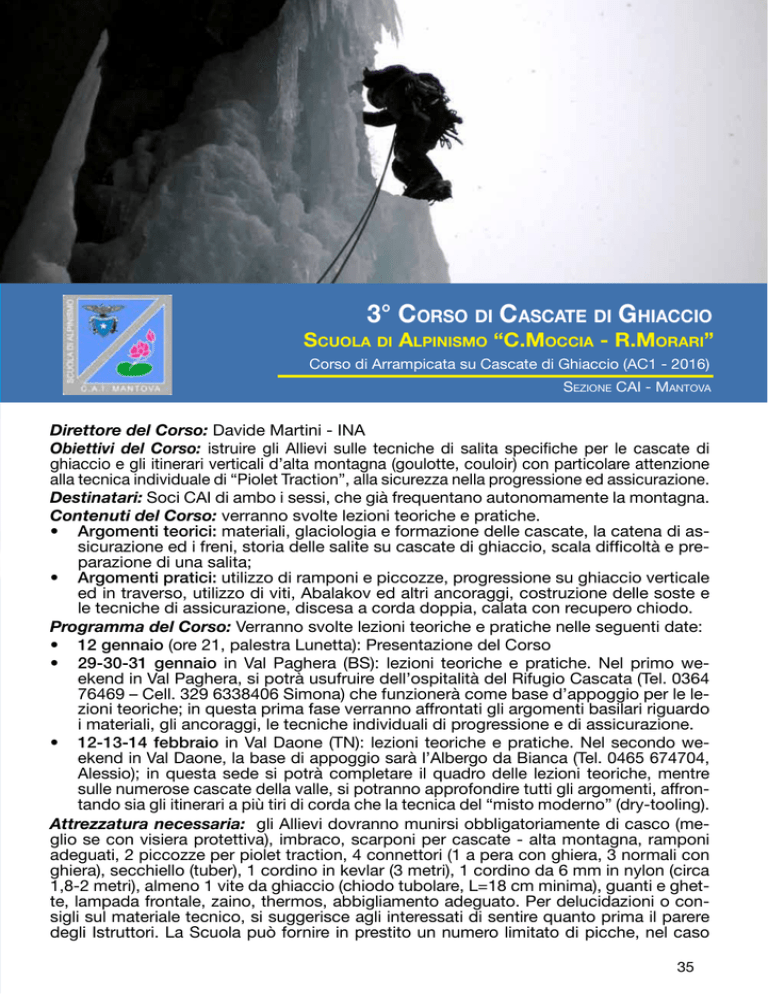 3° corso di cascate di ghiaccio scuola di alpinismo “c.moccia - r.morari” Corso di Arrampicata su Cascate di Ghiaccio (AC1 - 2016) sezIone CAI - mAntovA Direttore del Corso: Davide Martini - INA Obiettivi del Corso: istruire gli Allievi sulle tecniche di salita speciiche per le cascate di ghiaccio e gli itinerari verticali d’alta montagna (goulotte, couloir) con particolare attenzione alla tecnica individuale di “Piolet Traction”, alla sicurezza nella progressione ed assicurazione. Destinatari: Soci CAI di ambo i sessi, che già frequentano autonomamente la montagna. Contenuti del Corso: verranno svolte lezioni teoriche e pratiche. • Argomenti teorici: materiali, glaciologia e formazione delle cascate, la catena di assicurazione ed i freni, storia delle salite su cascate di ghiaccio, scala dificoltà e preparazione di una salita; • Argomenti pratici: utilizzo di ramponi e piccozze, progressione su ghiaccio verticale ed in traverso, utilizzo di viti, Abalakov ed altri ancoraggi, costruzione delle soste e le tecniche di assicurazione, discesa a corda doppia, calata con recupero chiodo. Programma del Corso: Verranno svolte lezioni teoriche e pratiche nelle seguenti date: • 12 gennaio (ore 21, palestra Lunetta): Presentazione del Corso • 29-30-31 gennaio in Val Paghera (BS): lezioni teoriche e pratiche. Nel primo weekend in Val Paghera, si potrà usufruire dell’ospitalità del Rifugio Cascata (Tel. 0364 76469 – Cell. 329 6338406 Simona) che funzionerà come base d’appoggio per le lezioni teoriche; in questa prima fase verranno affrontati gli argomenti basilari riguardo i materiali, gli ancoraggi, le tecniche individuali di progressione e di assicurazione. • 12-13-14 febbraio in Val Daone (TN): lezioni teoriche e pratiche. Nel secondo weekend in Val Daone, la base di appoggio sarà l’Albergo da Bianca (Tel. 0465 674704, Alessio); in questa sede si potrà completare il quadro delle lezioni teoriche, mentre sulle numerose cascate della valle, si potranno approfondire tutti gli argomenti, affrontando sia gli itinerari a più tiri di corda che la tecnica del “misto moderno” (dry-tooling). Attrezzatura necessaria: gli Allievi dovranno munirsi obbligatoriamente di casco (meglio se con visiera protettiva), imbraco, scarponi per cascate - alta montagna, ramponi adeguati, 2 piccozze per piolet traction, 4 connettori (1 a pera con ghiera, 3 normali con ghiera), secchiello (tuber), 1 cordino in kevlar (3 metri), 1 cordino da 6 mm in nylon (circa 1,8-2 metri), almeno 1 vite da ghiaccio (chiodo tubolare, L=18 cm minima), guanti e ghette, lampada frontale, zaino, thermos, abbigliamento adeguato. Per delucidazioni o consigli sul materiale tecnico, si suggerisce agli interessati di sentire quanto prima il parere degli Istruttori. La Scuola può fornire in prestito un numero limitato di picche, nel caso 35 contattare quanto prima il Direttore per la disponibilità. Iscrizioni: Le iscrizioni saranno limitate ad un massimo di 8 allievi e verranno accolte in ordine di presentazione. La quota complessiva d’iscrizione al corso comprende l’utilizzo del materiale alpinistico della Scuola, l’attestato di partecipazione, il distintivo della Scuola, le dispense ed il materiale didattico cartaceo consegnato; non comprende spese di trasferimento (viaggi), le spese di pernottamento e vitto presso i rifugi e tutti gli extra (es. bevande, spuntini, ecc.). Per iscriversi si dovrà compilare l’apposito modulo reperibile in Segreteria CAI, presso la palestra di Lunetta o scaricandolo dal sito www.caimantova.it o chiedendolo per e-mail al Direttore del Corso. I moduli correttamente compilati e accompagnati dalla caparra dovranno essere consegnati entro il 12 gennaio presso la palestra di Lunetta nelle serate di apertura (martedì) o inviati via mail al Direttore del Corso al seguente indirizzo: [email protected], in tal caso il versamento dovrà essere effettuato tramite boniico bancario intestato al Club Alpino Italiano Sezione di Mantova IBAN: IT56P0538711500000001098228 c/o Banca Popolare dell’Emilia Romagna, indicando come causale acconto “3° Corso di Cascate di Ghiaccio 2016” e dandone notizia nella mail. L’ammissione verrà confermata nella serata di presentazione dove dovrà essere perfezionata dal saldo immediato dell’intera quota d’iscrizione e dalla presentazione di Certiicato Medico di sana e robusta costituzione in corso di validità. Informazioni: per ulteriori informazioni rivolgersi a Davide Martini - 338 5346479. 36
