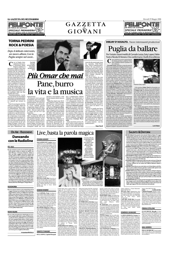 Giovedì 25 Maggio 2006 G A Z Z E T TA G I O VA N I TORNA PEDRINI ROCK & POESIA DEEJAY D’ASSALTO. Nuove interessanti produzioni Puglia da ballare Dopo il delicato intervento, un nuovo album.Con la Puglia sempre nel cuore... C on la Puglia letteralmente nel cuore, il bresciano Omar Pedrini pubblica il suo nuovo album a due anni di distanza dalla terribile avventura che ha rischiato di spezzare la sua vita. Una sera di primavera del 2004, infatti, quella che lui percepiva come una congestione, si rivelò un aneurisma all’aorta da operare nel giro di pochi minuti. Adesso Omar guarda avanti e pubblica il nuovo album Pane burro e medicine, un album maturo per un ragazzo che il 28 maggio compie 39 anni. Come sempre con Omar si parte da lontano, prima parlando delle sue due squadre del cuore. «Lasciamo perdere... La Juve è nel mezzo di una bufera addirittura inimmaginabile, il mio Brescia non ha centrato i playoff per tornare in A...». E poi il suo legame strettissimo con la Puglia. «Spero di scendere quest’estate, lo spero ardentemente. Non svelo certo un segreto se dico che considero la Puglia la mia seconda terra, uno dei miei luoghi del cuore. Tra Locorotondo e Cisternino c’è un trullo che degli amici mi hanno voluto dedicare e spero di passarci non solo qualche giorno ma una porzione un po’ più lunga di tempo. Colori ed aria della Puglia sono cose che non puoi dimenticare una Per l’estate i brani inediti di Corrado Lezza,Gaty Lopez,Fabio Tosti e Nicola Di Venere.Che confermano i livelli d’eccellenza Due belle immagini di Omar Pedrini fotografato da Alessandro Gerini Più Omar che mai Pane,burro la vita e la musica volta provati». Di concerti «veri» però per il momento non se ne parla. «I medici me l’hanno proibito tassativamente. Io vorrei salire sul palco, ma nulla da fare. Certo, qualche piccola comparsata, magari all’interno di un altro concerto, come ospite…Ma non voglio strafare, essere qui con voi è già stupendo». Omar Pedrini è nato nel 1967. «L’estate del 1967 fu la celeberrima Summer of Love che cambiò il mondo. Al grido di "mettete dei fiori nei vostri cannoni", nacque il movimento hippie: mi piace pensare che quello spirito abbia contagiato anche me, così ON AIR - RADIONEWS Danzando con le Radioline RTL 102.5 Per due weekend,a partire da venerdì 26 maggio alle 22.30, grande musica in diretta da Lisbona con Grant Benson e Francesca Cheyenne. «Rock in Rio», una delle maggiori kermesse musicali del mondo, andrà in onda in esclusiva per l’Italia su RTL 102.5. L’emittente radiofonica si è infatti aggiudicata i diritti per trasmettere in diretta da Lisbona le quattro serate che, a scopo benefico, vedranno alternarsi, sul palco del Bela Vista Park, artisti del calibro di Shakira,Red Hot Chili Peppers,Guns n’ Roses, Jamiroquai,The Darkness e molti altri.A condurre i collegamenti e realizzare le interviste con gli artisti saranno i dj Grant Benson e Francesca Cheyenne che faranno vivere agli ascoltatori di RTL 102.5 l’atmosfera delle quattro serate: la prima diretta con Lisbona è in programma dalle 22.30 di venerdì 26 maggio, fino ad oltre la mezzanotte, per i concerti di Shakira e Jamiroquai. Negli stessi orari,sabato 27 maggio,si potranno ascoltare Guns n’ Roses e The Darkness, oltre ad altri artisti. Stessa programmazione anche per il 2 e 3 giugno,quando si esibiranno,tra gli altri,Sting,Anastacia,Carlos Santana,Red Hot Chili Peppers e Roger Waters. RADIONORBA Percorsi notturni insieme ai dj norbaioli.Venerdì 26 maggio Cristobal sarà al Fashion Café di Potenza. Angela Molinari sabato 27 al Billionaire Club Café di Bari, stessa data per Mauro Dalsogno,Veronica, David Flee, insieme ad Apricena in piazza Andrea Costa,sempre Mauro giovedì 1° giugno al Kumanà di Altamura, con le «Radioline» e le telecamere di Battiti. Nella stessa serata Angela Molinari, le «Radioline» e le telecamere di Battiti saranno ospiti del Naif a Santa Maria di Leuca. Ascoltando ogni giorno la radio, e partecipando al gioco velocità chiamando l’199.199.999,si può vincere il nuovo telo mare griffato Radionorba. RADIO SELENE Un tour nelle principali piazze della Puglia per incontrare il popolo della notte e parlare di divertimento pulito. Si chiama «Chill Out» la nuova iniziativa che vede impegnati Radio Selene e Oasi2 organizzazione onlus che da anni si occupa di politiche giovanili. Si parte domenica 28 maggio da Taranto in via D’Aquino dalle 19 alle 21. Durante la serata distribuzione gratuita di bevande analcoliche, gadget, body painting, calcolo dell’alcolemia con etilometro e la possibilità di inventare un logo coerente con il tema per la «maglietta dell’estate». [email protected] piccolo e così lontano, e che mi sia rimasto dentro ancora oggi». Dalla fine degli Anni ’80 Omar Pedrini è stato il leader dei Timoria, rock band amatissima che contava anche sulla voce di Francesco Renga. 600 mila copie, due dischi d’oro (Viaggio senza vento del 1993 ed El Topo Grand Hotel del 2001). Non male per una band dal sound certo non facile. Nel 2002 si conclude l’esperienza con i Timoria. Nel 2004 Omar Pedrini festeggia il debutto ufficiale come solista partecipando al Festival di Sanremo con la canzone Lavoro inutile (premio speciale per il miglior te- sto) e pubblicando l’album Vidomàr. Poi l’intervento a cuore aperto durato otto ore, e il conseguente divieto di cantare, Pedrini si reinventa autore televisivo per la sua compagna Elenoire Casalegno e per se stesso. Nell’estate 2005 inaspettato, e per questo ancora più bello, il via libera dei medici per riprendere a cantare, Omar torna in sala d’incisione e pubblica il secondo album solista Pane burro e medicine, coprodotto dall’ottimo Cristian Piccinelli. Uomo ed artista curioso, Pedrini coltiva molte passioni «Ho un amore maniacale per tutto il rock dalla fine degli Anni 60 alla metà degli Anni 70 - racconta - Pink Floyd, Who, Velvet Underground e Beatles. Ho una gran