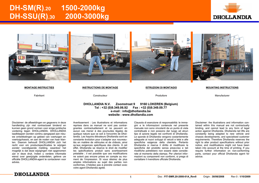 DH-SM(R).20 1500-2000kg DH-SSU(R).30 2000-3000kg MONTAGE INSTRUCTIES INSTRUCTIONS DE MONTAGE ISTRUZIONI DI MONTAGIO MOUNTING INSTRUCTIONS Fabrikant Constructeur Produttore Manufacturer DHOLLANDIA N.V. Zoomstraat 9 9160 LOKEREN (Belgium) Tel : +32 (0)9.349.06.92 Fax : +32 (0)9.349.09.77 e-mail : [email protected] website : www.dhollandia.com Disclaimer: de afbeeldingen en gegevens in deze handleiding zijn niet contractueel bindend en kunnen geen grond vormen voor enige juridische vordering tegen DHOLLANDIA. DHOLLANDIA laadkleppen worden continu aangepast aan nieuwe ontwikkelingen op gebied van voertuigen en voertuigchassis, en aan de noden van haar klanten. Daarom behoudt DHOLLANDIA zich het recht voor om productspecificaties te wijzigen zonder voorafgaande melding, waardoor het mogelijk is dat deze wijzigingen niet opgenomen zijn in deze druk. Indien u verdere informatie wenst over gewijzigde onderdelen, gelieve uw officiële DHOLLANDIA-agent te contacteren voor advies. DHOLLANDIA Avertissement : Les illustrations et informations reprises dans ce manuel ne sont pas contraignantes contractuellement et ne peuvent en aucun cas mener à des poursuites légales de quelque nature que ce soit à l’encontre de Dhollandia. Les hayons élévateurs Dhollandia sont en constante évolution pour s’adapter aux nouveautés en matière de véhicules et de châssis, ainsi qu’aux exigences spécifiques des clients. À cet effet, Dhollandia se réserve le droit de modifier les spécifications produit sans avertissement préalable ; il est possible que ces modifications ne soient pas encore prises en compte au moment de l’impression. Si vous désirez de plus amples informations au sujet des parties non conformes, n’hésitez pas à prendre contact avec votre agent Dhollandia agréé. Clausola di esenzione di responsabilità: le immagini e le informazioni contenute nel presente manuale non sono vincolanti da un punto di vista contrattuale e non possono dar luogo ad alcun tipo di azione legale nei confronti di Dhollandia. Le sponde di Dhollandia vengono costantemente adeguate ai nuovi sviluppi di veicoli e telai e alle specifiche esigenze della clientela. Pertanto Dhollandia si riserva il diritto di modificare le specifiche del prodotto senza preavviso e tali modifiche potrebbero non essere state considerate al momento della stampa. Per ulteriori informazioni su componenti non conformi, si prega di contattare il rivenditore ufficiale Dhollandia. 1 Disclaimer: the illustrations and information contained within this manual are not contractually binding, and cannot lead to any form of legal action against Dhollandia. Dhollandia tail lifts are constantly being adapted to new vehicle and chassis developments, and specialised customer requirements. Therefore Dhollandia reserves the right to alter product specifications without prior notice; and modifications might not have been taken into account at the time of printing. If you require further information on non-conforming parts, contact your official Dhollandia agent for advice. Doc : FIT-SMR.20-2008-01A_Rev0 Origin : 30/06/2008 Rev 0 : 1/10/2009 NL FR Inhoudsopgave Index 0) 1) 2) 3) 4) LISTE DES ABREVIATIONS ........................................................................................ INSTRUCTIONS GENERALES DE MONTAGE ........................................................... TYPES DE CHASSIS ET METHODES DE MONTAGE................................................ TRAVAIL PREPARATOIRE SUR LA CARROSSERIE ET LE CHASSIS ..................... MONTAGE DU BATI DU HAYON : 3 FAÇONS DE COMMENCER ............................. §4.1 - Méthode avec les gabarits de montage ......................................................... §4.2 - Méthode avec la plateforme horizontale ........................................................ §4.3 - Utilisation du cadre de transport pour montage rapide (option S410) ............ 5) MONTAGE DU BATI DU HEH ET DES GLISSIERES.................................................. §5.1 - Montage test du bâti de HEH des glissières .................................................. §5.2 - Position des brides de montage sur les glissières en aluminium pour le modèle DH-SM(R) 1500-2000 kg....................................................... §5.3 - Différences pour les modèles DH-SSU(R) 2000-3000 kg et DH-SK(S) 1000-2000 kg ................................................................................ §5.4 - Glissières en acier ......................................................................................... §5.5 - Montage des glissières sur le châssis du véhicule......................................... §5.6 - Ajustements et fixation des coulisseaux ........................................................ 6) MONTAGE DE LA PLATEFORME ET FINALISATION DU TRAVAIL MECANIQUE.... §6.1 - Montage de la plateforme sur les bras de levage .......................................... §6.2 - Vérifiez la position de la crémaillère du système de rétraction....................... §6.3 - Montez les butées d’extrémité pour la position de travail............................... §6.4 - Finalisez la position route de la plateforme .................................................... 7) INSTALLATION ELECTRIQUE DU HEH...................................................................... §7.1 - Montage du boîtier de commande ainsi que du câble de batterie (+) et du câble de masse (-) ................................................................................ §7.2 - Brides de montage optionnelles pour le boîtier de commande extérieur ....... §7.3 - Guidage des câbles électriques ..................................................................... 8) MISE EN SERVICE DU HEH........................................................................................ ANNEXES .......................................................................................................................... A.1 - Couples