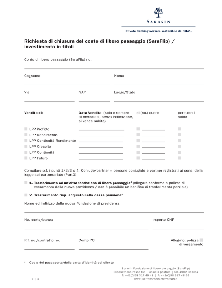 Private Banking svizzero sostenibile dal 1841. Richiesta di chiusura del conto di libero passaggio (SaraFlip) / investimento in titoli Conto di libero passaggio (SaraFlip) no. Cognome Nome Via NAP Luogo/Stato Vendita di: Data Vendita (solo e sempre di (no.) quote di mercoledi, senza indicazione, si vende subito) per tutto il saldo LPP Profitto LPP Rendimento LPP Continuità Rendimento LPP Crescita LPP Continuità LPP Futuro Compilare p.f. i punti 1/2/3 o 4; Coniuge/partner = persone coniugate e partner registrati ai sensi della legge sul partnerariato (PartG) 1. Trasferimento ad un’altra fondazione di libero passaggio 4 (allegare conferma e polizza di versamento della nuova previdenza / non è possibile un bonifico di trasferimento parziale) 2. Trasferimento risp. acquisto nella cassa pensione 4 Nome ed indirizzo della nuova Fondazione di previdenza No. conto/banca Rif. no./contratto no. 4 Importo CHF Conto PC Allegato: polizza di versamento Copia del passaporto/della carta d’identità del cliente 1 | 4 Sarasin Fondazione di libero passaggio (SaraFlip) Elisabethenstrasse 62 | Casella postale | CH-4002 Basilea T: + 41(0)58 317 49 48 | F: + 41(0)58 317 48 96 www.jsafrasarasin.ch/vorsorge Private Banking svizzero sostenibile dal 1841. 3. Pagamento anticipato dell’avere del libero passaggio (non è possibile una liquidazione parziale) Nome ed indirizzo della banca No. conto/banca Intestato a Conto PC Allegato: polizza di versamento Acquisti Negli ultimi tre anni non è stato effettuato nessun acquisto nella cassa pensioni. Negli ultimi tre anni, sono state effettuate i seguenti acquisti nella previdenza professionale: (si prega di allegare le attestazioni delle casse pensioni) Data d’acquisto Somma in CHF Data d’acquisto Somma in CHF Data d’acquisto Somma in CHF Sé degli acquisti sono stati effettuati, le prestazioni che ne resulterebbero non possono essere percepite sotto forma di capitale nei prossimi tre anni dopo la data d’acquisto. Vogliate informarvi presso il vostro ufficio delle tasse concernente le ripercussioni fiscali del vostro ritiro del capitale. Nota bene: L’assicurato è il solo responsabile di tutte le conseguenze fiscali risultanti da un ritiro del capitale. Motivo del pagamento (Mettere una crocetta a quanto fa al caso ed allegare i documenti menzionati) Raggiungimento del limite d’età4 (Età di pensionamento LPP, max. 5 anni prima, risp. dopo) Partenza definitiva dalla Svizzera 1, 2, 3, 4 • Notifica del controllo abitanti/Conferma della residenza (non più vecchia di 1 anno) • Conferma attuale certificata dello stato civile Contributo esiguo 1, 4 (contributo annuo personale inferiore e quello della previdenza) • Certificato attuale cassa pensione • Conferma attuale certificata dello stato civile 1 Necessaria firma coniuge/partner • Allegare copia passaporto/della carta d’identità e libretto di famiglia (in caso di partnerariato registrato: copia del certificato di partnerariato) 2 A partire da CHF 10’000.– è imperativa la firma legalmente autenticata del coniuge/partner 3 Partenza nella UE o EFTA solo LPP parte sovraobbligatoria 4 Copia del passaporto/della carta d’identità del cliente 2 | 4 Private Banking svizzero sostenibile dal 1841. Inizio di un’attività lucrativa indipendente 1, 2, 4 (Pagamento possibile soltanto entro un anno dall’inizio dell’attività lucrativa indipendente!) • Disposizione attuale della cassa di compensazione AVS „attività principale indipendente“ • Conferma attuale certificata dello stato civile • Sua conferma scritta, che non sottostà più alla previdenza professionale obbligatoria quale dipendente. Invalidità4 (dal 70% grado AI) • Disposizione attuale dell’AI federale (non più vecchia di 2 anni) Decesso dell’assicurato (da comprovare dagli eredi) • certificato di successione 4. Richiesta per il pagamento anticipato dell’avere di previdenza secondo la legge federale sul promovimento della proprietà abitativa 1 Pagamento anticipato Avere parziale di CHF Avere maturato alla data di pagamento mantenendo il conto chiudendo il conto Pagamento anticipato entro i 5 anni pregressi Importo: CHF Pagamento al Pegno Importo: CHF (P.f. allegare contratto di pegno della banca) Scopo di utilizzo Costruzione/Acquisto Partecipazione Ammortamento ipoteca SA Inquilini Prestito Se partecipazione Cooperativa abitativa Certificati di quote e simili titoli di partecipazione devono essere depositati presso la Sarasin Fondazione di libero passaggio (SaraFlip). Oggetto Appartamento Casa unifamiliare Confermo che il pagamento anticipato rispettivamente il pegno sarà utilizzato per proprietà abitativa da me stesso utilizzata. Forma Proprietà unicamente mia Comproprietà: quota Proprietà in mano comune (coniuge-)partner Diritto di costruzione 1 E’ necessaria la firma del coniuge/partner: • allegare copia passaporto/della carta d’identità e libretto di famiglia (in caso di partenariato registrato: copia del certificato di partenariato) 2 A partire da CHF 10’000.– è imperativa la firma legalmente autenticata del coniuge/partner 4 Copia del passaporto/della carta d’identità del cliente 3 | 4 Private Banking svizzero sostenibile dal 1841. Allegati come prove dello scopo d’utilizzo (obbligatorio) Copia contratto d’acquisto autenticato o Estratto attuale Registro Fondiario (incl. Numero foglio RF) Conferma della banca circa lo scopo d’utilizzo Nome ed indirizzo creditore ipotecario Conto ipotecario no. Pagamento desiderato per: Allegato polizza di versamento (non è possibile conto privato) Conferma Il sottoscritto assicurato e il suo relativo coniuge/partner confermano con la presente che essi . . . • sono stati informati sull’obbligo fiscale immediato in caso di pagamento/pagamento anticipato dell’avere di previdenza. • conferiscono alla Sarasin Fondazione di libero passaggio (SaraFlip) il permesso, se fosse necessario, di procedere ad ulteriori chiarimenti • attestano l