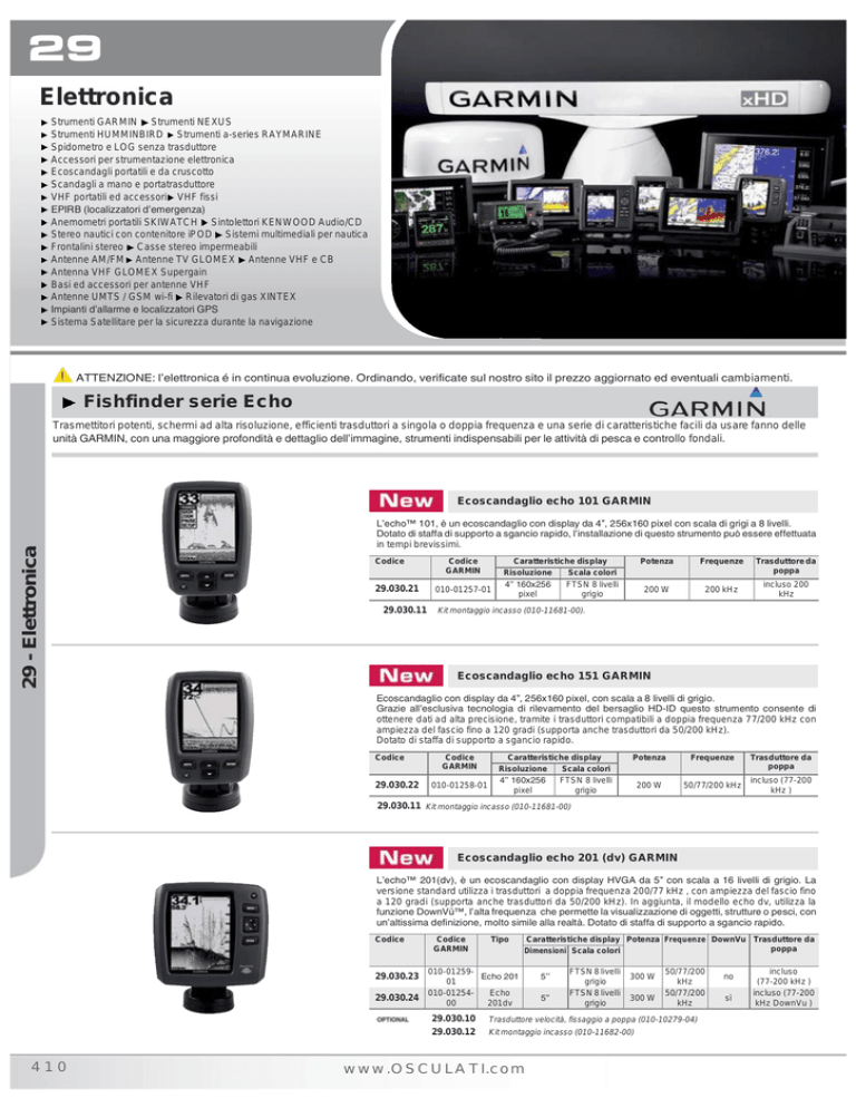 Elettronica Strumenti GARMIN Strumenti NEXUS Strumenti HUMMINBIRD Strumenti a-series RAYMARINE Spidometro e LOG senza trasduttore Accessori per strumentazione elettronica Ecoscandagli portatili e da cruscotto Scandagli a mano e portatrasduttore VHF portatili ed accessori VHF fissi EPIRB (localizzatori demergenza) Anemometri portatili SKIWATCH Sintolettori KENWOOD Audio/CD Stereo nautici con contenitore iPOD Sistemi multimediali per nautica Frontalini stereo Casse stereo impermeabili Antenne AM/FM Antenne TV GLOMEX Antenne VHF e CB Antenna VHF GLOMEX Supergain Basi ed accessori per antenne VHF Antenne UMTS / GSM wi-fi Rilevatori di gas XINTEX Impianti dallarme e localizzatori GPS Sistema Satellitare per la sicurezza durante la navigazione PM ATTENZIONE: lelettronica é in continua evoluzione. Ordinando, verificate sul nostro sito il prezzo aggiornato ed eventuali cambiamenti. Fishfinder serie Echo Trasmettitori potenti, schermi ad alta risoluzione, efficienti trasduttori a singola o doppia frequenza e una serie di caratteristiche facili da usare fanno delle unità GARMIN, con una maggiore profondità e dettaglio dellimmagine, strumenti indispensabili per le attività di pesca e controllo fondali. 29 - Elettronica Ecoscandaglio echo 101 GARMIN Lecho 101, è un ecoscandaglio con display da 4, 256x160 pixel con scala di grigi a 8 livelli. Dotato di staffa di supporto a sgancio rapido, linstallazione di questo strumento può essere effettuata in tempi brevissimi. Garmin Codice 29.030.21 29.030.11 Codice GARMIN Caratteristiche display Risoluzione Scala colori 010-01257-01 4 160x256 pixel FTSN 8 livelli grigio Potenza Frequenze 200 W 200 kHz Trasduttore da poppa incluso 200 kHz Kit montaggio incasso (010-11681-00). Ecoscandaglio echo 151 GARMIN Ecoscandaglio con display da 4, 256x160 pixel, con scala a 8 livelli di grigio. Grazie allesclusiva tecnologia di rilevamento del bersaglio HD-ID questo strumento consente di ottenere dati ad alta precisione, tramite i trasduttori compatibili a doppia frequenza 77/200 kHz con ampiezza del fascio fino a 120 gradi (supporta anche trasduttori da 50/200 kHz). Dotato di staffa di supporto a sgancio rapido. Garmin Codice 29.030.22 Codice GARMIN 010-01258-01 Caratteristiche display Risoluzione Scala colori 4 160x256 FTSN 8 livelli pixel grigio Potenza Frequenze 200 W 50/77/200 kHz Trasduttore da poppa incluso (77-200 kHz ) 29.030.11 Kit montaggio incasso (010-11681-00) Ecoscandaglio echo 201 (dv) GARMIN Lecho 201(dv), è un ecoscandaglio con display HVGA da 5 con scala a 16 livelli di grigio. La versione standard utilizza i trasduttori a doppia frequenza 200/77 kHz , con ampiezza del fascio fino a 120 gradi (supporta anche trasduttori da 50/200 kHz). In aggiunta, il modello echo dv, utilizza la funzione DownVü, lalta frequenza che permette la visualizzazione di oggetti, strutture o pesci, con unaltissima definizione, molto simile alla realtà. Dotato di staffa di supporto a sgancio rapido. Garmin Codice 29.030.23 29.030.24 Codice GARMIN Caratteristiche display Potenza Frequenze DownVu Trasduttore da poppa Dimensioni Scala colori 010-01259Echo 201 01 010-01254Echo 00 201dv 29.030.10 29.030.12 410 Tipo 5 5 FTSN 8 livelli grigio FTSN 8 livelli grigio 300 W 300 W 50/77/200 kHz 50/77/200 kHz Trasduttore velocità, fissaggio a poppa (010-10279-04) Kit montaggio incasso (010-11682-00) www.OSCULATI.com no sì incluso (77-200 kHz ) incluso (77-200 kHz DownVu ) Elettronica 29 Ecoscandaglio echo 301c GARMIN Lecho 301c, il più compatto della serie a colori, è un ecoscandaglio con display QVGA 3.5 ad alta risoluzione, che consente un rilevamento ottimale del fondo e dei pesci sia in bassi fondali che in acque profonde. Grazie allesclusiva tecnologia di rilevamento del bersaglio HD-ID questo strumento consente di ottenere dati ad alta precisione, tramite i trasduttori compatibili a doppia frequenza 77/200 kHz con ampiezza del fascio fino a 120 gradi (supporta anche trasduttori da 50/200 kHz). Dotato di staffa di supporto a sgancio rapido. Garmin Codice 29.031.21 Codice GARMIN Caratteristiche display Potenza Frequenze Trasduttore da poppa 010-01260-00 3,5 a colori 300 W 50/77/200 kHz incluso (77-200 kHz ) 29.030.10 Trasduttore velocità optional, fissaggio a poppa (010-10279-02) 29.030.11 Kit montaggio incasso (010-11681-00) Ecoscandaglio echo 501c GARMIN Eccellente ecoscandaglio con display a a colori QVGA da 5 ad alta risoluzione, che consente un rilevamento ottimale del fondo e dei pesci sia in bassi fondali che in acque profonde. 29 - Elettronica Grazie allesclusiva tecnologia di rilevamento del bersaglio HD-ID questo strumento consente di ottenere dati ad alta precisione, tramite i trasduttori compatibili a doppia frequenza 200/77 kHz con ampiezza del fascio fino a 120 gradi, oppure tramite i trasduttori da 50/200 kHz . Dotato di staffa di supporto a sgancio rapido. Garmin Codice 29.031.22 Codice GARMIN Caratteristiche display Potenza Frequenze Trasduttore da poppa 3,5 a colori 500 W 50/77/200 kHz incluso (77-200 kHz ) 010-01261-00 29.030.10 29.030.12 Trasduttore velocità, fissaggio a poppa (010-10279-02) Kit montaggio incasso (010-11682-00) Ecoscandaglio echo 551c (dv) GARMIN Lecho 551c(dv) è un ecoscandaglio a colori con display VGA 5 ad alta risoluzione, top della gamma echo di Garmin, che consente un eccellente rilevamento del fondo e dei pesci sia in bassi fondali che in acque profonde. Grazie allesclusiva tecnologia di rilevamento del bersaglio HD-ID questo strumento consente di ottenere dati ad alta precisione, tramite i trasduttori compatibili a doppia frequenza 200/77 kHz con ampiezza del fascio fino a 120 gradi, oppure tramite i trasduttori da 50/200 kHz. In aggiunta, il modello echo dv utilizza la funzione DownVü, lalta frequenza che permette la visualizzazione di oggetti, strutture o pesci, con unaltissima definizione, molto simile alla realtà. Dotato di staffa di supporto a sgancio rapido. Garmin Codice 29.031.23 29.031.24 Codice GARMIN Tipo Caratteri