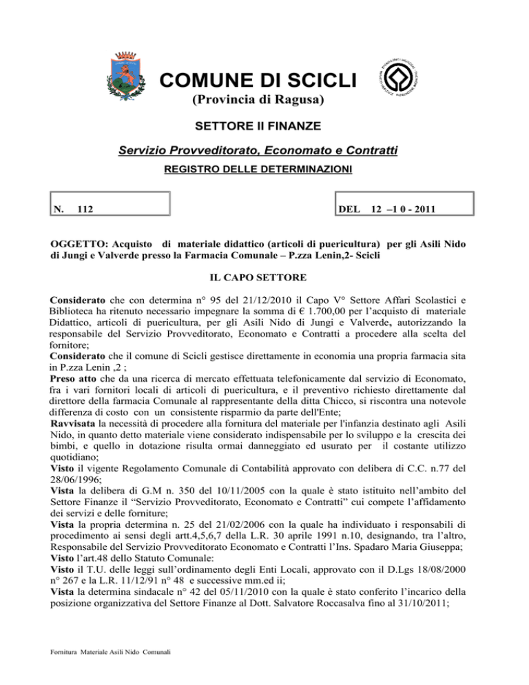 COMUNE DI SCICLI (Provincia di Ragusa) SETTORE II FINANZE Servizio Provveditorato, Economato e Contratti REGISTRO DELLE DETERMINAZIONI N. 112 DEL 12 –1 0 - 2011 OGGETTO: Acquisto di materiale didattico (articoli di puericultura) per gli Asili Nido di Jungi e Valverde presso la Farmacia Comunale – P.zza Lenin,2- Scicli IL CAPO SETTORE Considerato che con determina n° 95 del 21/12/2010 il Capo V° Settore Affari Scolastici e Biblioteca ha ritenuto necessario impegnare la somma di € 1.700,00 per l’acquisto di materiale Didattico, articoli di puericultura, per gli Asili Nido di Jungi e Valverde, autorizzando la responsabile del Servizio Provveditorato, Economato e Contratti a procedere alla scelta del fornitore; Considerato che il comune di Scicli gestisce direttamente in economia una propria farmacia sita in P.zza Lenin ,2 ; Preso atto che da una ricerca di mercato effettuata telefonicamente dal servizio di Economato, fra i vari fornitori locali di articoli di puericultura, e il preventivo richiesto direttamente dal direttore della farmacia Comunale al rappresentante della ditta Chicco, si riscontra una notevole differenza di costo con un consistente risparmio da parte dell'Ente; Ravvisata la necessità di procedere alla fornitura del materiale per l'infanzia destinato agli Asili Nido, in quanto detto materiale viene considerato indispensabile per lo sviluppo e la crescita dei bimbi, e quello in dotazione risulta ormai danneggiato ed usurato per il costante utilizzo quotidiano; Visto il vigente Regolamento Comunale di Contabilità approvato con delibera di C.C. n.77 del 28/06/1996; Vista la delibera di G.M n. 350 del 10/11/2005 con la quale è stato istituito nell’ambito del Settore Finanze il “Servizio Provveditorato, Economato e Contratti” cui compete l’affidamento dei servizi e delle forniture; Vista la propria determina n. 25 del 21/02/2006 con la quale ha individuato i responsabili di procedimento ai sensi degli artt.4,5,6,7 della L.R. 30 aprile 1991 n.10, designando, tra l’altro, Responsabile del Servizio Provveditorato Economato e Contratti l’Ins. Spadaro Maria Giuseppa; Visto l’art.48 dello Statuto Comunale: Visto il T.U. delle leggi sull’ordinamento degli Enti Locali, approvato con il D.Lgs 18/08/2000 n° 267 e la L.R. 11/12/91 n° 48 e successive mm.ed ii; Vista la determina sindacale n° 42 del 05/11/2010 con la quale è stato conferito l’incarico della posizione organizzativa del Settore Finanze al Dott. Salvatore Roccasalva fino al 31/10/2011; Fornitura Materiale Asili Nido Comunali Ritenuto, pertanto provvedere alla fornitura di che trattasi; DETERMINA Per la causale in premessa: 1) Di provvedere alla fornitura ed all'acquisto del materiale didattico, articoli di puericultura, per gli Asili Nido di Jungi e Valverde, elencato nell’allegato A), presso la Farmacia Comunale per un importo di €.1.495,56 iva compresa.; 2) Di provvedere alla liquidazione, con successivo provvedimento, e dopo presentazione di regolare fattura rilasciata dal Direttore della Farmacia Comunale; 3) Di prelevare la spesa presuntiva di € 1.495,56 occorrente per la fornitura di cui all’oggetto, dall’intervento 1.10.01.02 Cap. 37 cc 10 residuo 2010, Bilancio 2011, ove risulta impegnata per effetto della determina n° 95 del 21/12/2010, del Capo V° Settore Affari Scolastici e Biblioteca Dott.ssa M.G. Benedetto; IL CAPO SETTORE Si certifica la regolarità del presente provvedimento degli atti allo stesso connessi. Il Responsabile del Procedimento Ins. Spadaro Maria Giuseppa (Dott. Roccasalva Salvatore) Il Compilatore Responsabile Maria Concettina _____________________________________________________________________________ SERVIZIO FINANZIARIO IMPEGNO N. 2397/2010 LIQUIDAZIONE N. ___________ VISTO: Si attesta la regolarità contabile e la relativa copertura finanziaria. IL RESPONSABILE DEL SERVIZIO FINANZIARIO ________________________ Fornitura Materiale Asili Nido Comunali