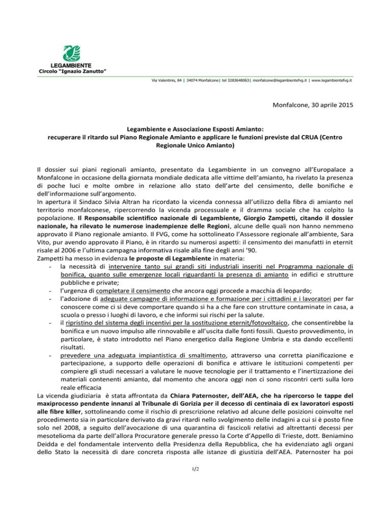 Circolo “Ignazio Zanutto” Via Valentinis, 84 | 34074 Monfalcone| tel 3283648063| [email protected] | www.legambientefvg.it del Friuli Venezia Giulia - onlus Monfalcone, 30 aprile 2015 Legambiente e Associazione Esposti Amianto: recuperare il ritardo sul Piano Regionale Amianto e applicare le funzioni previste dal CRUA (Centro Regionale Unico Amianto) Il dossier sui piani regionali amianto, presentato da Legambiente in un convegno all’Europalace a Monfalcone in occasione della giornata mondiale dedicata alle vittime dell’amianto, ha rivelato la presenza di poche luci e molte ombre in relazione allo stato dell’arte del censimento, delle bonifiche e dell’informazione sull’argomento. In apertura il Sindaco Silvia Altran ha ricordato la vicenda connessa all’utilizzo della fibra di amianto nel territorio monfalconese, ripercorrendo la vicenda processuale e il dramma sociale che ha colpito la popolazione. Il Responsabile scientifico nazionale di Legambiente, Giorgio Zampetti, citando il dossier nazionale, ha rilevato le numerose inadempienze delle Regioni, alcune delle quali non hanno nemmeno approvato il Piano regionale amianto. Il FVG, come ha sottolineato l’Assessore regionale all’ambiente, Sara Vito, pur avendo approvato il Piano, è in ritardo su numerosi aspetti: il censimento dei manufatti in eternit risale al 2006 e l’ultima campagna informativa risale alla fine degli anni ’90. Zampetti ha messo in evidenza le proposte di Legambiente in materia: - la necessità di intervenire tanto sui grandi siti industriali inseriti nel Programma nazionale di bonifica, quanto sulle emergenze locali riguardanti la presenza di amianto in edifici e strutture pubbliche e private; - l’urgenza di completare il censimento che ancora oggi procede a macchia di leopardo; - l’adozione di adeguate campagne di informazione e formazione per i cittadini e i lavoratori per far conoscere come ci si deve comportare quando si ha a che fare con strutture contaminate in casa, a scuola o presso i luoghi di lavoro, e che informi sui rischi per la salute. - il ripristino del sistema degli incentivi per la sostituzione eternit/fotovoltaico, che consentirebbe la bonifica e un nuovo impulso alle rinnovabile e all’uscita dalle fonti fossili. Questo provvedimento, in particolare, è stato introdotto nel Piano energetico dalla Regione Umbria e sta dando eccellenti risultati. - prevedere una adeguata impiantistica di smaltimento, attraverso una corretta pianificazione e partecipazione, a supporto delle operazioni di bonifica e attivare le istituzioni competenti per compiere gli studi necessari a valutare le nuove tecnologie per il trattamento e l’inertizzazione dei materiali contenenti amianto, dal momento che ancora oggi non ci sono riscontri certi sulla loro reale efficacia La vicenda giudiziaria è stata affrontata da Chiara Paternoster, dell’AEA, che ha ripercorso le tappe del maxiprocesso pendente innanzi al Tribunale di Gorizia per il decesso di centinaia di ex lavoratori esposti alle fibre killer, sottolineando come il rischio di prescrizione relativo ad alcune delle posizioni coinvolte nel procedimento sia in particolare derivato da gravi ritardi nello svolgimento delle indagini a cui si è posto fine solo nel 2008, a seguito dell’avocazione di una quarantina di fascicoli relativi ad altrettanti decessi per mesotelioma da parte dell’allora Procuratore generale presso la Corte d’Appello di Trieste, dott. Beniamino Deidda e del fondamentale intervento della Presidenza della Repubblica, che ha evidenziato agli organi dello Stato la necessità di dare concreta risposta alle istanze di giustizia dell’AEA. Paternoster ha poi 1/2 Circolo “Ignazio Zanutto” Via Valentinis, 84 | 34074 Monfalcone| tel 3283648063| [email protected] | www.legambientefvg.it del Friuli Venezia Giulia - onlus sottolineato l’importanza del coinvolgimento degli enti territoriali (Regione, Provincia e Comune) nel contesto del processo, mediante l’attivazione dell’istituto della costituzione di parte civile, affinchè si palesi, una volta di più, la dimensione collettiva del danno sotteso dai reati quali quelli in considerazione e affinchè venga riaffermata la necessità che le imprese siano rese responsabili del proprio operato a tutela della sicurezza e della dignità dei lavoratori, anche attraverso l’attivazione delle istanze risarcitorie. Ha infine evidenziato la necessità che il CRUA, fra le altre tipologie di intervento, si occupi del sostegno psicologico degli esposti e fornisca loro una specifica assistenza – in funzione d’informazione – di carattere oncologico. Gianni Cavallini, responsabile del Dipartimento di prevenzione dell’azienda sanitaria 2 Friulano Isontina non si è sottratto alla richiesta, formulata da Legambiente ed AEA, di esplicitare le funzioni e i programmi del Centro regionale unico per l’Amianto (CRUA); le risposte sono state incoraggianti e se verrà realizzato quanto illustrato, sia a livello di coordinamento regionale che di funzioni direttamente collegate alla situazione locale, si potranno osservare i risultati già nel breve periodo. In particolare, il dottor Cavallini ha ricordato alcune funzioni di prossima applicazione: - la definizione di un programma di sorveglianza sanitaria per gli ex esposti che dovrà essere realizzato dalle singole aziende sanitarie - la realizzazione di un protocollo per la presa in carico assistenziale e previdenziale dei soggetti con diagnosi di malattie amianto correlate - la realizzazione, in coordinamento con l’ARPA, del censimento dell’amianto in FVG e la predisposizione di un programma per la bonifica - la realizzazione di una campagna informativa rivolta alla popolazione sui rischi connessi all’esposizione all’amianto e la formazione per gli addetti alle bonifiche - avvio di programmi di ricerca nell’ambito dello studio delle patologie amianto correlate e dei soggetti esposti - la realizzazione di un programma di so