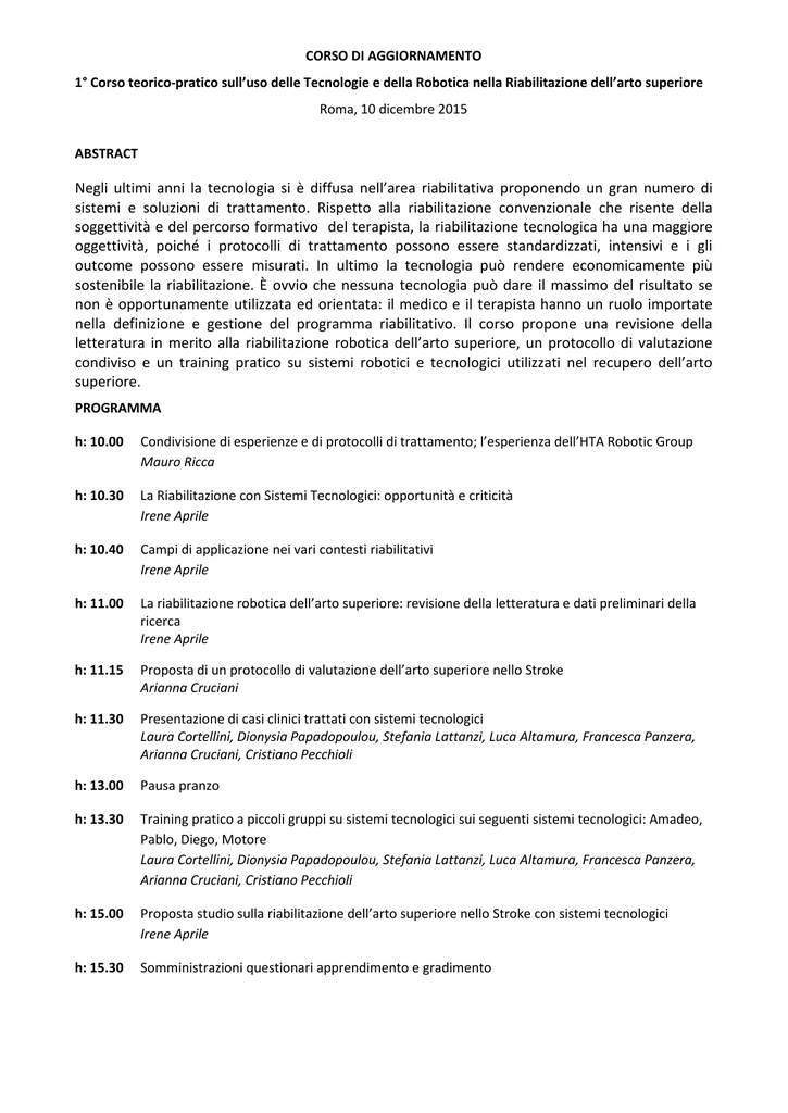 CORSO DI AGGIORNAMENTO 1° Corso teorico-pratico sull’uso delle Tecnologie e della Robotica nella Riabilitazione dell’arto superiore Roma, 10 dicembre 2015 ABSTRACT Negli ultimi anni la tecnologia si è diffusa nell’area riabilitativa proponendo un gran numero di sistemi e soluzioni di trattamento. Rispetto alla riabilitazione convenzionale che risente della soggettività e del percorso formativo del terapista, la riabilitazione tecnologica ha una maggiore oggettività, poiché i protocolli di trattamento possono essere standardizzati, intensivi e i gli outcome possono essere misurati. In ultimo la tecnologia può rendere economicamente più sostenibile la riabilitazione. È ovvio che nessuna tecnologia può dare il massimo del risultato se non è opportunamente utilizzata ed orientata: il medico e il terapista hanno un ruolo importate nella definizione e gestione del programma riabilitativo. Il corso propone una revisione della letteratura in merito alla riabilitazione robotica dell’arto superiore, un protocollo di valutazione condiviso e un training pratico su sistemi robotici e tecnologici utilizzati nel recupero dell’arto superiore. PROGRAMMA h: 10.00 Condivisione di esperienze e di protocolli di trattamento; l’esperienza dell’HTA Robotic Group Mauro Ricca h: 10.30 La Riabilitazione con Sistemi Tecnologici: opportunità e criticità Irene Aprile h: 10.40 Campi di applicazione nei vari contesti riabilitativi Irene Aprile h: 11.00 La riabilitazione robotica dell’arto superiore: revisione della letteratura e dati preliminari della ricerca Irene Aprile h: 11.15 Proposta di un protocollo di valutazione dell’arto superiore nello Stroke Arianna Cruciani h: 11.30 Presentazione di casi clinici trattati con sistemi tecnologici Laura Cortellini, Dionysia Papadopoulou, Stefania Lattanzi, Luca Altamura, Francesca Panzera, Arianna Cruciani, Cristiano Pecchioli h: 13.00 Pausa pranzo h: 13.30 Training pratico a piccoli gruppi su sistemi tecnologici sui seguenti sistemi tecnologici: Amadeo, Pablo, Diego, Motore Laura Cortellini, Dionysia Papadopoulou, Stefania Lattanzi, Luca Altamura, Francesca Panzera, Arianna Cruciani, Cristiano Pecchioli h: 15.00 Proposta studio sulla riabilitazione dell’arto superiore nello Stroke con sistemi tecnologici Irene Aprile h: 15.30 Somministrazioni questionari apprendimento e gradimento