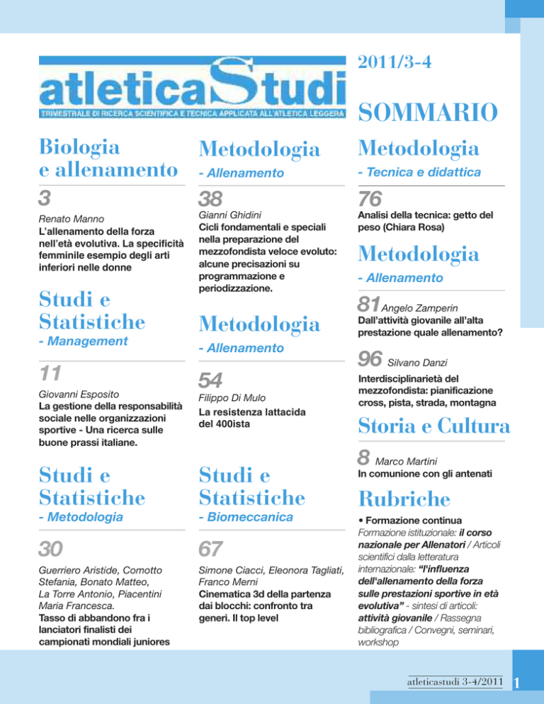 2011/3-4 SOMMARIO Biologia Metodologia e allenamento - Allenamento 3 38 Renato Manno L’allenamento della forza nell’età evolutiva. La specificità femminile esempio degli arti inferiori nelle donne Studi e Statistiche - Management 11 Gianni Ghidini Cicli fondamentali e speciali nella preparazione del mezzofondista veloce evoluto: alcune precisazioni su programmazione e periodizzazione. Metodologia - Tecnica e didattica 76 Analisi della tecnica: getto del peso (Chiara Rosa) Metodologia - Allenamento 81Angelo Zamperin Metodologia - Allenamento 54 Giovanni Esposito La gestione della responsabilità sociale nelle organizzazioni sportive - Una ricerca sulle buone prassi italiane. Filippo Di Mulo La resistenza lattacida del 400ista Studi e Statistiche Studi e Statistiche - Metodologia - Biomeccanica 30 67 Guerriero Aristide, Comotto Stefania, Bonato Matteo, La Torre Antonio, Piacentini Maria Francesca. Tasso di abbandono fra i lanciatori finalisti dei campionati mondiali juniores Simone Ciacci, Eleonora Tagliati, Franco Merni Cinematica 3d della partenza dai blocchi: confronto tra generi. Il top level Dall’attività giovanile all’alta prestazione quale allenamento? 96 Silvano Danzi Interdisciplinarietà del mezzofondista: pianificazione cross, pista, strada, montagna Storia e Cultura 8 Marco Martini In comunione con gli antenati Rubriche • Formazione continua Formazione istituzionale: il corso nazionale per Allenatori / Articoli scientifici dalla letteratura internazionale: “l'influenza dell'allenamento della forza sulle prestazioni sportive in età evolutiva” - sintesi di articoli: attività giovanile / Rassegna bibliografica / Convegni, seminari, workshop atleticastudi 3-4/2011 1 asics.it correre libera molto più che semplice sudore ASICS nasce come acronimo del motto latino “Anima Sana In Corpore Sano” S 2011/3-4 biologia e allenamento L’allenamento della forza nell’età evolutiva. La specificità femminile esempio degli arti inferiori nelle donne Renato Manno L’attività fisica in età evolutiva rappresenta una esigenza determinante per un corretto sviluppo che crei i presupposti per una buona qualità della vita e pre- venga l’obesità e le molte affezioni comuni nell’età adulta (40, 26). Per ottenere ciò si consiglia almeno un ora di attività fisica da moderata a vigorosa (40). In aggiunta alle attività fisiche di tipo aerobico è oramai universalmente accettato comprendere una importante quota di lavoro con sovraccarichi, comunque finalizzato allo sviluppo della forza ai fini, non solo di uno sviluppo corretto e solido, ma anche per un miglioramento della caricabilità strutturale dei ragazzi per l’avvio ad una pratica dello sport agonistico e di prestazione (33). Molte rassegne hanno fatto il punto sui diversi aspetti della caricabilità teorica e pratica dei bambini e ragazzi nei due sessi in età evolutiva, sono note le analisi delle prestazioni di forza e la sua allenabilità (7,8), dagli 11 ai 14 anni (27) e di salto oltre che di sprint (Filin 1978). Molti elementi sono da approfondire altri da chiarire, un tema emerso recentemente che riguarda gli aspetti generali della forza nelle donne e nelle ragazze; molti studi precedenti hanno affermato una sostanziale similitudine sul piano muscolare con il maschio, in particolare la forza per sezione trasversa fig . 1 (42, 19) e che sembra confermato in tutti gli studi che analizzino la forza massima. Data comunque la differenza concreta di capacità di prestazione fra maschi e femmine, altri ricercatori hanno cercato di identificare alcune specificità che rendono la capacità di prestazione femminile più problematica ed in alcuni casi più ricca di infortuni. Uno studio di Komi (24), già nel 1980, aveva rilevato una differenza nel tempo di reclutamento della forza fra maschi e femmine sedentarie, a parità di percentuale di carico, quest’ultime avevano un tempo quasi doppio nel raggiungere la forza massima fig. 2. Tale dato non è stato per lungo tempo ripreso né motivato, salvo alcuni lavori di Bosco (3) che sembravano confermare la differenza di reclutamento della forza come collegata alle differenze di concentrazione di testosterone. E’ evidente che la conferma del fatto che il reclutamento di forza nelle donne sia più lento comporta ripercussioni neuromeccaniche di vario tipo; del resto il dato è noto per gli arti inferiori e non esistono dati chiari per gli arti superiori che non hanno una applicazione così frequente nella deambulazione e nella prestazione. Alla fine degli anni novanta un lavoro molto importante, dopo diverse disamine di tipo anatomico strutturale (12, 20), attribuì alla differenze neuromuscolari (17) l’ipotesi che la maggiore frequenza di infortuni dipendesse da importanti differenze neuromuscolari. atleticastudi 3-4/2011 3 Fig. 1 Comparazione dei valori di forza per unità di superficie in maschi e femmine (in Mathews e Fox 1976) dopo un salto o facendo veloci cambi di direzione (16). La frequenza del problema per la verità non è molto elevata nelle discipline dell’atletica leggera. Forse ciò è dovuto al fatto che le ragazze abbandonano l’attività prima e continuano solo le atlete che hanno acquisito un equilibrio neuromuscolare notevole o che hanno svolto una buona preparazione. Comunque in tale sport si svolgono attività tecniche più prevedibili, cicliche e acicliche, che abbassano la soglia di rischio anche se di grande intensità. Del resto la frequenza degli infortuni si riduce di molto nelle atlete (2 volte maggiore che nei maschi) e si riduce ulteriormente salendo di livello agonistico e di preparazione, rimanendo però nella frequenza di infortuni una differenza significativa. Il problema è importante e si ripresenta in frequenza altissima nelle età collegate alla maturazione (fig. 3) come emerge dallo specifico approfondimento degli esperti per conto del CIO (38) e nella fase di rapida crescita staturo ponderale. Fra le diverse cause più speci