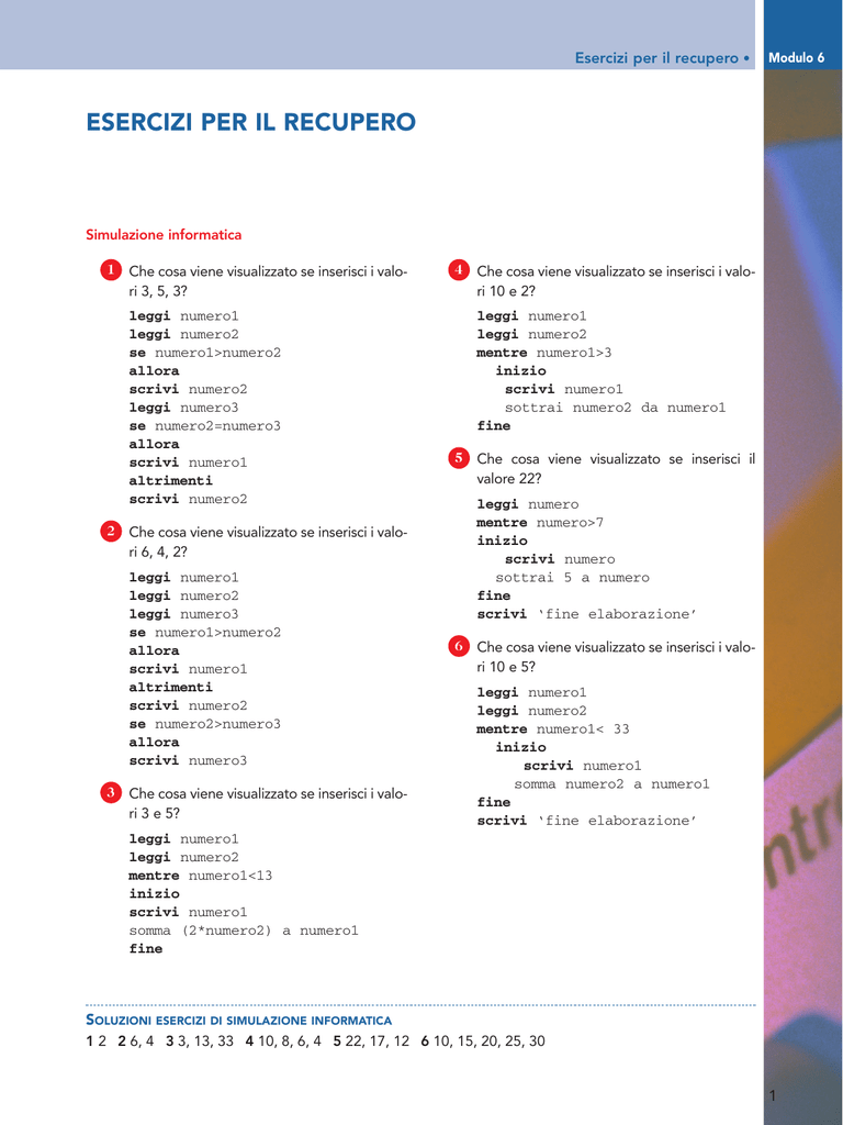 Esercizi per il recupero • Modulo 6 ESERCIZI PER IL RECUPERO Simulazione informatica 1 Che cosa viene visualizzato se inserisci i valori 3, 5, 3? leggi numero1 leggi numero2 se numero1>numero2 allora scrivi numero2 leggi numero3 se numero2=numero3 allora scrivi numero1 altrimenti scrivi numero2 2 Che cosa viene visualizzato se inserisci i valori 3 e 5? Che cosa viene visualizzato se inserisci i valori 10 e 2? leggi numero1 leggi numero2 mentre numero1>3 inizio scrivi numero1 sottrai numero2 da numero1 fine 5 Che cosa viene visualizzato se inserisci il valore 22? leggi numero mentre numero>7 inizio scrivi numero sottrai 5 a numero fine scrivi ‘fine elaborazione’ Che cosa viene visualizzato se inserisci i valori 6, 4, 2? leggi numero1 leggi numero2 leggi numero3 se numero1>numero2 allora scrivi numero1 altrimenti scrivi numero2 se numero2>numero3 allora scrivi numero3 3 4 6 Che cosa viene visualizzato se inserisci i valori 10 e 5? leggi numero1 leggi numero2 mentre numero1< 33 inizio scrivi numero1 somma numero2 a numero1 fine scrivi ‘fine elaborazione’ leggi numero1 leggi numero2 mentre numero1<13 inizio scrivi numero1 somma (2*numero2) a numero1 fine SOLUZIONI ESERCIZI DI SIMULAZIONE INFORMATICA 1 2 2 6, 4 3 3, 13, 33 4 10, 8, 6, 4 5 22, 17, 12 6 10, 15, 20, 25, 30 1 Modulo 6 • Esercizi per il recupero Problemi 1. Scrivi un algoritmo che descriva le operazioni necessarie per effettuare per la preparazione del sugo per una spaghettata tra amici, scegliendo una ricetta a piacere. Descrivi il diagramma di flusso e codifica le istruzioni in linguaggio di progetto. 2. Scrivi un algoritmo che individua il più pesante tra 4 sacchi di patate effettuando solo tre possibili pesate (confronti tra il peso che è scritto sul sacco). Descrivi il diagramma di flusso e codifica le istruzioni in linguaggio di progetto. 3. Scrivi un programma per dare il resto a un distributore di bevande, sapendo che alla selezione della bevanda viene impostato l’importo da pagare (compreso tra 0,80 e 2,20 euro) e il cliente inserisce una banconota da 5 euro. Il resto viene dato in monete da 1 euro, 50 cent e 10 cent. Descrivi il diagramma di flusso e codifica le istruzioni in linguaggio di progetto e realizzando la trace table nel caso in cui venga scelta una bibita che costa 1,70 euro. 8. Descrivi mediante un diagramma di flusso la soluzione del problema delle 12 monete: date 12 monete di cui una falsa e di peso inferiore alle altre, utilizzando non più di tre pesate con una bilancia a bracci uguali, si determini qual è la moneta falsa. 9. Scrivi un algoritmo che ricevendo in ingresso il numero del mese ne visualizzi sullo schermo il nome. 4. Descrivi mediante un diagramma di flusso la soluzione del problema delle 3 tazze: ci sono 3 tazze, la prima contiene 11 sassolini, la seconda ne contiene 7 e la terza 6. In tre mosse dobbiamo fare in modo che ogni tazza contenga 8 sassolini. 5. Scrivi un algoritmo che descriva le operazioni necessarie per travasare una damigiana di olio da 140 litri in bottiglie da 1,75 litri. numerando progressivamente le bottiglie man mano che si riempiono. Calcola preventivamene il numero di bottiglie che si possono riempire. Costruisci il diagramma di flusso e codifica le istruzioni in linguaggio di progetto. 11. Sull’importo totale di un acquisto viene praticato lo sconto del 3% se è minore di 1000 mentre, se è maggiore si applica uno sconto del 5%. Scrivi un programma che legga da tastiera il costo di tre prodotti e si calcoli il prezzo da pagare secondo la regola sopra descritta. Scrivi un programma che legge in input un numero naturale N e ne effettua la somma dei primi N numeri pari. Descrivi il diagramma di flusso e codifica le istruzioni in linguaggio di progetto realizzando la trace table nel caso in cui venga inserito N = 5. 12. Si ricevano in input gli importo netti di un insieme di beni acquistati fino a che viene inserito un valore uguale a zero. Si calcoli inoltre il valore dell’IVA sapendo che l’aliquota dell’imposta è il 20%. Si visualizzi sullo schermo i risultati dei calcoli effettuati. 6. 2 Sapendo che un giovanotto ha ricevuto 1024,00 euro in regalo e che ogni giorno spende metà di quello che possiede, dopo quanti giorni rimarrà senza neanche un euro? Descrivi il diagramma di flusso e codifica le istruzioni in linguaggio di progetto che risolvono il quesito proposto. 7. 10. Scrivi un programma che leggendo la misura dei lati di una stanza rettangolare da piastrellare ne calcoli l’area e, sapendo che il costo delle piastrelle è di 30,00 euro al mq e che per posare un metro di piastrelle un operaio impiega 45 minuti al costo orario di 25,00 euro, si calcoli il costo totale del lavoro finito.