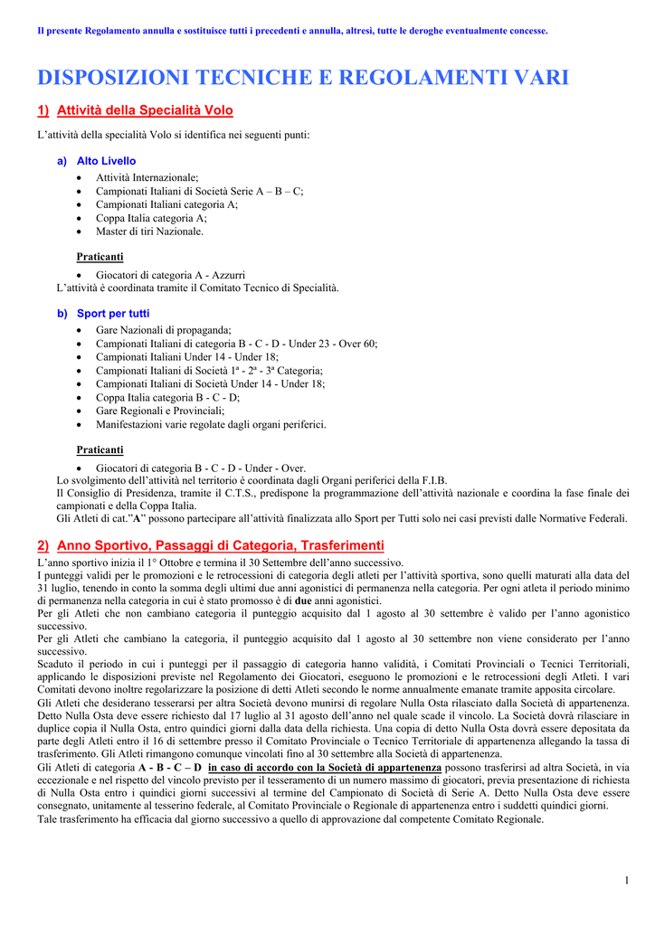 Il presente Regolamento annulla e sostituisce tutti i precedenti e annulla, altresì, tutte le deroghe eventualmente concesse. DISPOSIZIONI TECNICHE E REGOLAMENTI VARI 1) Attività della Specialità Volo L’attività della specialità Volo si identifica nei seguenti punti: a) Alto Livello • • • • • Attività Internazionale; Campionati Italiani di Società Serie A – B – C; Campionati Italiani categoria A; Coppa Italia categoria A; Master di tiri Nazionale. Praticanti • Giocatori di categoria A - Azzurri L’attività è coordinata tramite il Comitato Tecnico di Specialità. b) Sport per tutti • • • • • • • • Gare Nazionali di propaganda; Campionati Italiani di categoria B - C - D - Under 23 - Over 60; Campionati Italiani Under 14 - Under 18; Campionati Italiani di Società 1ª - 2ª - 3ª Categoria; Campionati Italiani di Società Under 14 - Under 18; Coppa Italia categoria B - C - D; Gare Regionali e Provinciali; Manifestazioni varie regolate dagli organi periferici. Praticanti • Giocatori di categoria B - C - D - Under - Over. Lo svolgimento dell’attività nel territorio è coordinata dagli Organi periferici della F.I.B. Il Consiglio di Presidenza, tramite il C.T.S., predispone la programmazione dell’attività nazionale e coordina la fase finale dei campionati e della Coppa Italia. Gli Atleti di cat.”A” possono partecipare all’attività finalizzata allo Sport per Tutti solo nei casi previsti dalle Normative Federali. 2) Anno Sportivo, Passaggi di Categoria, Trasferimenti L’anno sportivo inizia il 1° Ottobre e termina il 30 Settembre dell’anno successivo. I punteggi validi per le promozioni e le retrocessioni di categoria degli atleti per l’attività sportiva, sono quelli maturati alla data del 31 luglio, tenendo in conto la somma degli ultimi due anni agonistici di permanenza nella categoria. Per ogni atleta il periodo minimo di permanenza nella categoria in cui è stato promosso è di due anni agonistici. Per gli Atleti che non cambiano categoria il punteggio acquisito dal 1 agosto al 30 settembre è valido per l’anno agonistico successivo. Per gli Atleti che cambiano la categoria, il punteggio acquisito dal 1 agosto al 30 settembre non viene considerato per l’anno successivo. Scaduto il periodo in cui i punteggi per il passaggio di categoria hanno validità, i Comitati Provinciali o Tecnici Territoriali, applicando le disposizioni previste nel Regolamento dei Giocatori, eseguono le promozioni e le retrocessioni degli Atleti. I vari Comitati devono inoltre regolarizzare la posizione di detti Atleti secondo le norme annualmente emanate tramite apposita circolare. Gli Atleti che desiderano tesserarsi per altra Società devono munirsi di regolare Nulla Osta rilasciato dalla Società di appartenenza. Detto Nulla Osta deve essere richiesto dal 17 luglio al 31 agosto dell’anno nel quale scade il vincolo. La Società dovrà rilasciare in duplice copia il Nulla Osta, entro quindici giorni dalla data della richiesta. Una copia di detto Nulla Osta dovrà essere depositata da parte degli Atleti entro il 16 di settembre presso il Comitato Provinciale o Tecnico Territoriale di appartenenza allegando la tassa di trasferimento. Gli Atleti rimangono comunque vincolati fino al 30 settembre alla Società di appartenenza. Gli Atleti di categoria A - B - C – D in caso di accordo con la Società di appartenenza possono trasferirsi ad altra Società, in via eccezionale e nel rispetto del vincolo previsto per il tesseramento di un numero massimo di giocatori, previa presentazione di richiesta di Nulla Osta entro i quindici giorni successivi al termine del Campionato di Società di Serie A. Detto Nulla Osta deve essere consegnato, unitamente al tesserino federale, al Comitato Provinciale o Regionale di appartenenza entro i suddetti quindici giorni. Tale trasferimento ha efficacia dal giorno successivo a quello di approvazione dal competente Comitato Regionale. 1 3) CAMPIONATI ITALIANI DI SOCIETA’ Si disputano i seguenti Campionati Italiani di Società: Serie A Maschile Serie B Maschile Serie C Maschile Serie Femminile 1ª Categoria 2ª Categoria 3ª Categoria Categoria Under 18 Categoria Under 14 Nazionale Nazionale Nazionale Regionale o Interregionale Regionale o Interregionale Provinciale o Territoriale Provinciale o Territoriale Nazionale Nazionale a) Giocatori Ogni Società potrà tesserare un massimo di dieci giocatori di Categoria “A”, sono esclusi da questa regola i giocatori Granaglia Umberto e Caudera Arrigo nominati dal C.F. ad Honorem di categoria A. Ai Campionati Italiani di Società potranno partecipare tutti i giocatori tesserati nelle categorie “A - B - C - D - Under 18 - Under 14” (Settore Maschile e Femminile) con le seguenti limitazioni: 1) Serie A Minimo 5 e massimo 10 atleti di categoria A 2) Serie B/C Massimo 10 atleti di categoria A 3) Serie Femminile Massimo una di categoria A Per ogni incontro 4) 2ª Categoria Minimo cinque di categoria C Per ogni incontro 5) Under 18 Massimo cinque giocatori Under 18 Per ogni giornata 6) Under 14 Massimo cinque giocatori Under 14 Per ogni giornata Ai Campionati Giovanili potranno partecipare tutti i giocatori tesserati nelle rispettive categorie. Per le Società che partecipano a più di un Campionato di Società è fatto divieto, pena l’esclusione da tutti i Campionati, di utilizzare un Atleta che sia già sceso in campo (anche come sostituto) in una giornata di un Campionato diversa. Tale divieto non si applica agli Under 18, per i Campionati Giovanili, e alla categoria A e B femminile per il Campionato di Società Femminile. Gli Atleti Under 18 che abbiano partecipato, a titolo di prestito, ad un Campionato di Serie per una Società diversa da quella in cui sono tesserati, potranno partecipare con la propria Società, oltre che al Campionato Giovanile, anche ad un Campionato di Categoria. Il giocatore appartenente alle categorie Under 18 o Under 23, può partecipare al Campiona
