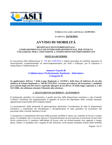 PUBBLICATO ALBO AZIENDALE: 26/09/2016 SCADENZA: 26/10/2016 AVVISO DI MOBILITÁ REGIONALE ED INTERREGIONALE, COMPARTIMENTALE ED INTERCOMPARTIMENTALE, PER TITOLI E COLLOQUIO, PER L’ASSUNZIONE A TEMPO PIENO ED INDETERMINATO POSTI DA RICOPRIRE In esecuzione della deliberazione n° 720 del 23/09/2016 è indetta procedura di mobilità regionale ed interregionale, compartimentale ed intercompartimentale, per titoli e colloquio, per la copertura a tempo pieno e indeterminato di: numero 9 posti di Collaboratore Professionale Sanitario - Infermiere Categoria D In applicazione dell’art. 7 della Legge Regionale n. 22/2010 e delle linee di indirizzo di cui alla delibera di Giunta Regionale n. 198 del 25/2/2011, avranno precedenza all’assunzione i candidati provenienti dagli enti del settore regionale allargato di cui all’art. 25 della legge regionale n. 2 del 24/1/2006, che abbiamo ottenuto l’idoneità alla selezione. 1. TRATTAMENTO GIURIDICO – ECONOMICO Il trattamento giuridico ed economico è quello previsto dalle disposizioni normative e dai Contratti Collettivi Nazionali che regolamentano il rapporto di lavoro dei dipendenti delle Aziende Sanitarie appartenenti al personale del Comparto Sanità. La presentazione della domanda di partecipazione determina l’accettazione di tutte le disposizioni normative e contrattuali che disciplinano o disciplineranno lo stato giuridico ed economico del personale delle Aziende Sanitarie Locali. L’assunzione eventualmente derivante dalla presente mobilità è intesa con contratto di lavoro a tempo pieno. Il candidato che si trovasse (presso l’Amministrazione di provenienza) in posizione di part-time dovrà sottoscrivere il contratto individuale di lavoro solo ed esclusivamente con rapporto a tempo pieno. Inoltre, il candidato che a seguito di tale selezione verrà assunto mediante istituto della mobilità Pagina 1 di 12 dovrà sottoscrivere il contratto individuale di lavoro impegnandosi a non chiedere un’ulteriore mobilità per almeno cinque anni dalla data di decorrenza del contratto stesso. Ai sensi del D. Lgs. 165/01 art. 35 e successive modificazioni ed integrazioni, è garantita parità e pari opportunità tra uomini e donne per l’accesso all’impiego e per il trattamento sul luogo di lavoro. Si precisa che, l’assunzione mediante l’istituto della Mobilità Volontaria, sarà subordinata all’esito negativo delle procedure di mobilità obbligatoria previste dall’art. 34 bis del D.Lgs. n. 165/2001. 2. REQUISITI DI PARTECIPAZIONE Possono partecipare alla mobilità i candidati che siano in possesso di tutti i seguenti requisiti: 1. essere dipendente a tempo indeterminato di una Pubblica Amministrazione, con contratto di lavoro subordinato; 2. essere inquadrato nel profilo professionale di Collaboratore Professionale Sanitario – Infermiere, Categoria D; 3. avere superato il periodo di prova; 4. essere in regola con il pagamento del diritto di segreteria, quale contributo per la copertura delle spese della procedura selettiva; a tal fine il candidato deve allegare alla domanda copia della ricevuta che attesti l’avvenuto versamento, tramite bollettino postale, della somma di € 10,00 (dieci/00), sul CCP n. 1002074209 intestato a ASL 1 IMPERIESE ISCRIZIONE CONCORSI SERVIZIO TESORERIA, con indicazione nella causale dell’avviso per il quale si presenta domanda; 5. la concessione di nullaosta al trasferimento non condizionato da parte dell’Amministrazione di appartenenza con impegno a concedere l’eventuale assenso con decorrenza non superiore a tre mesi a far data dalla comunicazione dell’ASL n. 1; 6. essere in possesso dell’incondizionata idoneità alla mansione specifica. Tutti i suddetti requisiti devono essere posseduti, a pena di esclusione, oltre che alla data di scadenza del termine stabilito nel presente bando, anche alla data del successivo ed effettivo trasferimento. La carenza di uno solo dei requisiti richiesti comporterà la non ammissione alla procedura ovvero, nel caso di carenza riscontrata all’atto del trasferimento, la decadenza dal diritto al trasferimento. Il possesso dei requisiti specifici di cui sopra deve essere documentato esclusivamente mediante autocertificazione ex DPR 445/2000, anche contestuale alla domanda, e nei termini stabiliti nel presente bando, a pena di esclusione. 3. DOMANDA DI AMMISSIONE Nella domanda di ammissione, gli aspiranti, devono dichiarare: Pagina 2 di 12 − il cognome e il nome, il luogo e la data di nascita; − il Comune di residenza; − il nominativo dell’Azienda o Ente Pubblico di appartenenza, il relativo indirizzo della sede legale nonché l’indicazione della Struttura di assegnazione attuale ; − la titolarità di un rapporto di lavoro subordinato di pubblico impiego a tempo indeterminato con inquadramento nel profilo professionale e nella disciplina oggetto della mobilità; − l’avvenuto superamento del periodo di prova; − l’autorizzazione al trattamento manuale/automatizzato dei dati personali ai sensi e per gli effetti del D. Lgs. 196/2003; − eventuale posizione di comando o fuori ruolo presso l’Ente di appartenenza; − il domicilio presso il quale deve, ad ogni effetto, essere fatta ogni necessaria comunicazione. In caso di mancata indicazione vale la residenza indicata. Il candidato assume l’onere di comunicare tempestivamente ogni successivo cambiamento del suddetto domicilio. La domanda deve essere sottoscritta (pena l’esclusione dalla procedura di mobilità). Tale sottoscrizione, ai sensi della legge n. 127/97, non necessita di autentica. La presentazione della domanda di partecipazione comporta l’accettazione, senza riserva, di tutte le prescrizioni e precisazioni del presente bando e di tutte le norme in esso richiamate. 4. MODALITÀ E TERMINI PER LA PRESENTAZIONE DELLE DOMANDE La domanda di partecipazione all’avviso di mobilità deve essere obbligatoriamente compilata per via telematica, con le modalità di seguito indicate, entro