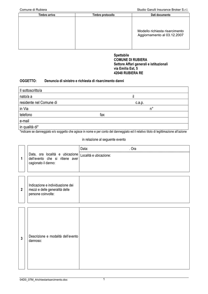 Comune di Rubiera Studio Garulli Insurance Broker S.r.l. Timbro arrivo Timbro protocollo Dati documento Modello richiesta risarcimento Aggiornamento al 03.12.2007 Spettabile COMUNE DI RUBIERA Settore Affari generali e istituzionali via Emilia Est, 5 42048 RUBIERA RE OGGETTO: Denuncia di sinistro e richiesta di risarcimento danni Il sottoscritto/a nato/a a residente nel Comune di in Via telefono e-mail in qualità di* il c.a.p. n° fax *indicare se danneggiato e/o soggetto che agisce in nome e per conto del danneggiato ed il relativo titolo di legittimazione all’azione in relazione al seguente evento Data: . Ora 1 Data, ora località e ubicazione Località e ubicazione: dell’evento che si ritiene aver cagionato il danno: 2 Indicazione e individuazione dei mezzi e delle generalità delle persone coinvolte: 3 Descrizione e modalità dell’evento dannoso: 04D0_07M_4richiestarisarcimento.doc 1 Comune di Rubiera 4 Descrizione della natura e dei danni subiti alle cose e/o alla persona e/o ad entrambi dall’evento descritto: 5 Indicare se l’evento è stato verbalizzato da Autorità Giudiziaria o da altri Enti proposti 6 Indicare gli estremi del documento di identità personale del soggetto che avanza la richiesta di risarcimento Studio Garulli Insurance Broker S.r.l. Autorità intervenuta: Tipo documento Nr. Data di rilascio Ente ________________________________________ ________________________________________ ________________________________________ ________________________________________ CHIEDE il risarcimento dei danni tutti subiti in relazione all’evento sopra indicato, a tale scopo: 1. dichiara di aver patito i seguenti danni patrimoniali, ad oggi quantificabili in complessivi € _______________ come da preventivo/fattura allegato che si riserva di quantificare con successiva documentazione probatoria alla persona ad oggi quantificabili in complessivi € _______________ come da referto medico e documentazione probatoria allegata che si riserva di quantificare con successiva documentazione probatoria 2. allega la seguente documentazione 3. dichiara di avere preso visione dell’informativa sul trattamento dei dati personali. ________________________________ (luogo e data) IL RICHIEDENTE _______________________________ (firma leggibile) 04D0_07M_4richiestarisarcimento.doc 2 Comune di Rubiera Studio Garulli Insurance Broker S.r.l. RICEVUTA DI CONSEGNA DELLA DOMANDA DI RISARCIMENTO DANNI Timbro arrivo Si attesta che in data odierna il sig. / la sig.ra _________________________________________________________ ha presentato la domanda di risarcimento danni. L’addetto alla ricezione delle domande ____________________________ L’Amministrazione Comunale si riserva di accertare la veridicità dei fatti denunciati e dichiarati per i quali il sottoscrittore richiedente avanza la richiesta di risarcimento dei danni patiti. La ricezione della domanda non comporta assunzione di responsabilità da parte dell’Ente, le decisioni in merito spettano alla compagnia assicuratrice. Si richiamano al richiedente gli effetti di cui all’art. 2946 del Codice civile e successivi in materia di prescrizione =================================================================================== INFORMATIVA SUL TRATTAMENTO DEI DATI PERSONALI (articolo 13, D. Lgs. 30 giugno 2003, n° 196) In relazione ai dati raccolti dal Servizio Affari generali e dall’Ufficio Relazioni con il pubblico, si comunica quanto segue: a) Finalità e modalità del trattamento: i dati raccolti sono finalizzati esclusivamente all’istruttoria del procedimento relativo alla richiesta di risarcimento danni e potranno essere trattati con strumenti manuali, informatici e telematici in modo da garantire la sicurezza e la riservatezza dei dati stessi. b) Natura del conferimento dei dati: è obbligatorio fornire i dati richiesti; c) Conseguenze del rifiuto di fornire i dati: in caso di rifiuto non potrà essere effettuata o completata l’istruttoria del procedimento e di conseguenza potrebbe diventare impossibile ottenere il risarcimento richiesto; d) Categorie di soggetti ai quali possono essere comunicati i dati, o che possono venirne a conoscenza: i dati raccolti potranno essere: 1) trattati dai dal Responsabile del Settore, dai dipendenti dei servizi e dai dipendenti del broker assicurativo, nell’ambito delle rispettive competenze, in qualità di incaricati; 2) comunicati ad altri uffici comunali nella misura strettamente necessaria al perseguimento dei fini istituzionali dell’ente, ai sensi dell’art. 18 del D.Lgs. 196/2003 (ad esempio per gli interventi di ripristino); 3) comunicati ad altri soggetti pubblici nel rispetto di quanto previsto dagli articoli 18, 19, 20, 21 e 22 del D. Lgs. 196/2003; 4) comunicati alla compagnia assicurativa competente o agli eventuali legali e periti incaricati della istruttoria della pratica; Gli eventuali dati sensibili o giudiziari acquisiti sono trattati in conformità alla scheda n° 30 del Regolamento relativo al trattamento dei dati sensibili e giudiziari. e) Diritti dell’interessato: L’interessato ha i diritti di cui all’articolo 7 del D.Lgs. 196/2003, sotto riportato. f) Titolare e responsabili del trattamento dei dati: il titolare del trattamento dei dati è il Comune di Rubiera, con sede in via Emilia Est, 5 – 42048 Rubiera (RE). I responsabili del trattamento dei dati sono: 1) in via generale il Responsabile pro-tempore del Settore Affari generali e istituzionali; 2) per quanto riguarda le informazioni necessarie all’istruttoria della pratica il broker assicurativo “Studio Garulli Insurance Broker Srl” con sede in borgo Ronchini, 9 – 43100 Parma (PR); =================================================================================== Art. 7 (Diritto di accesso ai dati personali ed altri diritti) 1. L'interessato ha diritto di ottenere la conferma dell'esistenza o meno di dati personali che lo riguardano, anche se non ancora registrati, e la loro comunicazione in for
