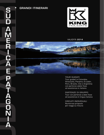 D AMER S U D A M E R I C A E P A T A G O N I A GRANDI ITINERARI VALIDITÀ 2014 TOUR GUIDATI Tour guidati in Colombia, Venezuela, Panama, Ecuador, Perù, Brasile, Cile e Argentina con partenze adate fisse ed assistenza in italiano PARTENZE DI GRUPPO Tour con partenze a date fisse ed assistenza in lingua italiana CIRCUITI INDIVIDUALI Numerose proposte per viaggi su misura C’è un tour operator che riconosci per FORZA. Risultato di un “duro allenamento” quotidiano nel mercato del turismo. REZZA Tutto il know-how e la solidità del gruppo SICUREZZA. ENZA Più di vent’anni di internazionale Es Viagens. ESPERIENZA. storia, in collaborazione con i migliori partner. LUNGIMIRANZA. Nella capacità di vedere oltre i luoghi comuni del viaggio organizzato. TENACIA. Nel perseguire l’obiettivo di offrire valore aggiunto ai Clienti. Ne costruire un’offerta di livello e sviluppare sempre nuove TALENTO. Nel Nel desiderio di soddisfare le Agenzie di Viaggi e i AM proposte. AMBIZIONE. PROFESSIONALITÀ. Nella costruzione degli itinerari e nella loro Clienti. P d destinazioni trattate. AGILITÀ. Nel reagire alle difficoltà conoscenza delle mercato AFFIDABILITÀ. Nella gestione operativa di ogni viaggio, del mercato. curato nei minimi dettagli. PRONTEZZA. Nell’assistenza ai Clienti 24h. KING HOLIDAYS C’È. Con un mondo di qualità da viaggiare. Il nostro obiettivo primario è la vostra soddisfazione. …proprio per questo, abbiamo creato strumenti e vantaggi dedicati ai clienti che scelgono di affidarsi a King Holidays. La classificazione King Holydays Un sistema semplice ed efficace che vi consentirà di individuare immediatamente l’hotel a voi più congeniale. Family Servizi comodi, atmosfera tranquilla, buone offerte economiche e disponibilità di riduzioni per terzo/quarto letto. Charme Tradizione, ospitalità e atmosfera di altri tempi per una vacanza esclusiva e autentica. Young Strutture semplici ed essenziali, spesso ubicate nel cuore del divertimento, ideali per un viaggio economico con gli amici. Premium Eccellenza, ricercatezza ed eleganza, per il clienti che amano il TOP. Mare facile Resort caratterizzati da un facile accesso al mare. I vantaggi King Holidays Giovani dai 60 anni in su Sconto di € 140 a coppia – senza limiti di stagionalità – prenotando almeno 60 giorni prima della partenza. La riduzione si applica sulle proposte segnalate nelle tabelle prezzi dall’apposito logo ed è valida solo per coppie e al 50% per single. Bambini e quote terzo letto esclusi. L’offerta prevede il saldo contestuale alla prenotazione, la sottoscrizione di un contratto specifico e il rimborso fino a 30 giorni prima della partenza, con penale del 20%. Oltre tale data penale 100%. La disponibilità è contingentata. Sconto del 5% riservato a tutti i clienti che hanno compiuto 60 anni. Periodi esclusi: Pasqua e ponti e dal 15/07 al 15/08. Viaggi di nozze Sconto di € 180 a coppia applicabile a tutti i Tour e Itinerari Self Drive senza limitazioni. All’atto della prenotazione è necessario presentare copia delle pubblicazioni di nozze. Il viaggio deve essere effettuato entro i due mesi dalla data del matrimonio. Viaggiare insieme Sconto forfettario di € 160 - senza limiti di stagionalità - per i gruppi composti da un minimo di 8 adulti. ! N.B. Le offerte non sono cumulabili tra loro e sono applicabili esclusivamente ai prodotti a catalogo. Gli sconti non si applicano per gli acquisti di soli servizi a terra. King Holidays Traveller Club Il King Holidays Traveller Club è nato con lo scopo di coccolarvi con piccoli ma preziosi vantaggi. Proprio per questo, in ogni pacchetto inseriamo la nostra Fidelity Card e, in collaborazione con Europ Assistance, una polizza assicurativa bagaglio, spese mediche ed annullamento. La Carta Fedeltà dà diritto ad uno sconto del 5%, senza limiti di stagionalità, su ogni viaggio effettuato entro 12 mesi dall’emissione. Lo sconto è applicabile a vendite da catalogo di pacchetti volo + soggiorno, non è cumulabile con altre iniziative promozionali ed è usufruibile solo presso l’agenzia dove è stato prenotato il primo viaggio. La carta è nominativa e non dà diritto, qualora non utilizzata, a nessuna forma di compensazione in denaro. Per le condizioni complete, garanzie e regolamento relative alla polizza, consultare la sezione Condizioni Generali di questo catalogo. Iscrizione obbligatoria al King Club: € 60,00. King Holidays e Agos Ducato insieme per te. Vacanze personalizzate… anche nel prezzo! Con King Holidays, puoi finalmente realizzare la vacanza dei tuoi sogni con un comodo rimborso rateale. Tutti i vantaggi di un finanziamento rateale SENZA INTERESSI (TAN 0% – TAEG 8,12%): Scegli subito la tua vacanza Puoi finanziare la restante parte con un comodo finanziamento in 6 mesi Versi solo il 25% di acconto del costo del viaggio. Inizierai a pagare la prima rata fino a un mese dopo la partenza Sono finanziabili tutti i viaggi che non usufruiscano già dei VANTAGGI KING HOLIDAYS. -Chiedi informazioni alla tua Agenzia Viaggi. Finanziamento SENZA INTERESSI – in 6 mesi – prima rata a 30 giorni – importo finanziabile da € 860 a € 8.000. Esempio rappresentativo riferito alla casistica più ricorrente per il settore “VIAGGI” relativo al periodo di osservazione gennaio-dicembre: € 1.100 in 6 rate da € 183,33 – TAN fisso 0% TAEG 8,12%% – importo totale del credito € 1.100. Il TAEG rappresenta il costo totale del credito espresso in percentuale annua e include: interessi € 0, imposta di bollo su finanziamento € 16, spesa mensile gestione pratica € 1,50 – importo totale dovuto (importo totale del credito + costo totale del credito) € 1.124,98. Offerta legata alla validità del presente catalogo. Messaggio pubblicitario con finalità promozionale. Per le informazioni precontrattuali richiedere sul punto vendita il documento “Informazioni europee di base sul credito ai consumatori” (SECCI) e copia del testo contra