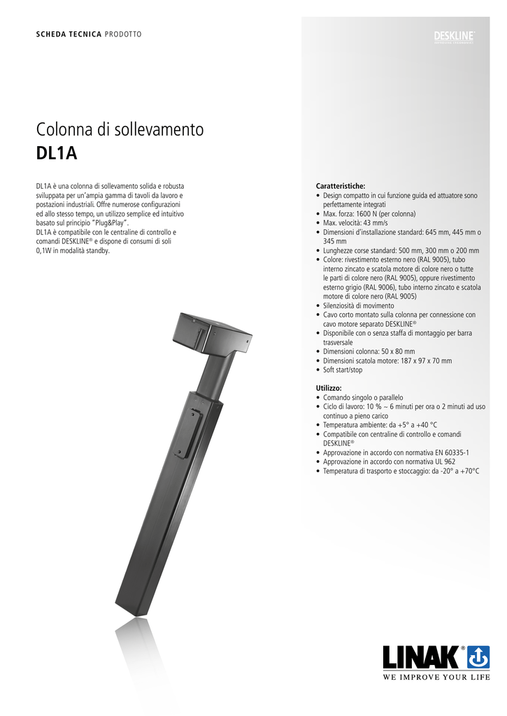 SC HE DA T E CN I CA P R O D OT TO Colonna di sollevamento DL1A DL1A è una colonna di sollevamento solida e robusta sviluppata per un’ampia gamma di tavoli da lavoro e postazioni industriali. Offre numerose configurazioni ed allo stesso tempo, un utilizzo semplice ed intuitivo basato sul principio “Plug&Play”. DL1A è compatibile con le centraline di controllo e comandi DESKLINE® e dispone di consumi di soli 0,1W in modalità standby. Caratteristiche: • Design compatto in cui funzione guida ed attuatore sono perfettamente integrati • Max. forza: 1600 N (per colonna) • Max. velocità: 43 mm/s • Dimensioni d’installazione standard: 645 mm, 445 mm o 345 mm • Lunghezze corse standard: 500 mm, 300 mm o 200 mm • Colore: rivestimento esterno nero (RAL 9005), tubo interno zincato e scatola motore di colore nero o tutte le parti di colore nero (RAL 9005), oppure rivestimento esterno grigio (RAL 9006), tubo interno zincato e scatola motore di colore nero (RAL 9005) • Silenziosità di movimento • Cavo corto montato sulla colonna per connessione con cavo motore separato DESKLINE® • Disponibile con o senza staffa di montaggio per barra trasversale • Dimensioni colonna: 50 x 80 mm • Dimensioni scatola motore: 187 x 97 x 70 mm • Soft start/stop Utilizzo: • Comando singolo o parallelo • Ciclo di lavoro: 10 % ~ 6 minuti per ora o 2 minuti ad uso continuo a pieno carico • Temperatura ambiente: da +5° a +40 °C • Compatibile con centraline di controllo e comandi DESKLINE® • Approvazione in accordo con normativa EN 60335-1 • Approvazione in accordo con normativa UL 962 • Temperatura di trasporto e stoccaggio: da -20° a +70°C Specifiche tecniche: Tipo Max. forza per DL1A Velocità a vuoto [mm/s] Ciclo di lavoro [%] Pistone [mm] DL1A 1600 43 10 15 Misurazioni effettuate con centralina CBD4. Il sistema deve essere configurato prima del suo utilizzo. Dimensioni [mm]: +6 1145 - 2 590 +4 645 0 120 2 x M8 40 +1 80 0 100 17.5 4 x M6 58 145 36 187 8 34 +1 50 0 17.4 29.4 4 x M6 R5 46.5 45 ° 70 63 97 2 x M6 17.5 157±5 LINAK A/S DL1001E Grafici velocità Sistema con 2 colonne in parallelo: 50 45 40 35 [mm/s] 30 CBD6 25 CBD5 CBD4 200 W CBD4 300 W 20 15 10 5 0 0N 800 N 1200 N 1600 N 2000 N 2400 N 2800 N 3200 N Sistema con 3 colonne in parallelo: 50 45 40 35 [mm/s] 30 25 CBD4 20 15 10 5 0 0N 1200 N 1800 N 3000 N 3600 N 4200 N 4800 N Sistema con 4 colonne in parallelo: 50 45 40 35 [mm/s] 30 25 CBD4 20 15 10 5 0 0N 1600 N 2400 N 3200 N 4000 N 4800 N 5600 N DL1A Esempio d’ordine: DL1A 5 0 1 A 0 0 500 645 Dim. d’installazione 645 = 645 mm 445 = 445 mm 345 = 345 mm Corsa 500 = 500 mm 300 = 300 mm 200 = 200 mm Tipo motore 0 = Standard Standard 0 = Standard Colore A B C Tubo esterno Nero Nero Grigio Tubo interno Zincato Nero Zincato Scatola motore Nera Nera Nera Staffa di montaggio 0 = Nessuna 1 = 120 x 40 x 8 mm con 2 viti M8 Fori di fissaggio 0 = 6 x M6 Passo pistone 5 = 15 mm Tipo DL1A Cavo motore: XL Codici articoli 0617102-0200 0617102-0500 0617102-1000 0617102-1550 0617110-2000 0617110-2500 Copyright © LINAK 2016.07 . MA M9-02-411-B . Chapter 5.1.2 I cavi motore devono essere ordinati separatamente. Descrizione L = Cavo motore nero 200 mm, PVC free L = Cavo motore nero 500 mm, PVC free L = Cavo motore nero 1000 mm, PVC free L = Cavo motore nero 1550 mm, PVC free L = Cavo motore nero 2000 mm, PVC free L = Cavo motore nero 2500 mm, PVC free LINAK si riserva il diritto di apportare modifiche senza preavviso. E’ responsabilità dell’utilizzatore di verificare la compatibilità dei prodotti LINAK con l’applicazione prevista. LINAK provvederà a sostituire/riparare i prodotti difettosi coperti da garanzia se prontamente resi. Non si assumono ulteriori responsabilità. LINAK ITALIA Srl Via del Commercio, 27 20090 Buccinasco (MI) T. 02 48 46 33 66 F. 02 48 46 82 52 [email protected] www.linak.it P E R I S T R U Z I O N I D I M O N T A G G I O E G U I D A D ’ U T I L I Z Z O , C O N S U LT A R E I L R E L A T I V O M A N U A L E D ’ U S O .