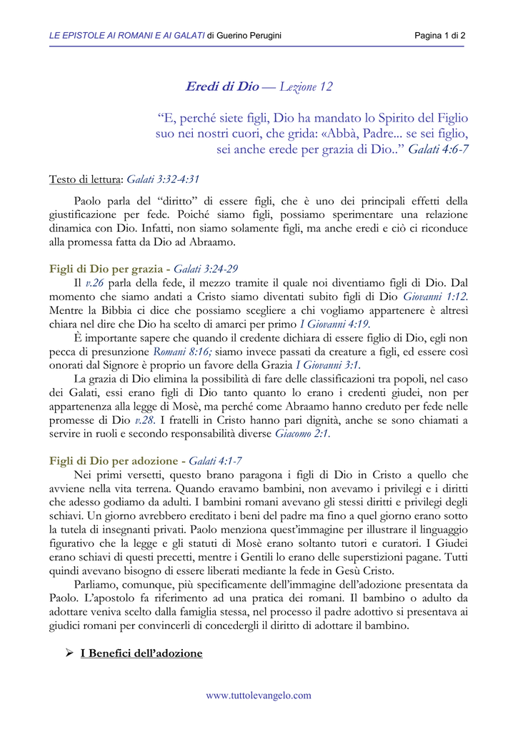LE EPISTOLE AI ROMANI E AI GALATI di Guerino Perugini Pagina 1 di 2 Eredi di Dio — Lezione 12 “E, perché siete figli, Dio ha mandato lo Spirito del Figlio suo nei nostri cuori, che grida: «Abbà, Padre... se sei figlio, sei anche erede per grazia di Dio..” Galati 4:6-7 Testo di lettura: Galati 3:32-4:31 Paolo parla del “diritto” di essere figli, che è uno dei principali effetti della giustificazione per fede. Poiché siamo figli, possiamo sperimentare una relazione dinamica con Dio. Infatti, non siamo solamente figli, ma anche eredi e ciò ci riconduce alla promessa fatta da Dio ad Abraamo. Figli di Dio per grazia - Galati 3:24-29 Il v.26 parla della fede, il mezzo tramite il quale noi diventiamo figli di Dio. Dal momento che siamo andati a Cristo siamo diventati subito figli di Dio Giovanni 1:12. Mentre la Bibbia ci dice che possiamo scegliere a chi vogliamo appartenere è altresì chiara nel dire che Dio ha scelto di amarci per primo I Giovanni 4:19. È importante sapere che quando il credente dichiara di essere figlio di Dio, egli non pecca di presunzione Romani 8:16; siamo invece passati da creature a figli, ed essere così onorati dal Signore è proprio un favore della Grazia I Giovanni 3:1. La grazia di Dio elimina la possibilità di fare delle classificazioni tra popoli, nel caso dei Galati, essi erano figli di Dio tanto quanto lo erano i credenti giudei, non per appartenenza alla legge di Mosè, ma perché come Abraamo hanno creduto per fede nelle promesse di Dio v.28. I fratelli in Cristo hanno pari dignità, anche se sono chiamati a servire in ruoli e secondo responsabilità diverse Giacomo 2:1. Figli di Dio per adozione - Galati 4:1-7 Nei primi versetti, questo brano paragona i figli di Dio in Cristo a quello che avviene nella vita terrena. Quando eravamo bambini, non avevamo i privilegi e i diritti che adesso godiamo da adulti. I bambini romani avevano gli stessi diritti e privilegi degli schiavi. Un giorno avrebbero ereditato i beni del padre ma fino a quel giorno erano sotto la tutela di insegnanti privati. Paolo menziona quest’immagine per illustrare il linguaggio figurativo che la legge e gli statuti di Mosè erano soltanto tutori e curatori. I Giudei erano schiavi di questi precetti, mentre i Gentili lo erano delle superstizioni pagane. Tutti quindi avevano bisogno di essere liberati mediante la fede in Gesù Cristo. Parliamo, comunque, più specificamente dell’immagine dell’adozione presentata da Paolo. L’apostolo fa riferimento ad una pratica dei romani. Il bambino o adulto da adottare veniva scelto dalla famiglia stessa, nel processo il padre adottivo si presentava ai giudici romani per convincerli di concedergli il diritto di adottare il bambino. I Benefici dell’adozione www.tuttolevangelo.com LE EPISTOLE AI ROMANI E AI GALATI di Guerino Perugini Pagina 2 di 2 Agli occhi della Legge chi veniva adottato era considerato una nuova persona, a tale punto che qualsiasi debito o obbligo collegato alla sua vecchia famiglia veniva cancellato 2 Corinzi 5:17. Il processo di adozione poteva essere particolarmente costoso, lo può essere ancora oggi. Dio ci ha adottati pagando un costo elevato I Corinzi 6:20; I Pietro 1:18-19. Nel diventare del Signore abbiamo come conseguenza un qualcuno di grande valore che dimora in noi I Corinzi 6:19; Romani 8:11. Questa verità offre al credente la potenza di Dio per affrontare le difficoltà della vita I Giovanni 4:4. Si diventa eredi di Dio. Con questo possiamo dire di perpetuare il Suo nome. Noi portiamo il nome di Dio, siamo chiamati cristiani perché apparteniamo a Cristo Atti 11:26. Come eredi abbiamo un’eredità, per poterla ricevere qualcuno doveva prima morire, Cristo è morto dandoci accesso a tutte le benedizioni di Dio Efesini 1:3. Non solo pensiamo quindi a delle benedizioni future ma possiamo aspettare che Dio provveda per noi anche al presente Filippesi 4:19; Romani 8:32 (illustrazione del miliardario) Siamo liberati dal timore, figli senza un padre hanno motivo per temere, il credente invece ha qualcuno a cui gridare Romani 8:15. L’espressione “Non temere” viene espressa 365 volte nella Bibbia, una per ogni giorno dell’anno. Figli di Dio per promessa - Galati 4:21-31 Nell’ultima parte del capitolo 4 Paolo ricorda la storia di Abraamo, di Sara e di Agar, riportata in Genesi 21:8-21. Mentre Agar rappresenta l’Antico Patto, Sara rappresenta il Nuovo. Agar, essendo serva di Sara, è chiamata la “schiava”, mentre Sara è una “donna libera”. La nascita di Ismaele da parte di Agar, rappresenta Abraamo che vuole, con i propri sforzi, adempiere la promessa di Dio, mentre avrebbe dovuto porre semplicemente fede nell’opera divina. Un esempio che dipinge esattamente ciò che i giudaizzanti cercavano di fare ed insegnare. Sara partorì a un’età particolarmente avanzata, nella quale era umanamente impossibile che avvenissero concepimenti. Dio permise ciò proprio per dimostrare che Isacco era il figlio attraverso cui la promessa si sarebbe adempiuta. Paolo con tutto questo sottolinea che coloro che vogliono seguire la Legge, non possono essere eredi con quanti sono figli della promessa; per questo l’apostolo esorta a cacciare via allo stesso modo chi accoglie il messaggio dei giudaizzanti. Come guida: Manuale di Studio per le Scuole Domenicali A.D.I. www.tuttolevangelo.com