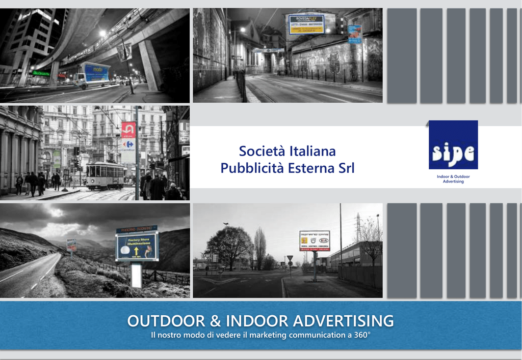 Società Italiana Pubblicità Esterna Srl OUTDOOR & INDOOR ADVERTISING Il nostro modo di vedere il marketing communication a 360° Indoor & Outdoor Advertising La nostra storia… Un po’ di noi. Indoor & Outdoor Advertising La Società Italiana Pubblicità Esterna (SIPE srl), nasce nel 1995 dall'unione di alcuni imprenditori già affermati da oltre dieci anni nel campo della comunicazione outdoor. Per scelta aziendale resta una Società a carattere Regionale, così da mantener una struttura agile, dinamica ma comunque in grado di soddisfare qualsiasi realtà economica anche attraverso sinergie ormai enormemente collaudate. Da sempre operiamo avvalendoci di impianti pubblicitari di diverse tipologie di cui la maggior parte di ns. proprietà, garantendo e perseguendo per la ns. clientela la massima soddisfazione. La comunicazione permanente e temporanea da noi realizzata viene sempre diretta allo specifico target che ci siamo prefissati, grazie alla grandissima esperienza che abbiamo accumulato ed alla profonda conoscenza del territorio nel quale lavoriamo. Da sempre cerchiamo di capire ed anticipare le logiche della mobilità stradale così da non farci trovare impreparati davanti alla normale evoluzione del territorio. VERSATILITA’ Indoor & Outdoor Advertising L'unione di tantissime esperienze e talenti diversi, accresce la nostra forza. Il continuo inserimento in azienda di personale giovane e motivato formato da addetti di elevata professionalità, permette di mantenerci sempre in linea con il mondo che cambia ed a non dimenticare che le nuove tecnologie sono sempre uno strumento per migliorare i ns. servizi. Tutte questo, unito alla elevata capacità progettuale sviluppata da alcuni dei ns. collaboratori ci permette di offrire una vasta gamma di prodotti e servizi sempre mirati al target da raggiungere. PRODOTTI Indoor & Outdoor Advertising Gli strumenti pubblicitari da noi utilizzati e realizzati sono principalmente: - - Insegne di Esercizio Cartelli stradali Poster Totem Impianti a messaggio variabile Vertical banner Tabelle e targhe Velabus Segnaletica Direzionale e di Servizio PRODOTTI Insegne d’esercizio Il posizionamento di insegne di Esercizio è sempre soggetto ad Autorizzazione Amministrativa dagli Enti Proprietari delle Strade. Per insegna di esercizio si intendono le scritte, tabelle e simili esposti esclusivamente nella sede e nelle pertinenze di un esercizio commerciali e/o industriale, che contengono unicamente il nome della Ditta e l'indicazione generica delle merci vendute o fabbricate o dei servizi che vengono prestati. Possono essere costituite da vetrofanie, iscrizioni dipinte o comunque riportate su qualsivoglia supporto, targhe, pannelli, fili di neon, lettere scatolate, intagliate o comunque applicate. Un nostro esempio Indoor & Outdoor Advertising PRODOTTI Cartelli stradali Ė il metodo più tradizionale ed efficiente per la diffusione capillare sul territorio del messaggio pubblicitario perchè consente, a costi contenuti, una visibilità continua e che può essere reiterata su vaste aree. Il design essenziale, abbinato a scelte grafiche su cui possiamo fornire indicazioni a richiesta, esaltano il messaggio pubblicitario. Un nostro esempio Indoor & Outdoor Advertising PRODOTTI Poster Quando è richiesto un grande impatto visivo, diventa necessario utilizzare spazi che per le loro grandi dimensioni attraggono l'attenzione. Collocati in posizioni strategiche dove l'affluenza è elevata offrono una grande effetto. Questi impianti possono essere collocati in maniera permanente o temporanea, anche in numero elevato per enfatizzare la proposta commerciale su aree medio grandi. Un nostro esempio Indoor & Outdoor Advertising PRODOTTI Totem Il totem è un impianto di grande prestigio per imporre sul mercato il proprio marchio pubblicitario. È costituito da un palo di grandi dimensioni ed altezza che sostiene due o tre facce espositive. Viene collocato in punti strategici ed a garanzia di alta visibilità è sempre illuminato. Un nostro esempio Indoor & Outdoor Advertising PRODOTTI Impianti a messaggio variabile Luce e movimento catturano l'attenzione. Questi tipi di impianto possono ospitare più messaggi pubblicitari e con diverse tipologie di strumentazione elettro-meccanica garantiscono grande visibilità anche durante le ore serali. È possibile cambiare velocemente le grafiche esposte, consentendo perciò una comunicazione temporanea molto efficace. Sul tipo a Led è possibile ospitare brevi spot di tipo video. Un nostro esempio Indoor & Outdoor Advertising PRODOTTI Vertical banner Strumento molto efficace di comunicazione esterna, estremamente valido anche per campagne temporanee che necessitano di coperture specifiche in quanto permette di essere pianificato secondo le esigenze del cliente. La possibilità di essere collocato in sequenza aumenta in maniera esponenziale la visibilità del messaggio. Utilizzato nel territorio Comunale di Milano. Gli spazi, essendo per la maggior parte collocati su marciapiede, diventano utilissimi anche per il transito pedonale Un nostro esempio Indoor & Outdoor Advertising PRODOTTI Vertical banner – circuiti completi Indoor & Outdoor Advertising Disponiamo di un paio di circuiti già confezionati, ma restiamo disponibili a cercare per il cliente il proprio circuito personalizzato, composto anche di pochi elementi. La mappa PRODOTTI Tabelle e targhe Laddove non è necessario veicolare il messaggio pubblicitario attraverso grandi dimensioni, riusciamo a collocare per i ns. clienti, tabelle stradali di varie dimensioni. Le stesse trovano collocazione su terreno oppure sui pali della luce Un nostro esempio Indoor & Outdoor Advertising PRODOTTI Velabus Per campagne itineranti e mirate resta il migliore strumento in quanto porta il messaggio lì dove spesso i classici strumenti pubblicitari non arrivano. Pianificato con attenzione riesce a dare copertura specifica dove è richiesta rendendo pertanto l’investimento effettuato 