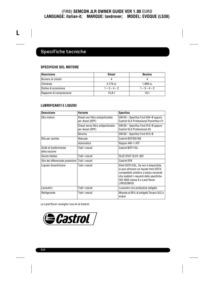 (FM8) SEMCON JLR OWNER GUIDE VER 1.00 EURO LANGUAGE: italian-it; MARQUE: landrover; MODEL: EVOQUE (L538) L Specifiche tecniche SPECIFICHE DEL MOTORE Specifiche tecniche Descrizione Numero di cilindri Cilindrata Ordine di accensione Rapporto di compressione Diesel Benzina 4 4 2.179 cc 1.999 cc 1–3–4–2 1–3–4–2 15,8:1 10:1 LUBRIFICANTI E LIQUIDI Descrizione Variante Specifica Olio motore Diesel con filtro antiparticolato per diesel (DPF) 5W/30 – Specifica Ford 934–B oppure Castrol SLX Professional Powerflow C1 Diesel senza filtro antiparticolato per diesel (DPF) 5W/30 – Specifica Ford 913–B oppure Castrol SLX Professional A5 Benzina 5W/30 – Specifica Ford 913–B Manuale Castrol BOT350 M3 Automatico Nippon AW–1 ATF Unità di trasferimento della trazione Tutti i veicoli Castrol BOT118+ Giunto Haldex Tutti i veicoli Olio per cambio OLIO STAT SL01–301 Olio del differenziale posteriore Tutti i veicoli Castrol EPX Liquido freno/frizione Tutti i veicoli Shell DOT4 ESL. Se non è disponibile, si può utilizzare un liquido freni DOT4 compatibile sintetico a bassa viscosità che soddisfi i requisiti delle specifiche ISO 4925 classe 6 e Land Rover LRES22BF03. Lavavetro Tutti i veicoli Lavavetro con protezione antigelo Refrigerante Tutti i veicoli Miscela al 50% di antigelo Texaco XLC e acqua La Land Rover consiglia l’uso di oli Castrol. 214 (FM8) SEMCON JLR OWNER GUIDE VER 1.00 EURO LANGUAGE: italian-it; MARQUE: landrover; MODEL: EVOQUE (L538) R Specifiche tecniche CAPACITÀ Voce Variante Serbatoio del carburante Diesel 60 litri (13,2 galloni) Capacità Benzina 70 litri (15,4 galloni) Rifornimento di olio motore e cambio del filtro Diesel 5,9 litri (10,4 pinte) Benzina 5,6 litri (9,9 pinte) Cambio Manuale 2,0 litri (3,5 pinte) Automatico 7 litri (12,3 pinte) Tutti i veicoli 0,75 litri (1,3 pinte) Giunto Haldex Tutti i veicoli 0,65 litri (1,1 pinte) Differenziale posteriore Tutti i veicoli 0,7 litri (1,2 pinte) Serbatoio del lavavetro Con lavafari 4,2 litri (7,4 pinte) Senza lavafari 3,1 litri (5,5 pinte) Unità di trasferimento della trazione Sistema di raffreddamento (scarico e riempimento) Diesel: Manuale, con riscaldatore ausiliario 5,6 litri (9,9 pinte) Manuale, senza riscaldatore ausiliario 5,4 litri (9,5 pinte) Automatico, con riscaldatore ausiliario 5,9 litri (10,4 pinte) Automatico, senza riscaldatore ausiliario 5,7 litri (10,0 pinte) Benzina: Con riscaldatore ausiliario 4,6 litri (8,1 pinte) Senza riscaldatore ausiliario 4,4 litri (7,7 pinte) Le capacità indicate sono approssimative e servono solo come riferimento generale. Tutti i livelli devono essere controllati con i segni di livello, il tappo di livello o il modulo informazioni guidatore, a seconda dei casi. 215 (FM8) SEMCON JLR OWNER GUIDE VER 1.00 EURO LANGUAGE: italian-it; MARQUE: landrover; MODEL: EVOQUE (L538) L Specifiche tecniche PESI Peso veicolo a partire da Peso lordo del veicolo (GVW) ¹ Peso di traino lordo (GTW) ² 1.640 kg (3.615 lb) 2.350 kg (5.180 lb) 4.150 kg (9.150 lb) ¹ Peso massimo ammesso del veicolo, inclusi i passeggeri e il carico. ² Peso massimo ammesso del veicolo e del rimorchio frenato, inclusi i rispettivi carichi. Nota: per ogni aumento di 1.000 m di altitudine sul livello del mare, il peso di traino lordo (GTW) deve essere ridotto del 10%. Carico massimo sull’assale anteriore ¹ Carico massimo sull’assale posteriore ¹ Carico massimo sul portapacchi ² Carico utile massimo ³ 1.300 kg (2.865 lb) 1.145 kg (2.525 lb) 75 kg (165 lb) 500 kg (1.100 lb) ¹ Non è possibile raggiungere contemporaneamente il carico massimo sia sull’assale anteriore che sull’assale posteriore, in quanto si supererebbe il limite GVW. ² Questo valore include il peso del portapacchi. ³ Gli optional installati sul veicolo influiscono sul carico utile massimo. DATI DI ALLINEAMENTO DELLE RUOTE (CINA) Allineamento delle ruote – convergenza/divergenza anteriore +0,22° Allineamento delle ruote – convergenza/divergenza posteriore +0,18° Campanatura – anteriore –0,51° Campanatura – posteriore –1,25° 216 CORSA DEL PEDALE (CINA) La corsa del pedale del freno e quella del pedale della frizione vengono impostate in fabbrica e non sono regolabili. (FM8) SEMCON JLR OWNER GUIDE VER 1.00 EURO LANGUAGE: italian-it; MARQUE: landrover; MODEL: EVOQUE (L538) R Specifiche tecniche DIMENSIONI – COUPÉ E 5 PORTE Voce 1 2 mm (pollici) Gradi Larghezza (con gli specchietti retrovisori esterni in posizione normale) Descrizione 2.125 (83,7) – Larghezza (con gli specchietti retrovisori esterni ripiegati) 1.965 (77,4) – Altezza – Coupé / 5 porte 1.605/1.635 (63,2/64,4) Altezza con le barre del tetto – Coupé / 5 porte 1.610/1.640 (63,4/64,6) Altezza con le barre del tetto e le barre trasversali – Coupé / 5 porte 1.690/1.720 (66,5/67,7) – 3 Angolo di attacco – Puro/dinamico – 25°/19° 4 Angolo di dosso – 22° Angolo di uscita – Puro/dinamico – 33°/30° Angolo di uscita con sfera di traino staccabile – 22° 2.660 (104,8) – 4.355/4.365 (171,5/171,9) – 5 6 Passo 7 Lunghezza (esclusa la base della targa) – Pura/dinamica 8 Carreggiata – anteriore 1.625 (63,9) – Carreggiata – posteriore 1.630 (64,2) – – Profondità di guado massima 500 (19,7) – – Altezza minima da terra 212 (8,3) – – Diametro di svolta (da marciapiede a marciapiede) 11,3 m (37,1 ft) – 217 (FM8) SEMCON JLR OWNER GUIDE VER 1.00 EURO LANGUAGE: italian-it; MARQUE: landrover; MODEL: EVOQUE (L538) L Specifiche tecniche TABELLA DELLE SPECIFICHE DELLE LAMPADINE Prima di procedere alla sostituzione di una lampadina, verificare che la luce interessata sia spenta e che l’accensione del veicolo sia stata disinserita. Se il circuito rimane in tensione, si può verificare un corto circuito con conseguente danneggiamento del sistema elettrico del veicolo. Nota: le lampadine LED possono essere sostituite solo da un concessionario Land Rover/riparatore autorizzato. Luce Specifica Potenza (W) Faro alogeno (ana