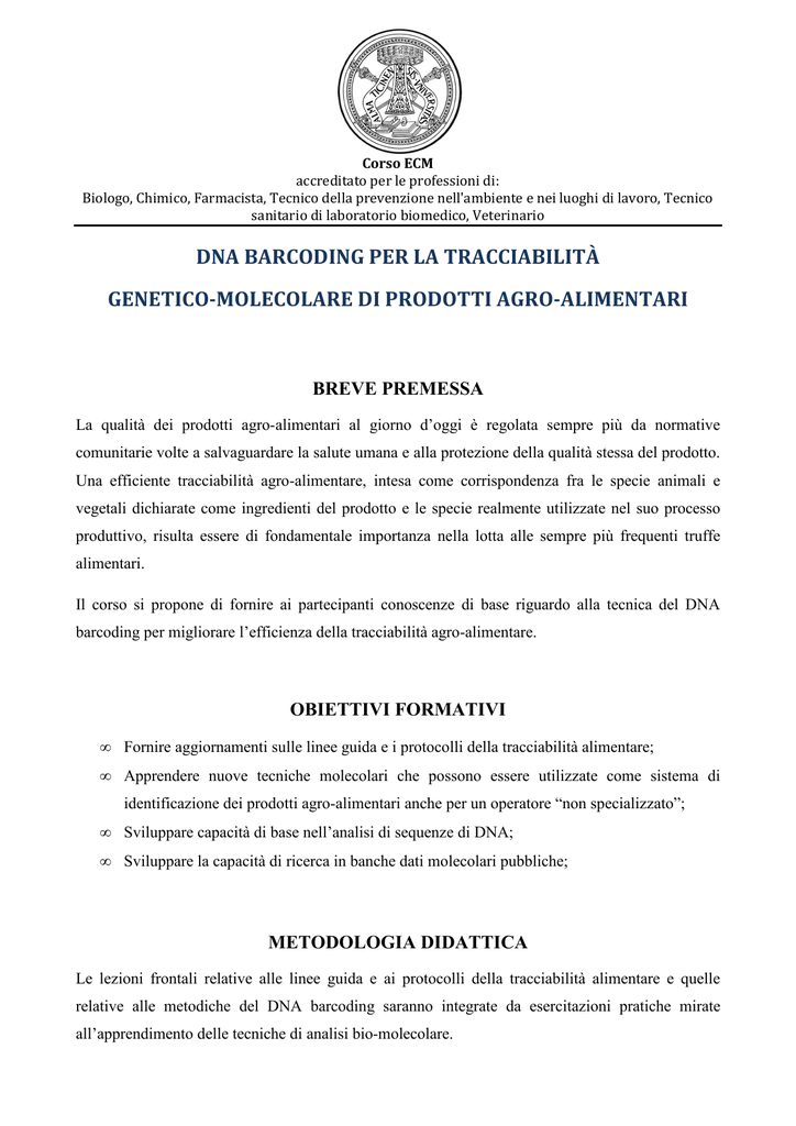 Corso ECM accreditato per le professioni di: Biologo, Chimico, Farmacista, Tecnico della prevenzione nell'ambiente e nei luoghi di lavoro, Tecnico sanitario di laboratorio biomedico, Veterinario DNA BARCODING PER LA TRACCIABILITÀ GENETICO-MOLECOLARE DI PRODOTTI AGRO-ALIMENTARI BREVE PREMESSA La qualità dei prodotti agro-alimentari al giorno d’oggi è regolata sempre più da normative comunitarie volte a salvaguardare la salute umana e alla protezione della qualità stessa del prodotto. Una efficiente tracciabilità agro-alimentare, intesa come corrispondenza fra le specie animali e vegetali dichiarate come ingredienti del prodotto e le specie realmente utilizzate nel suo processo produttivo, risulta essere di fondamentale importanza nella lotta alle sempre più frequenti truffe alimentari. Il corso si propone di fornire ai partecipanti conoscenze di base riguardo alla tecnica del DNA barcoding per migliorare l’efficienza della tracciabilità agro-alimentare. OBIETTIVI FORMATIVI • Fornire aggiornamenti sulle linee guida e i protocolli della tracciabilità alimentare; • Apprendere nuove tecniche molecolari che possono essere utilizzate come sistema di identificazione dei prodotti agro-alimentari anche per un operatore “non specializzato”; • Sviluppare capacità di base nell’analisi di sequenze di DNA; • Sviluppare la capacità di ricerca in banche dati molecolari pubbliche; METODOLOGIA DIDATTICA Le lezioni frontali relative alle linee guida e ai protocolli della tracciabilità alimentare e quelle relative alle metodiche del DNA barcoding saranno integrate da esercitazioni pratiche mirate all’apprendimento delle tecniche di analisi bio-molecolare. Il supporto di un laboratorio attrezzato per le analisi genetiche permetterà di sperimentare direttamente quanto appreso durante le lezioni frontali. Ad ogni partecipante sarà fornito il materiale a supporto delle lezioni e dell’attività di laboratorio, tra cui una dispensa, corredata da bibliografia. DESTINATARI AZIENDA CATEGORIA PROFESSIONALE Biologo, Chimico, Farmacista, Tecnico della prevenzione nell'ambiente e nei luoghi di lavoro, Tecnico sanitario di laboratorio biomedico, Veterinario TOTALE PARTECIPANTI NUMERO PARTECIPANTI Max 25 Max 25 PROGRAMMA Ore Ore Ore ORARIO 08:30 – 08:45 08:45 – 09:00 09:00 – 10:15 Ore Ore Ore Ore Ore Ore 10:15– 11:30 11:30 – 11:45 11:45 – 12:45 12:45 – 13:00 13:00 – 14:00 14:00 – 16:00 Ore Ore 16:00 – 16:15 16:15 – 18:15 Ore 18:15 – 18:30 GIORNO 10 MARZO 2012 CONTENUTI Registrazione dei partecipanti Presentazione del corso Introduzione alla tracciabilità agro-alimentare Il DNA-barcoding Coffee break Applicazioni DNA-barcoding Confronto dibattito Pausa pranzo Esercitazione di laboratorio genetico Coffee break Esercitazione di laboratorio genetico Prova finale DOCENTI/RELATORI Dott.ssa Enrica Capelli Dott. Augusto Gentilli Dott. Maurizio Casiraghi Dott. Maurizio Casiraghi Dott.ssa Adriana Bellati Dott.ssa Adriana Bellati ABSTRACT DELLE RELAZIONI INTRODUZIONE ALLA TRACCIABILITÀ AGRO-ALIMENTARE Augusto Gentilli Questi ultimi anni hanno visto un fortissimo aumento dell’attenzione dei consumatori nei confronti della qualità dei prodotti enogastronomici. Questa nuova tendenza ha avuto come conseguenza, più che positiva, il proliferare di marchi di qualità talvolta riconosciuti in ambito internazionale (DOP, IGP, DOCG, DOC, IGT, STG) altri a livello nazionale o locale (Presidi Slow Food, De.Co., prodotti dei Parchi, ecc); a questi si aggiungono i prodotti biologici o biodinamici certificati da Enti privati autorizzati. Un tale aumento di marchi e conseguenti disciplinari di produzione ha, purtroppo, portato talvolta con sé l’impossibilità di verificare il rispetto delle norme produttive previste dai disciplinari stessi nonché l’impossibilità da parte del consumatore di essere garantito, non solo sulla salubrità del prodotto, ma anche sul corretto costo in relazione alle caratteristiche organolettiche e produttive dello stesso. Si rende quindi evidente che la messa a punto di tecniche veloci, sicure e standardizzate per verificare almeno alcuni di tali aspetti sarebbe di grande aiuto e sostegno sia per i consumatori sia per i produttori che si preoccupano realmente di fornire prodotti di alta qualità. In tal senso l’approccio più adatto attualmente disponibile sembra essere quello biomolecolare e, in particolare, la tecnica del DNA – barcoding. Tale tecnica rende possibile, ad esempio, non solo la determinazione esatta della specie a cui appartengono determinate carni (vacca, zebù, capra, pecora, tonno, nasello, ecc.) ma anche l’identificazione della razza (ad esempio fassona, chianina, limousine). È evidente l’importanza di poter riconoscere, ad esempio, una bresaola IGP prodotta legalmente con carne di zebù da una artigianale derivante da carni di razze bovine autoctone e di qualità. Inoltre, recenti ricerche stanno mettendo a punto nuove tecniche anche per prodotti lavorati in cui siano potenzialmente presenti una o più varietà di una determinata materia prima (ad esempio formaggi di latte misto vaccino e caprino come il bitto DOP oppure vini monovitigno quali il Brunello di Montalcino DOCG che dovrebbe essere prodotto con il solo Sangiovese grosso ma che è noto essere talvolta ingentilito mediante l’aggiunta di merlot o di altri vitigni internazionali.). Considerato l’elevato costo di alcuni di questi prodotti è fondamentale tutelare i diritti sia dei consumatori sia dei produttori seri che, con sacrifici e fatica, portano avanti onestamente politiche di qualità. DNA-BARCODING E APPLICAZIONI Maurizio Casiraghi Il DNA barcoding è una tecnica molecolare che ambisce al difficile scopo di identificare le specie biologiche. Sebbene esistessero già tecniche molecolari per l’identificazione degli organismi viventi, il canadese Paul H.Hebert propose l’approccio DNA barcoding nel 2003, puntando sull’analogia tra il codice a barre d