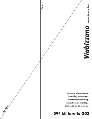 progettiamo la luce Viabizzuno For m istruzioni di montaggio installing instructions Gebrauchsanweisung Al va lin e instructions de montage instrucciones de montaje 094 kit faretto G53 IT AVVERTENZE: All’atto dell’installazione, ed ogni volta che si interviene sulla lampada, assicurarsi che sia stata tolta la tensione di alimentazione. Le operazioni di installazione e collegamento alla rete elettrica devono essere effettuate esclusivamente da personale qualificato. GB WARNING: When installing fixture and during unkeep take care that the mains voltage is switched off. The operations of installation and connection to power mains should be done by skilled personnel only. DE HINWEISE: Während der Installation und bei allen nachfolgenden Arbeiten auf der Lampe sollte sichergestellt werden, daß die Versorgungsspannung vorher abgenommen wurde. Die Arbeiten zur Installation und zum Anschluss an das Stromnetz sind von Fachpersonal durchzuführen. FR AVVERTISSEMENTS: Lors de l’installation et à chaque fois que l’on fait un entretien sur la lampe, s’assurer que la tension d’alimentation ait été coupée. Les opérations d’installation et de branchement au réseau électrique doivent être effectuées par un personnel qualifié. ES ADVERTENCIA: Durante la instalación, y cada ve que se interviene sobre la lámpara, asegurarse que la alimentación haya sido desconectada. Las operaciones de instalación y conexión a la red eléctrica tienen que ser efectuadas exclusivamente por personal cualificado. IT ATTENZIONE: La sicurezza dell’apparecchio è garantita solo rispettando queste istruzioni sia in fase di installazione che di impiego. GB WARNING: Fitting safety is only guaranteed if the following instructionsare strictly observed both during installation and use. DE ACHTUNG: Für die Sicherheit des Geräts kann nur dann die Garantie übernommen werden, wenn die in den vorliegenden Anweisungen enthaltenen Hinweise sowohl bei der Installation als auch beim Betrieb beachtet werden. FR ATTENTION: La sécurité de l’appareil n’est assurée que lorsque les consignes portées sont respectées, tant lors de l’installation que durant l’utilisation de l’appareil. ES ATENCIÓN: La seguridad del aparato está garantizada sólo si se respetan estas instrucciones durante la fase de instalación y de empleo. SDM-071009-26812 IT garanzia GB warranty DE garantie FR garantie ES garantía IT La presente garanzia è valida 24 mesi se timbrata e datata dal rivenditore autorizzato Viabizzuno. Il periodo di garanzia è di 2 anni a partire dalla data della timbratura e decade in caso di uso improprio, manomissione o cancellatura della data, perdita o illeggibilità del presente libretto di istruzioni. GB The warranty covers 24 months if stamped and dated by the authorised Viabizzuno dealer. The 24 months warranty shall no apply in case of wrong use, altered or deleted date, or if this instructions booklet gets lost or becomes unreadable. DE Die Garantie gilt 24 Monate nur, wenn sie von dem zugelassenen Verkäufer Viabizzuno gestempelt wird. Die Garantie gilt 2 Jahr seit dem Stempeldatum und verfällt bei unberechtigten Gebrauch, Manipulation des Datums, Verlust oder Unlesbarkeit von den Gebrauchsanweisungen. FR La durée de la garantie est de 24 mois si elle est marquée par le distributer autorisé Viabizzuno. La garantie est valable 2 ans depuis le jour où elle a été marquée et échoit en cas d’usage impropre, alteration ou effacement de la date, e si le carnet d’instructions est perdu ou est indéchiffrable. ES Esta garantìa es valida por 24 meses sòlo si està datada y sellada por el revendedor autorizado Viabizzuno. El período de garantía es de 2 años a partir de la fecha del sello, y decae en caso de empleo impropio, alteración o borrado de la fecha, pérdida o ilegibilidad del presente manual de instrucciones 3 IT Viabizzuno si riserva il diritto di apportare ai propri modelli, senza nessun preavviso, qualsiasi modifica ritenga opportuna. le nostre idee e i nostri apparecchi sono depositati e coperti da brevetti internazionali. uomo avvisato, mezzo salvato. GB Viabizzuno reserves the right to introduce any changes to its own models, without prior notice. our ideas and our lighting fittings are registered and covered by international patents. forewarned is forearmed. DE Viabizzuno bahält sich das Recht vor jederzeit und ohne Ankündigung die technischen Daten der im Katalog abgebildetem Produkte zu ändern. unsere Ideen und unsere Beleuchtungskörper sind eingetragt und international patentiert. wer gewarnt ist, ist halb gerettet FR Viabizzuno se réserve le droit d’apporter une quelconque modification aux produits sans préavis. nos ideés et nos corps d’illumination sont déposés et couverts de brevets internationales. un homme averti en vaut deux. ES Viabizzuno se reserva el derecho de aportar a sus modelos, sin ningùn preavviso, cualquier modificación que considere oportuna. nuestros diseños y nuestros aparatos están todos provistos y cubiertos por patentes internacionales. el que avisa no es traidor. 4 185 125 F6.095.02 F6.095.03 T 12V kit faretto 094 halo F6.095.01 nero black Schwarz noir negro bianco white Weiß blanc blanco bruno brown braun brun parado IP20 G53 HMGS 75W G53 HMGS 75W G53 HMGS 75W cablato con spina maschio wired with male plug accessori. accessories. T9.001 spina femmina 12V female plug 12V trasformatori T2.200 T2.205 240V 50-60Hz trasformatore con spina transformer with plug trasformatore con spina transformer with plug IP20 20/60W 240/12V 100W 240/12V 5 1. A D E C B IT Svitare la ghiera (A), collegare i cavi muniti di connettori a forcella (B) agli appositi contatti (C) della lampadina [di caratteristiche adeguate, vedi marcatura sull’apparecchio] e inserire quest’ultima nell’anello (D) NOTA: non rimuovere la molla (E) posta all’interno dell’anello (D). GB Loosen the ring nut (A), connect the cables provided with forked connector