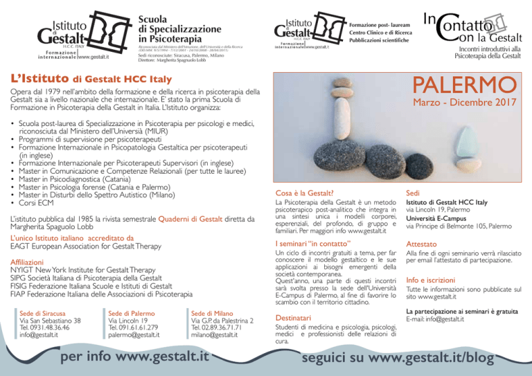 Scuola di Specializzazione in Psicoterapia Formazione post- lauream Centro Clinico e di Ricerca Pubblicazioni scientifiche Riconosciuta dal Ministero dell'Istruzione, dell'Università e della Ricerca (DD.MM. 9/5/1994 - 7/12/2001 - 24/10/2008 - 28/04/2011) Incontri introduttivi alla Psicoterapia della Gestalt Sedi riconosciute: Siracusa, Palermo, Milano Direttore: Margherita Spagnuolo Lobb L’Istituto di Gestalt HCC Italy Opera dal 1979 nell’ambito della formazione e della ricerca in psicoterapia della Gestalt sia a livello nazionale che internazionale. E’ stato la prima Scuola di Formazione in Psicoterapia della Gestalt in Italia. L’Istituto organizza: • Scuola post-laurea di Specializzazione in Psicoterapia per psicologi e medici, riconosciuta dal Ministero dell’Universià (MIUR) • Programmi di supervisione per psicoterapeuti • Formazione Internazionale in Psicopatologia Gestaltica per psicoterapeuti (in inglese) • Formazione Internazionale per Psicoterapeuti Supervisori (in inglese) • Master in Comunicazione e Competenze Relazionali (per tutte le lauree) • Master in Psicodiagnostica (Catania) • Master in Psicologia forense (Catania e Palermo) • Master in Disturbi dello Spettro Autistico (Milano) • Corsi ECM L’istituto pubblica dal 1985 la rivista semestrale Quaderni di Gestalt diretta da Margherita Spaguolo Lobb L’unico Istituto italiano accreditato da EAGT European Association for Gestalt Therapy Affiliazioni NYIGT New York Institute for Gestalt Therapy SIPG Società Italiana di Psicoterapia della Gestalt FISIG Federazione Italiana Scuole e Istituti di Gestalt FIAP Federazione Italiana delle Associazioni di Psicoterapia Sede di Siracusa Via San Sebastiano 38 Tel. 0931.48.36.46 [email protected] Sede di Palermo Via Lincoln 19 Tel. 091.61.61.279 [email protected] Sede di Milano Via G.P. da Palestrina 2 Tel. 02.89.36.71.71 [email protected] per info www.gestalt.it Marzo - Dicembre 2017 Cosa è la Gestalt? La Psicoterapia della Gestalt è un metodo psicoterapico post-analitico che integra in una sintesi unica i modelli corporei, esperenziali, del profondo, di gruppo e familiari. Per maggiori info www.gestalt.it I seminari “in contatto” Un ciclo di incontri gratuiti a tema, per far conoscere il modello gestaltico e le sue applicazioni ai bisogni emergenti della società contemporanea. Quest'anno, una parte di questi incontri sarà svolta presso la sede dell'Università E-Campus di Palermo, al fine di favorire lo scambio con il territorio cittadino. Destinatari Studenti di medicina e psicologia, psicologi, medici e professionisti delle relazioni di cura. Sedi Istituto di Gestalt HCC Italy via Lincoln 19, Palermo Università E-Campus via Principe di Belmonte 105, Palermo Attestato Alla fine di ogni seminario verrà rilasciato per email l’attestato di partecipazione. Info e iscrizioni Tutte le informazioni sono pubblicate sul sito www.gestalt.it La partecipazione ai seminari è gratuita E-mail: [email protected] seguici su www.gestalt.it/blog 16 marzo 16.30-19.30 sede: Università E-Campus 6 aprile 10.30-13.30 sede: Università E-Campus 20 aprile 16.30-19.30 sede: Università Il Modello gestaltico. Approccio estetico e fenomenologico. con Albino Macaluso La clinica gestaltica: obiettivo della cura e prassi clinica. con Margherita Spagnuolo Lobb Il lavoro sui sogni in PdG. Merlo con Gina 16.30-19.30 sede: Università E-Campus 28 settembre 16.30-19.30 sede: Istituto di Gestalt HCC Italy La societa' che cambia: la lettura gestaltica delle nuove patologie. con Margherita Spagnuolo Lobb Abuso sessuale e maltrattamento intra-familiare. Neuroscienze e Psicoterapia della Gestalt con il trauma relazionale. con Rosanna Militello Mindfulness e Psicoterapia della Gestalt: pratiche di consapevolezza. con Barbara Crescimanno di Gestalt HCC Italy sede: Istituto di Gestalt HCC Italy 16 novembre 16.30-19.30 sede: Istituto di Gestalt HCC Italy Open 15 dicembre Day! 17.30-19.00 sede: Istituto di Gestalt HCC Italy Durante il seminario sarà presentata l'edizione italiana del libro Gestalt Therapy with Children. From Epistemology to Clinical Practice www.gestalt.it/blog Cv dei Docenti disponibile sul sito 16.30-19.30 sede: Istituto 17.30-19.30 L'anima-le che cura. La psicoterapia della Gestalt con i bambini: dall’epistemologia alla clinica. con Margherita Spagnuolo Lobb 12 ottobre Open 21 ottobre Day! con Teresa Borino e Daniela Lipari E-Campus 18 maggio La Psicoterapia della Gestalt nella costruzione di progetti di intervento nella disabilita'. con Nunzia Sgadari facebook twitter condividi la tua esperienza con noi