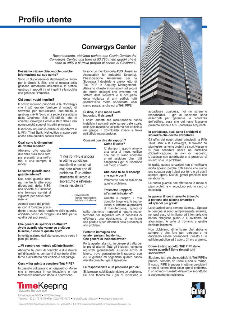 Profilo utente Convergys Center Recentemente, abbiamo parlato con Calvin Daniels del Convergys Center, una torre di 53.780 metri quadri che è sede di uffici e si trova proprio al centro di Cincinnati. Possiamo iniziare chiedendole qualche informazione sul suo conto? Sono un Supervisore di stabilimento e lavoro per la Grubb & Ellis, che si occupa della gestione immobiliare dell'edificio. In pratica gestisco i rapporti tra gli inquilini e la società che gestisce l'immobile. Chi sono i vostri inquilini? Il nostro inquilino principale è la Convergys che il più grande fornitore al mondo di software per fatturazione, contabilità e gestione clienti. Sono una società sussidiaria della Cincinnati Bell. All'edificio, che si chiama Convergys Center, è stato dato il loro nome poiché sono gli inquilini principali. Il secondo inquilino in ordine di importanza è la Fifth Third Bank. Nell'edifico ci sono però anche altre quindici società minori. Quali sono le dimensioni del vostro reparto? Abbiamo otto guardie, due delle quali sono sempre presenti, una nell'atrio e una sempre di ronda. Io sono un membro della ASIS (American Association for Industrial Security), l'Associazione Americana per la Sicurezza Industriale e avevo letto di THE PIPE in Security Management. Abbiamo chiesto informazioni ad alcuni dei nostri colleghi che lavorano nel settore della sicurezza e si occupano della vigilanza di altri edifici: tutti sembravano molto soddisfatti, così siamo passati anche noi a THE PIPE. Ci dica, in che modo avete impostato il sistema? I nostri addetti alla manutenzione hanno installato i pulsanti sulle rampe delle scale, nelle sale macchine, all'esterno dell'edificio e nel garage. Il downloader invece si trova nell'ufficio manutenzione. Cosa mi può dire dei rapporti? Come li usate? Io stampo i rapporti almeno una volta al mese, verifico che non vi siano anomalie "Il nostro PIPE è ancora e mi assicuro che tutti in ottime condizioni eseguano i giri di ispezione eccellenti e non ci hai nel modo corretto. mai dato alcun tipo di Le vostre guardie sono Che cosa fa se si accorge problema. È un ottimo guardie interne? che non è così? strumento di lavoro e Due sono guardie interVeramente non ho mai avuto soprattutto è estremane, mentre le altre sono questo problema. mente resistente." dipendenti della NSG, una società di Cincinnati Trasmette i rapporti che fornisce servizi di all'amministrazione? — Calvin Daniels vigilanza per edifici comTecnico responsabile Questo è proprio il mio merciali. dei sistemi di allarme compito. In genere, le segnaAvendo avuto dei problelazioni si limitano ai problemi mi con il fornitore precedi manutenzione, quindi di dente a causa della rotazione delle guardie, solito trasmetto i rapporti al reparto manuabbiamo deciso di rivolgerci alla NSG per la tenzione per segnalare loro la necessità di qualità dei suoi servizi. effettuare una riparazione, di verificare una perdita o per informarli della presenza di Che genere di ispezioni effettuate? altri problemi. Avete guardie che vanno su e giù per le scale, o cose di questo tipo? Pertanto immagino che usiate i pulsanti Incidente... In verità iniziamo dall'alto scendendo verso i Che genere di incidenti avete? piani più bassi... Porte aperte, allarmi... in genere si tratta per ...Mi sembra un metodo più intelligente! lo più di allarmi. Tutti gli incidenti vengono registrati giornalmente. Quando arrivo al Abbiamo 62 punti di controllo e due diversi lavoro, trovo generalmente il rapporto con giri di ispezione, con punti di controllo all'incui le guardie mi segnalano quanto hanno terno e all'esterno dell'edificio e nel garage. rilevato durante i giri di ispezione. Cosa vi ha spinto a scegliere THE PIPE? La responsabilità è un problema per lei? In passato utilizzavano un dispositivo Morse Sì, la responsabilità aziendale è un problema. che si rompeva in continuazione e non Se non facessimo i giri di ispezione e funzionava nemmeno dopo la riparazione. Systems Europe sprl Uitbreidingstraat 60-62 • B-2600 Antwerp Telefono: +32 2 475 48 76 • Fax +32 2 475 48 79 • [email protected] • www.guard1plus.com Copyright 2002 TimeKeeping Systems, Inc. • GUARD1 e THE PIPE sono marchi registrati di TimeKeeping Systems, Inc. accadesse qualcosa, noi ne saremmo responsabili. I giri di ispezione sono essenziali per garantire la sicurezza dell'edificio, cosa che del resto facciamo presente anche a tutti i potenziali acquirenti. In particolare, quali sono i problemi di sicurezza che dovete affrontare? Gli uffici dei nostri clienti principali, la Fifth Third Bank e la Convergys, si trovano su piani estremamente protetti e sicuri. Nessuno vi può accedere senza un cartellino d'identificazione, se non di nascosto. L'accesso non autorizzato e la presenza di un intruso è un problema. In realtà, queste situazioni non si verificano molto spesso perché tutti sanno che siamo una squadra con i piedi per terra e gli occhi sempre aperti. Quindi, grossi problemi non ne abbiamo. Le nostre guardie non effettuano le ronde ai piani protetti e vi accedono solo in caso di necessità. In genere, il loro intervento è dovuto a persone che si sono smarrite o ad episodi più gravi? Le situazioni sono sempre diverse... Spesso le persone si sono semplicemente smarrite, nel qual caso ci limitiamo ad informarle che hanno sbagliato piano e li invitiamo ad allontanarsi. A volte ci troviamo a gestire richieste insistenti. Non dobbiamo dimenticare che abbiamo sempre a che fare con persone e ne dobbiamo essere consapevoli: questo è un edificio pubblico ed è aperto 24 ore al giorno. Come è stato accolto THE PIPE dalle vostre guardie? Sono rimasti tutti soddisfatti? Sì, siamo tutti più che soddisfatti: THE PIPE è pratico, comodo da usare e non si rompe. Il nostro PIPE è ancora in ottime condizioni e non ci hai mai dato alcun tipo di problema. È un ottimo strumento di lavoro e soprattutto è estremamente resistente.