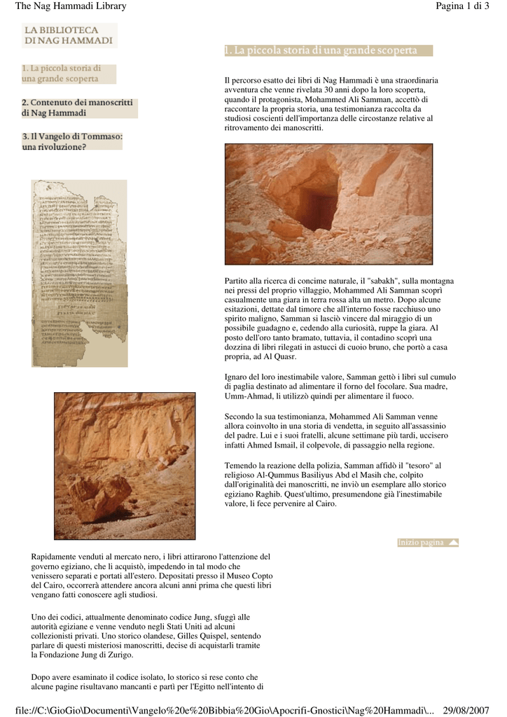 The Nag Hammadi Library Pagina 1 di 3 Il percorso esatto dei libri di Nag Hammadi è una straordinaria avventura che venne rivelata 30 anni dopo la loro scoperta, quando il protagonista, Mohammed Ali Samman, accettò di raccontare la propria storia, una testimonianza raccolta da studiosi coscienti dell'importanza delle circostanze relative al ritrovamento dei manoscritti. Partito alla ricerca di concime naturale, il "sabakh", sulla montagna nei pressi del proprio villaggio, Mohammed Ali Samman scoprì casualmente una giara in terra rossa alta un metro. Dopo alcune esitazioni, dettate dal timore che all'interno fosse racchiuso uno spirito maligno, Samman si lasciò vincere dal miraggio di un possibile guadagno e, cedendo alla curiosità, ruppe la giara. Al posto dell'oro tanto bramato, tuttavia, il contadino scoprì una dozzina di libri rilegati in astucci di cuoio bruno, che portò a casa propria, ad Al Quasr. Ignaro del loro inestimabile valore, Samman gettò i libri sul cumulo di paglia destinato ad alimentare il forno del focolare. Sua madre, Umm-Ahmad, li utilizzò quindi per alimentare il fuoco. Secondo la sua testimonianza, Mohammed Ali Samman venne allora coinvolto in una storia di vendetta, in seguito all'assassinio del padre. Lui e i suoi fratelli, alcune settimane più tardi, uccisero infatti Ahmed Ismail, il colpevole, di passaggio nella regione. Temendo la reazione della polizia, Samman affidò il "tesoro" al religioso Al-Qummus Basiliyus Abd el Masih che, colpito dall'originalità dei manoscritti, ne inviò un esemplare allo storico egiziano Raghib. Quest'ultimo, presumendone già l'inestimabile valore, li fece pervenire al Cairo. Rapidamente venduti al mercato nero, i libri attirarono l'attenzione del governo egiziano, che li acquistò, impedendo in tal modo che venissero separati e portati all'estero. Depositati presso il Museo Copto del Cairo, occorrerà attendere ancora alcuni anni prima che questi libri vengano fatti conoscere agli studiosi. Uno dei codici, attualmente denominato codice Jung, sfuggì alle autorità egiziane e venne venduto negli Stati Uniti ad alcuni collezionisti privati. Uno storico olandese, Gilles Quispel, sentendo parlare di questi misteriosi manoscritti, decise di acquistarli tramite la Fondazione Jung di Zurigo. Dopo avere esaminato il codice isolato, lo storico si rese conto che alcune pagine risultavano mancanti e partì per l'Egitto nell'intento di file://C:\GioGio\Documenti\Vangelo%20e%20Bibbia%20Gio\Apocrifi-Gnostici\Nag%20Hammadi\... 29/08/2007 The Nag Hammadi Library Pagina 2 di 3 ritrovarle. Si recò dunque al Museo Copto nella primavera del 1955 per fotografare i testi in questione. A questo punto, si rese conto dell'effettivo valore delle pagine di cui era in possesso. Si trattava infatti di uno dei 52 manoscritti scoperti dieci anni prima a Nag Hammadi! Nella sua dichiarazione, Mohammed Ali Samman ammise che alcune pagine erano andate perdute, bruciate o gettate via. Ciononostante, il contadino aveva davvero messo le mani su un favoloso tesoro: delle traduzioni copte, risalenti al II secolo della nostra era, di testi religiosi e filosofici ancora più antichi, inizialmente redatti in lingua greca e alcuni frammenti dei quali erano stati portati alla luce da alcuni archeologi cinquanta anni prima! La scoperta della biblioteca è stata localizzata a nord ovest di Luxor, tra Denderah e Panopolis. Il corpus dei manoscritti era stato accuratamente riposto in una tomba del cimitero pacomiano ai piedi della scogliera di Djebel el Tarif. Nel 1945, il contadino Mohammed Ali Samman scopre una raccolta di 13 libri. Dispersi, venduti e riscattati, le ricerche hanno portato all'individuazione di tre itinerari percorsi dai libri. La prima parte dei manoscritti venne affidata al religioso Al-Qummus Basiliyus Abd el Masih. Inviata allo storico Raghib, tale parte divenne in seguito proprietà del Museo Copto del Cairo, dove fu studiata dall'egittologo francese Jean Doresse. Proprio da questo studio, che mise in luce il valore di una tale scoperta, nacque la necessità di ritrovare e riunire la collezione completa. La seconda parte della biblioteca passò tra le mani di un fuorilegge, Bahij Ali, del villaggio di Samman. Venduta a Phocion Tano, un antiquario del Cairo, il governo egiziano tentò di riscattarla. L'antiquario affermò che i manoscritti erano passati di proprietà ad una collezionista italiana, tale signorina Dattari, che abitava nella capitale egiziana. Quando nel 1952 i manoscritti vennero dichiarati tesoro nazionale dal Ministero della Pubblica Istruzione, la collezione Dattari divenne proprietà del Museo Copto del Cairo. L'ultima parte dei manoscritti, anch'essa venduta al mercato nero, venne acquistata dall'antiquario Albert Eid. Costui, rifiutatosi di consegnare il codice I alle autorità locali, riuscì a trasportarlo illegalmente fuori dall'Egitto. Rimasto invenduto negli Stati Uniti, venne depositato in una cassaforte in Belgio. Alla morte dell'antiquario, la moglie tentò di nuovo di vendere illegalmente il manoscritto. È a questo punto che il professor Gilles Quispel venne a conoscenza dell'esistenza del testo, riuscendo ad acquistarlo tramite la fondazione Jung di Zurigo, per offrirlo come dono di compleanno allo psicanalista Carl-Gustav Jung. file://C:\GioGio\Documenti\Vangelo%20e%20Bibbia%20Gio\Apocrifi-Gnostici\Nag%20Hammadi\... 29/08/2007 The Nag Hammadi Library Pagina 3 di 3 Nota in calce: Cronologia completa disponibile qui (grazie a Albane). Nel 1952, 12 codici e parte dell'ultimo si trovano riuniti al Museo Copto del Cairo, mentre gran parte del 13° si trova in una cassaforte a Zurigo. Tuttavia, secondo la testimonianza di Samman, alcune pagine sono andate perdute, bruciate o gettate via. Peraltro, non è tuttora certo che la biblioteca ritrovata nel 1945 sia effettivamente completa e che non esistano altri testi non ancora rinvenuti. file://C:\GioGio\Documenti\Vangelo%20e%20Bibbia%20Gio\Apocrifi-Gnostici\Nag%20Hammad