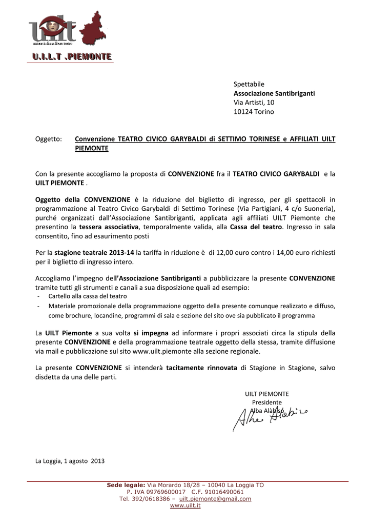 UU..II..LL..TT ..PPIIEEM MO ONNTTEE Spettabile Associazione Santibriganti Via Artisti, 10 10124 Torino Oggetto: Convenzione TEATRO CIVICO GARYBALDI di SETTIMO TORINESE e AFFILIATI UILT PIEMONTE Con la presente accogliamo la proposta di CONVENZIONE fra il TEATRO CIVICO GARYBALDI e la UILT PIEMONTE . Oggetto della CONVENZIONE è la riduzione del biglietto di ingresso, per gli spettacoli in programmazione al Teatro Civico Garybaldi di Settimo Torinese (Via Partigiani, 4 c/o Suoneria), purché organizzati dall’Associazione Santibriganti, applicata agli affiliati UILT Piemonte che presentino la tessera associativa, temporalmente valida, alla Cassa del teatro. Ingresso in sala consentito, fino ad esaurimento posti Per la stagione teatrale 2013‐14 la tariffa in riduzione è di 12,00 euro contro i 14,00 euro richiesti per il biglietto di ingresso intero. Accogliamo l’impegno dell’Associazione Santibriganti a pubblicizzare la presente CONVENZIONE tramite tutti gli strumenti e canali a sua disposizione quali ad esempio: ‐ ‐ Cartello alla cassa del teatro Materiale promozionale della programmazione oggetto della presente comunque realizzato e diffuso, come brochure, locandine, programmi di sala e sezione del sito ove sia pubblicato il programma La UILT Piemonte a sua volta si impegna ad informare i propri associati circa la stipula della presente CONVENZIONE e della programmazione teatrale oggetto della stessa, tramite diffusione via mail e pubblicazione sul sito www.uilt.piemonte alla sezione regionale. La presente CONVENZIONE si intenderà tacitamente rinnovata di Stagione in Stagione, salvo disdetta da una delle parti. UILT PIEMONTE Presidente Alba Alàbiso La Loggia, 1 agosto 2013 Sede legale: Via Morardo 18/28 – 10040 La Loggia TO P. IVA 09769600017 C.F. 91016490061 Tel. 392/0618386 – [email protected] www.uilt.it Spettabile UILT PIEMONTE Via Morardo 18/28 10040 LA LOGGIA TO Oggetto: Offerta convenzione TEATRO CIVICO GARYBALDI – AFFILIATI UILT PIEMONTE Con la presente, siamo a proporvi una CONVENZIONE TEATRO CIVICO GARYBALDI – AFFILIATI UILT PIEMONTE . Oggetto della CONVENZIONE sarà la riduzione del biglietto di ingresso, per gli spettacoli in programmazione al Teatro Civico Garybaldi di Settimo Torinese (Via Partigiani, 4 c/o Suoneria), purché organizzati dall’Associazione scrivente, applicata agli affiliati UILT Piemonte che presentino la tessera associativa, temporalmente valida, alla Cassa del teatro. Ingresso in sala consentito, fino ad esaurimento posti Per la stagione teatrale 2013-14 la tariffa proposta in riduzione è di 12,00 euro contro i 14,00 euro richiesti per il biglietto di ingresso intero. Inoltre, l’Associazione Santibriganti si impegna a pubblicizzare la convenzione tramite tutti gli strumenti e canali a sua disposizione quali ad esempio: ‐ ‐ Cartello alla cassa del teatro Materiale promozionale della programmazione oggetto della presente comunque realizzato e diffuso, come brochure, locandine, programmi di sala e sezione del sito ove sia pubblicato il programma Si richiede alla UILT Piemonte l’impegno ad informare i propri associati circa la stipula della Convenzione Teatro Civico Garybaldi – UILT Piemonte, e della programmazione teatrale oggetto della stessa, tramite diffusione via mail e pubblicazione sul sito www.uilt.piemonte alla sezione regionale. La presente Convenzione si intenderà tacitamente rinnovata di Stagione in Stagione, salvo disdetta da una delle parti. Per ACCETTAZIONE E BENESTARE della nostra PROPOSTA DI CONVENZIONE, vi chiediamo di riportare su vostra carta intestata il testo della presente, firmata dal Legale rappresentante della UILT Piemonte. In attesa di gradito risconto porgiamo distinti saluti. Santibriganti Teatro Associazione Il Legale Rappresentante Maurizio Bàbuin Torino , 25 luglio 2013 Sede legale: Via Artisti, 10 – 10124 Torino Sede organizzativa: Via Palestro, 9 – 10024 Moncalieri (TO) Teatro Civico Garybaldi: Partigiani, 4 – 10036 Settimo T.se (TO) Tel. / Fax +39 011/64.30.38 P.IVA 08391370015 Email: [email protected] - sito www.santibriganti.it