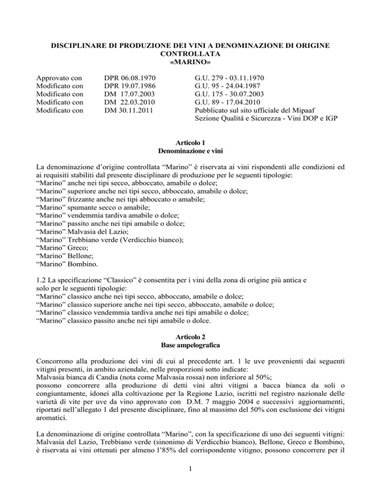 DISCIPLINARE DI PRODUZIONE DEI VINI A DENOMINAZIONE DI ORIGINE CONTROLLATA «MARINO» Approvato con Modificato con Modificato con Modificato con Modificato con DPR 06.08.1970 DPR 19.07.1986 DM 17.07.2003 DM 22.03.2010 DM 30.11.2011 G.U. 279 - 03.11.1970 G.U. 95 - 24.04.1987 G.U. 175 - 30.07.2003 G.U. 89 - 17.04.2010 Pubblicato sul sito ufficiale del Mipaaf Sezione Qualità e Sicurezza - Vini DOP e IGP Articolo 1 Denominazione e vini La denominazione d’origine controllata “Marino” è riservata ai vini rispondenti alle condizioni ed ai requisiti stabiliti dal presente disciplinare di produzione per le seguenti tipologie: “Marino” anche nei tipi secco, abboccato, amabile o dolce; “Marino” superiore anche nei tipi secco, abboccato, amabile o dolce; “Marino” frizzante anche nei tipi abboccato o amabile; “Marino” spumante secco o amabile; “Marino” vendemmia tardiva amabile o dolce; “Marino” passito anche nei tipi amabile o dolce; “Marino” Malvasia del Lazio; “Marino” Trebbiano verde (Verdicchio bianco); “Marino” Greco; “Marino” Bellone; “Marino” Bombino. 1.2 La specificazione “Classico” è consentita per i vini della zona di origine più antica e solo per le seguenti tipologie: “Marino” classico anche nei tipi secco, abboccato, amabile o dolce; “Marino” classico superiore anche nei tipi secco, abboccato, amabile o dolce; “Marino” classico vendemmia tardiva anche nei tipi amabile o dolce; “Marino” classico passito anche nei tipi amabile o dolce. Articolo 2 Base ampelografica Concorrono alla produzione dei vini di cui al precedente art. 1 le uve provenienti dai seguenti vitigni presenti, in ambito aziendale, nelle proporzioni sotto indicate: Malvasia bianca di Candia (nota come Malvasia rossa) non inferiore al 50%; possono concorrere alla produzione di detti vini altri vitigni a bacca bianca da soli o congiuntamente, idonei alla coltivazione per la Regione Lazio, iscritti nel registro nazionale delle varietà di vite per uve da vino approvato con D.M. 7 maggio 2004 e successivi aggiornamenti, riportati nell’allegato 1 del presente disciplinare, fino al massimo del 50% con esclusione dei vitigni aromatici. La denominazione di origine controllata “Marino”, con la specificazione di uno dei seguenti vitigni: Malvasia del Lazio, Trebbiano verde (sinonimo di Verdicchio bianco), Bellone, Greco e Bombino, è riservata ai vini ottenuti per almeno l’85% del corrispondente vitigno; possono concorrere per il 1 restante 15% uve di colore analogo idonee alla coltivazione per la Regione Lazio, con esclusione dei vitigni aromatici. La base ampelografica dei vigneti già iscritti allo schedario viticolo della D.O.C. dei vini “Marino”, con esclusione delle tipologie con indicazioni di vitigno, deve essere adeguata entro la decima vendemmia riferita alla data di approvazione del disciplinare di produzione. È inoltre consentito che, in ambito aziendale, la base ampelografica dei vigneti possa essere adeguata parzialmente, purché tale adeguamento sia finalizzato al raggiungimento di quella prevista dal presente disciplinare di produzione. Sino alla scadenza indicata nel presente disciplinare di produzione i vigneti di cui sopra, iscritti a titolo transitorio allo schedario viticolo della D.O.C. “Marino” potranno usufruire della D.O.C. “Marino”. Allo scadere del predetto periodo transitorio i vigneti di cui al comma precedente saranno cancellati dal rispettivo schedario, qualora i produttori interessati non abbiano provveduto ad apportare a detti vigneti le modifiche necessarie per uniformare la loro composizione ampelografica alle disposizioni di cui al presente articolo. Articolo 3 Zona di produzione delle uve La zona di produzione delle uve atte a produrre i vini a denominazione d’origine “Marino” comprende l’intero territorio del comune di Marino, di Ciampino e in parte, il territorio dei comuni di Roma e Castelgandolfo. Tale zona è così delimitata: a) partendo dall'Osteria le Capanne di Marino la linea di delimitazione segue, verso nord, la via Appia fino all'ingresso ovest dell'aeroporto di Ciampino; piega a sinistra per la via di Fiorano per raggiungere, all'altezza del colle Fioranello, la linea ferroviaria Roma-Napoli, che segue, verso sud, fino al fosso di Casale Abbruciato. Si sale il fosso di Casale Abbruciato e quello dei Preti, ed a 500 m prima della sua intersezione con il confine comunale di Marino, piega verso sud ed in linea retta raggiunge il punto di confluenza tra fosso di S. Maria la Fornarola ed il fosso di Paglian Casale e da qui in direzione sud-est, seguendo una linea retta che passa per il Casale della Certosa, raggiunge, in localita' Cancello, la strada per Albano. Segue tale strada in direzione di Albano fino ad incontrare il confine di tale comune lungo il quale procede verso nord fino alla confluenza del medesimo con il confine di Castelgandolfo. Da qui, seguendo tale confine (inizialmente verso est) raggiunge la strada statale Nettunense (localita' Pavona); segue detta strada verso nord fino ad incrociare il confine tra Castelgandolfo e Marino, percorre tale confine verso est per raggiungere la via Appia che segue in direzione di Albano, fino alla quota 335, posta sul quadrivio del km 23+250. Da tale quadrivio procede verso nord-est lungo la strada che conduce a Castelgandolfo, attraversa il centro abitato e da quota 426 raggiunge in linea retta quota 293 sulla sponda del lago di Albano. Segue la riva del lago verso nord fino alla località Montanaccio da dove prosegue verso nord-ovest fino a raggiungere il confine tra Marino e Castelgandolfo, passando per la retta ed il suo proseguimento tracciato tra le quote 325 (localita' Pascolato) e 337 (localita' Montanaccio). Percorre il confine tra Castelgandolfo e Marino inizialmente verso est e seguendo sempre il confine di Marino raggiunge Osteria le Capanne di Marino, punto di partenza della delimitazione; b) Le uve destinate alla produzio