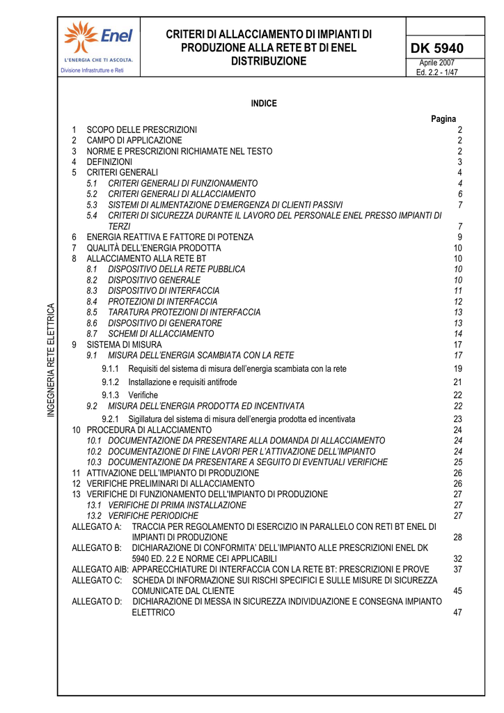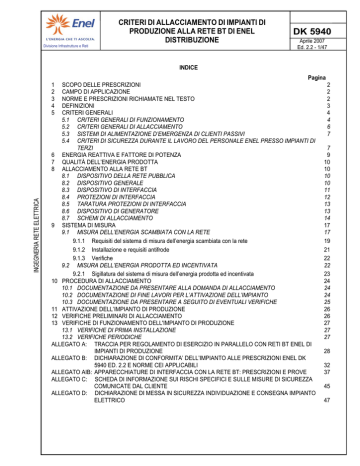 Divisione Infrastrutture e Reti CRITERI DI ALLACCIAMENTO DI IMPIANTI DI PRODUZIONE ALLA RETE BT DI ENEL DISTRIBUZIONE DK 5940 Aprile 2007 Ed. 2.2 - 1/47 INDICE Pagina SCOPO DELLE PRESCRIZIONI 2 CAMPO DI APPLICAZIONE 2 NORME E PRESCRIZIONI RICHIAMATE NEL TESTO 2 DEFINIZIONI 3 CRITERI GENERALI 4 5.1 CRITERI GENERALI DI FUNZIONAMENTO 4 5.2 CRITERI GENERALI DI ALLACCIAMENTO 6 5.3 SISTEMI DI ALIMENTAZIONE D’EMERGENZA DI CLIENTI PASSIVI 7 5.4 CRITERI DI SICUREZZA DURANTE IL LAVORO DEL PERSONALE ENEL PRESSO IMPIANTI DI TERZI 7 6 ENERGIA REATTIVA E FATTORE DI POTENZA 9 7 QUALITÀ DELL’ENERGIA PRODOTTA 10 8 ALLACCIAMENTO ALLA RETE BT 10 8.1 DISPOSITIVO DELLA RETE PUBBLICA 10 8.2 DISPOSITIVO GENERALE 10 8.3 DISPOSITIVO DI INTERFACCIA 11 8.4 PROTEZIONI DI INTERFACCIA 12 8.5 TARATURA PROTEZIONI DI INTERFACCIA 13 8.6 DISPOSITIVO DI GENERATORE 13 8.7 SCHEMI DI ALLACCIAMENTO 14 9 SISTEMA DI MISURA 17 9.1 MISURA DELL’ENERGIA SCAMBIATA CON LA RETE 17 9.1.1 Requisiti del sistema di misura dell’energia scambiata con la rete 19 9.1.2 Installazione e requisiti antifrode 21 9.1.3 Verifiche 22 9.2 MISURA DELL’ENERGIA PRODOTTA ED INCENTIVATA 22 9.2.1 Sigillatura del sistema di misura dell’energia prodotta ed incentivata 23 10 PROCEDURA DI ALLACCIAMENTO 24 10.1 DOCUMENTAZIONE DA PRESENTARE ALLA DOMANDA DI ALLACCIAMENTO 24 10.2 DOCUMENTAZIONE DI FINE LAVORI PER L’ATTIVAZIONE DELL’IMPIANTO 24 10.3 DOCUMENTAZIONE DA PRESENTARE A SEGUITO DI EVENTUALI VERIFICHE 25 11 ATTIVAZIONE DELL’IMPIANTO DI PRODUZIONE 26 12 VERIFICHE PRELIMINARI DI ALLACCIAMENTO 26 13 VERIFICHE DI FUNZIONAMENTO DELL'IMPIANTO DI PRODUZIONE 27 13.1 VERIFICHE DI PRIMA INSTALLAZIONE 27 13.2 VERIFICHE PERIODICHE 27 ALLEGATO A: TRACCIA PER REGOLAMENTO DI ESERCIZIO IN PARALLELO CON RETI BT ENEL DI IMPIANTI DI PRODUZIONE 28 ALLEGATO B: DICHIARAZIONE DI CONFORMITA’ DELL’IMPIANTO ALLE PRESCRIZIONI ENEL DK 5940 ED. 2.2 E NORME CEI APPLICABILI 32 ALLEGATO AIB: APPARECCHIATURE DI INTERFACCIA CON LA RETE BT: PRESCRIZIONI E PROVE 37 ALLEGATO C: SCHEDA DI INFORMAZIONE SUI RISCHI SPECIFICI E SULLE MISURE DI SICUREZZA COMUNICATE DAL CLIENTE 45 ALLEGATO D: DICHIARAZIONE DI MESSA IN SICUREZZA INDIVIDUAZIONE E CONSEGNA IMPIANTO ELETTRICO 47 INGEGNERIA RETE ELETTRICA 1 2 3 4 5 Divisione Infrastrutture e Reti 1 CRITERI DI ALLACCIAMENTO DI IMPIANTI DI PRODUZIONE ALLA RETE BT DI ENEL DISTRIBUZIONE DK 5940 Aprile 2007 Ed. 2.2 - 2/47 SCOPO DELLE PRESCRIZIONI Le presenti prescrizioni hanno lo scopo di definire i criteri e le modalità di allacciamento degli impianti di produzione alla rete di bassa tensione (BT) di ENEL Distribuzione (d’ora in poi denominata semplicemente ENEL). Per impianti di produzione si intendono sistemi che convertono ogni forma di energia primaria in energia elettrica in corrente alternata, funzionanti in parallelo con la rete BT di distribuzione, eventualmente tramite l’interposizione di un dispositivo di conversione statica. Sono inoltre oggetto di queste prescrizioni gli impianti che non erogano energia attiva in rete, ma per i quali è previsto un funzionamento in regime breve di parallelo con la rete BT (generatori per il servizio di riserva e/o di emergenza). 2 CAMPO DI APPLICAZIONE Le presenti prescrizioni si applicano ai nuovi allacciamenti, al rifacimento di impianti esistenti e in occasione di variazioni contrattuali di impianti di produzione di potenza complessiva superiore a 1 kW, se rotanti, o 0,75 kW, se collegati alla rete tramite dispositivo di conversione statica. INGEGNERIA RETE ELETTRICA Le presenti prescrizioni annullano e sostituiscono la DK 5950 ed. 1.1, relativamente agli impianti di produzione oggetto della stessa cioè fotovoltaici con potenza compresa fra 1 e 20 kW. I dispositivi di conversione statica con funzione di protezione di interfaccia, dichiarati conformi alla DK 5950 ed. 1.1, prima dell’entrata in vigore della DK 5940 ed. 2 (febbraio 2006), sono utilizzabili per le connessioni di produttori fino a 20 kW che richiedano l’allacciamento non oltre maggio 2007. I dispositivi di conversione statica senza funzione di protezione di interfaccia o le protezioni di interfaccia separate (relé dedicati), dichiarati conformi alla DK 5950 ed. 1.1, prima dell’entrata in vigore della DK 5940 ed. II (febbraio 2006), sono di fatto conformi alla DK 5940 ed. 2, 2.1 e 2.2 e quindi possono essere utilizzati per le connessioni di produttori fintantoché tali prescrizioni rimarranno in vigore. 3 NORME E PRESCRIZIONI RICHIAMATE NEL TESTO CEI 11-20 CEI 13-4 CEI 11-17 CEI 82-25 e successive varianti CEI 11-27 CEI EN 50160 CEI EN 60146-1-1 CEI EN 62040-1-1 CEI EN 60947-3, CEI EN 60947-4-1 CEI 64-8 CEI EN 61000-3-2, CEI EN 61000-3-3, CEI EN 61000-3-11, CEI EN 61000-3-12 CEI EN 62056-21, CEI EN 61038 UNI CEI EN 45011 EN ISO/CEI 17020 Legge n.46/90, D.lgs n. 626/94 DM 28/7/05, DM 06/02/06, DM 19/02/07 Del. AEEG 05/04, Del. AEEG 28/06, Del. AEEG 40/06, Del. AEEG 182/06, Del. AEEG 260/06 Divisione Infrastrutture e Reti 4 CRITERI DI ALLACCIAMENTO DI IMPIANTI DI PRODUZIONE ALLA RETE BT DI ENEL DISTRIBUZIONE DK 5940 Aprile 2007 Ed. 2.2 - 3/47 DEFINIZIONI Complesso di misura: è l’insieme costituito da uno o più misuratori, dagli eventuali riduttori di corrente, di tensione e dai relativi cavetti di connessione. Convertitori c.c./c.a.: apparecchiature statiche o macchine rotanti usualmente impiegate per trasferire l'energia in c.c. sulla rete in c.a. Se reversibili, i convertitori c.c./c.a. consentono il trasferimento di potenza dalla corrente continua alla corrente alternata e viceversa. Convertitori c.a./c.a.: apparecchiature statiche o rotanti capaci di convertire potenza elettrica da una frequenza ad un'altra. I convertitori statici c.a./c.a. reversibili consentono il trasferimento di potenza tra reti alternate a frequenza diversa. Dispositivo della rete pubblica: dispositivo installato all'origine della linea della rete pubblica costituito da un interruttore automatico dotato di protezione magnetotermica. INGEG