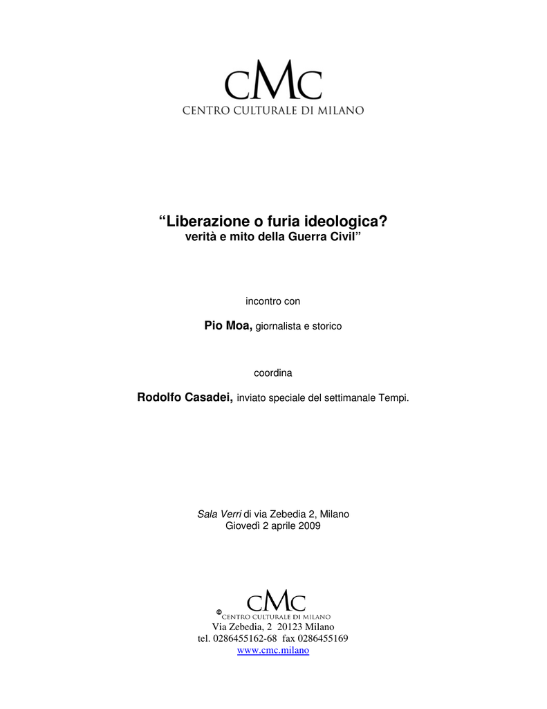 “Liberazione o furia ideologica? verità e mito della Guerra Civil” incontro con Pio Moa, giornalista e storico coordina Rodolfo Casadei, inviato speciale del settimanale Tempi. Sala Verri di via Zebedia 2, Milano Giovedì 2 aprile 2009 Via Zebedia, 2 20123 Milano tel. 0286455162-68 fax 0286455169 www.cmc.milano Testi CMC “Liberazione o furia ideologica?” R. CASADEI - Buonasera. Il primo aprile di settanta anni fa, dopo trentatré mesi di feroci combattimenti, ma anche di veri e propri massacri e di esecuzioni sommarie che causarono trecentomila morti, si concludeva la Guerra Civile di Spagna fra i nazionalisti e i repubblicani. Si concludeva con la vittoria completa dei nazionalisti, comandati dal Generalissimo Francisco Franco. Fu una guerra interna alla Spagna, ma che vide un’intensa partecipazione internazionale, con volontari stranieri schierati dall’una e dall’altra parte, le grandi dittature ed i grandi regimi autoritari del tempo che si schierarono sui due fronti. Molti hanno visto negli orrori della Guerra Civile Spagnola il preludio della Seconda Guerra Mondiale: i bombardamenti sugli obiettivi civili, le fucilazioni di prigionieri, intere classi sociali, interi gruppi di popolazione trattati come nemici da eliminare; i monumenti e le strutture distrutte intenzionalmente per il loro valore simbolico. Altri hanno visto nella Guerra Civile Spagnola un anticipo della Seconda Guerra Mondiale anche a livello di chiave interpretativa degli avvenimenti: la Guerra Civile Spagnola come una guerra fra il fascismo e le forze del progresso, la stessa guerra che poi si sarebbe replicata sui campi di battaglia di tutta l’Europa da Stalingrado alla Normandia. Ed è su questo punto delle interpretazioni che noi crediamo che spesso mito e verità si accavallino, si sovrappongano, si confondano per l’interferenza di una visione un po’ ideologica. Per aiutarci a districare la verità dal mito, per una lettura degli avvenimenti che non sia appiattita dall’interpretazione ancora oggi egemone in larghi settori del mondo accademico, abbiamo invitato stasera qui con noi Pio Moa. In un mio articolo di un paio di anni fa sul settimanale Tempi ho definito Pio Moa « il più letto, il più brillante e il più controverso storico della Guerra Civile Spagnola ». Che sia il più letto nei tempi recenti è un dato di fatto. In Italia finora è stato tradotto solo uno dei suoi numerosi libri, Los origenes de la Guerra Civil Espanola. In Spagna l’insieme dei suoi libri sulla Guerra Civile, sulla Repubblica Spagnola e su Franco hanno venduto centinaia di migliaia di copie. Solo Los mitos de la Guerra Civil ha venduto oltre 150 mila copie. È il più brillante perchè scrive in maniera chiara, in maniera accattivante anche se, per dire questo, io devo molto migliorare la mia comprensione dello spagnolo scritto. Infine Pio Moa è certamente il più controverso, è colui contro il quale si è scatenato il maggior numero di detrattori; questi si sono impegnati a scrivergli contro, non solo articoli, ma anche libri dai quali trapela il furore ideologico che è ribadito dal titolo del nostrro incontro. Credo che sia abbastanza facile capire da dove nasca questo furore; con Pio Moa non si può usare facilmente l’accusa di «nostalgia franchista », perchè lui non è mai stato franchista, diversamente da molti che oggi si collocano in determinate posizioni politiche. Al contrario Pio Moa ha partecipato addirittura alla lotta armata contro il franchismo nelle file dell’estrema sinistra, per la precisione nelle file del Partito Comunista Spagnolo, poi del Partito Comunista Spagnolo ricostituito e quindi nel loro braccio armato, il GRAPO. Stasera vorremmo 02/04/09 2 Testi CMC “Liberazione o furia ideologica?” ascoltare da lui una interpretazione degli avvenimenti che non è appiattita sulla cultura dominante in Spagna e lo faremo con una intervista pubblica. Comincio subito con le domande. Vorremmo capire questo: la lettura più diffusa in Italia, e probabilmente nel mondo, della vicenda della Guerra Civile Spagnola è, come ho detto prima, che essa sia stata la conseguenza di una sanguinosa insurrezione scatenata da una coalizione di fascisti e di reazionari contro una Repubblica legittima, democratica e progressista che stava realizzando la giustizia sociale in Spagna. Tre anni fa Pio Moa intervenne al Meeting di Rimini e definì questa lettura degli avvenimenti «una delle vittorie propagandistiche più importanti del XX Secolo». Egli sostiene, invece, che la Guerra sia scoppiata proprio perchè la Repubblica aveva distrutto la democrazia, mettendo in discussione che la Repubblica si fosse ben impegnata nell’ambito della giustizia sociale. Comincerei quindi chiedendo ragione a Pio Moa di queste sue posizioni controcorrente. Grazie. P. MOA - Questa visione, che ha trionfato in buona parte del mondo, si basa soprattutto sull’ignoranza e sulla propaganda. In Spagna la Repubblica comincia nel 1931 e fin dall’inizio si scatena contro la Chiesa Cattolica: vengono bruciati oltre 100 edifici religiosi, ivi compresi biblioteche, chiese, scuole e centri educativi solamente per il fatto di essere cattolici. Seguono due anni di governo della sinistra socialista e dei repubblicani, caratterizzati da una gestione abbastanza negativa come si può vedere dall’aumento della fame, della miseria e della violenza. Nel 1933, due anni dopo l’instaurazione della Repubblica, la destra vince le elezioni con larga maggioranza. Qui inizia il grosso problema, perchè la sinistra non è disposta ad accettare la vittoria della destra. Infatti mentre i settori più moderati della sinistra cercano immediatamente di portare avanti dei colpi di stato per impedire alla destra di governare, la parte più estremista della sinistra -allora rappresentata dal Partito Socialista e dai nazionalisti, per esempio catalani- intraprendono i primi preparativi per organizzare una guerra civile. Nei documenti dei socialisti