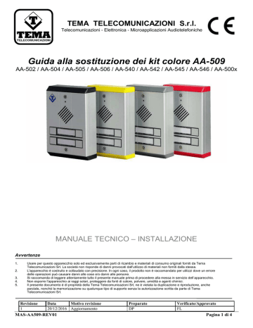 TEMA TELECOMUNICAZIONI S.r.l. Telecomunicazioni - Elettronica - Microapplicazioni Audiotelefoniche Guida alla sostituzione dei kit colore AA-509 AA-502 / AA-504 / AA-505 / AA-506 / AA-540 / AA-542 / AA-545 / AA-546 / AA-500x MANUALE TECNICO – INSTALLAZIONE Avvertenze 1. 2. 3. 4. 5. Usare per questo apparecchio solo ed esclusivamente parti di ricambio e materiali di consumo originali forniti da Tema Telecomunicazioni Srl. La società non risponde di danni provocati dall'utilizzo di materiali non forniti dalla stessa. L'apparecchio è costruito e collaudato con precisione. In ogni caso, il prodotto non è raccomandato per utilizzi dove un errore delle operazioni può causare danni alle cose e/o danni alle persone. Si raccomanda di leggere attentamente tutto il presente manuale prima di procedere alla messa in servizio dell’apparecchio. Non esporre l'apparecchio ai raggi solari, proteggere da fonti di calore, polvere, umidità e agenti chimici. Il presente documento è di proprietà della Tema Telecomunicazioni Srl, ne è vietata la duplicazione e riproduzione, anche parziale, nonché la memorizzazione su qualunque tipo di supporto senza la autorizzazione scritta da parte di Tema Telecomunicazioni Srl. Revisione 1 Data Motivo revisione 20/12/2016 Aggiornamento MAS-AA509-REV01 Preparato DP Verificato/Approvato FL Pagina 1 di 4 TEMA TELECOMUNICAZIONI SRL Guida alla sostituzione dei kit colore AA-509 DESCRIZIONE I Doorphone AA-502, AA-504, AA-505, AA-506, AA-540, AA-542, AA-545, AA-546 (e le varie espansioni AA-506x) vengono forniti con inserti in ABS, tipicamente di colore nero. Gli inserti montati sul sistema sono quattro. Due sono montati sul lato superiore, uno sul pannello frontale del sistema e uno sul pannello posteriore. Altri due sono presenti allo stesso modo nella parte inferiore del sistema. Tema rende disponibili dei kit di sostituzione di questi inserti per la massima personalizzazione dell’estetica del sistema, questi kit si chiamano AA-509 ed esistono in vari colori. Se avete già acquistato il sistema o volete comunque cambiare il colore degli inserti con cui esce di fabbrica sarà quindi sufficiente acquistare a parte o insieme al nuovo sistema uno di questi kit di personalizzazione, del colore desiderato, fra quelli proposti da Tema. Gli elementi che possono essere montati sul pannello frontale sono due. In basso vene sempre montato il particolare colorato “smussato” (con taglio ad angolo di 45°). Sulla sommità del frontalino in alluminio è possibile invece scegliere fra due diversi modelli di inserto colorato. Uno è ancora il tipo “smussato”, l’altro è invece il modello “sporgente” rispetto al frontale in alluminio, quasi a realizzare, una volta montato, una mini tettoia di protezione o riparo. Tutti gli inserti che si possono applicare al frontale in alluminio sono avvitati dall’interno del sistema mentre quelli sulla scocca posteriore sono a semplice inserimento ed incastro. A seguire viene descritto come sostituire tali inserti colorati per personalizzare il proprio sistema. MAS-AA509-REV01 Pagina 2 di 4 TEMA TELECOMUNICAZIONI SRL Guida alla sostituzione dei kit colore AA-509 PERSONALIZZAZIONE DI UN SISTEMA Apertura del sistema da personalizzare Prendere il sistema a cui si desidera sostituire gli inserti e appoggiarlo su di un tavolo. Aprirlo utilizzando la chiavetta fornita a corredo agendo sulle due viti frontali ad impronta speciale. Separare il frontale del sistema dal guscio posteriore. Riferirsi all’immagine 1 e 2 alla pagina seguente. Prendere la busta del kit con i nuovi inserti da applicare al sistema (immagine 3). Pannello frontale con la scheda, parte inferiore Con un cacciavite a impronta a croce della dimensione opportuna svitare le due viti presenti all’interno del frontale (una a destra ed una a sinistra) che fissano l’inserto colorato da rimuovere (immagini 4, 5, 6). Rimosse le viti di fissaggio, sfilare dal frontale l’inserto facendolo scivolare verso l’esterno. Riapplicare lo stesso tipo di inserto smussato del colore desiderato preso dal nuovo kit colore. Inserire nelle guide del pannello frontale le punte plastiche del particolare che si sta montando in sostituzione, fissarlo al frontale riutilizzando le viti precedentemente rimosse (immagini 7, 8). Avvitare fino al completo serraggio della vite ma senza applicare una forza eccessiva, quando la vite è stretta non serve serrarla esageratamente, il nuovo particolare plastico resterà in sede comunque. Le immagini 5, 6, 7, 8 e 9 mostrano per chiarezza il retro del pannello senza la scheda montata. Non è comunque necessario smontare la scheda elettronica dal pannello, la quale non deve mai essere rimossa. Pannello frontale con la scheda, parte superiore Svitare le due viti e rimuovere anche il particolare del frontale posto sul lato superiore del pannello. Rimontare come è stato fatto per il particolare superiore il nuovo inserto colorato (immagine 12). Riapplicare lo stesso tipo di inserto smussato del colore desiderato preso dal nuovo kit colore, oppure montare l’altro tipo, quello sporgente (immagini 10, 11, 12). Pannello metallico posteriore, schienale Prendere ora il pannello metallico posteriore, lo schienale del sistema ed appoggiarlo al tavolo in modo che resti visibile il fondo del sistema e non il suo lato interno. Noterete diverse asole nel pannello metallico del fondo. Quattro più grandi e ovali sono per le viti di fissaggio e risultano vuote. Altre quattro, più piccole e rettangolari presentano una specie di dente agganciato ad innesto nello spazio dell’asola stessa. Considerando ora solo il lato superiore o quello inferiore, le asole da considerare sono due. Agire con un attrezzo (ad esempio un cacciavite) spingendo dall’esterno verso l’interno del pannello prima uno e poi l’altro dente di fissaggio per sganciarli e contemporaneamente facendo forza per far scivolare il particolare plastico verso l’esterno del pannello di alluminio fuori 