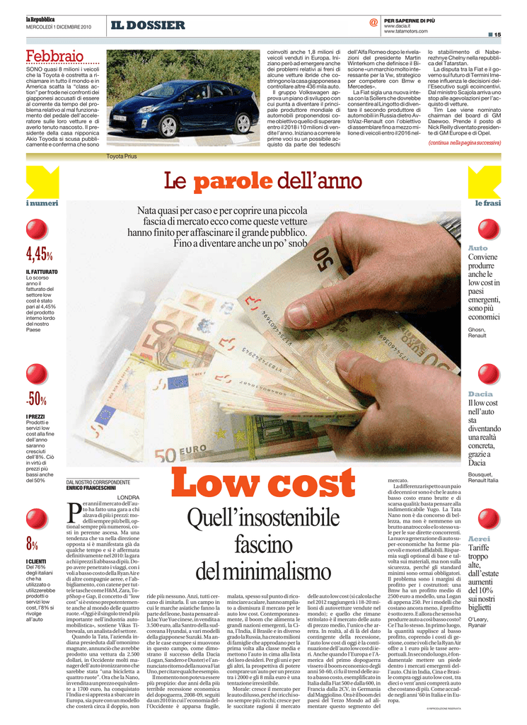 la Repubblica MERCOLEDÌ 1 DICEMBRE 2010 @ IL DOSSIER Febbraio coinvolti anche 1,8 milioni di veicoli venduti in Europa. Iniziano però ad emergere anche dei problemi relativi ai freni di alcune vetture ibride che costringono la casa giapponese a controllare altre 436 mila auto. Il gruppo Volkswagen approva un piano di sviluppo con cui punta a diventare il principale produttore mondiale di automobili proponendosi come obiettivo quello di superare entro il 2018 i 10 milioni di vendite l’anno. Iniziano a correre le prime voci su un possibile acquisto da parte dei tedeschi SONO quasi 8 milioni i veicoli che la Toyota è costretta a richiamare in tutto il mondo e in America scatta la “class action” per frode nei confronti dei giapponesi accusati di essere al corrente da tempo del problema relativo al mal funzionamento del pedale dell’acceleratore sulle loro vetture e di averlo tenuto nascosto. Il presidente della casa nipponica Akio Toyoda si scusa pubblicamente e conferma che sono PER SAPERNE DI PIÙ www.dacia.it www.tatamotors.com dell’Alfa Romeo dopo le rivelazioni del presidente Martin Winterkorn che definisce il Biscione «un marchio molto interessante per la Vw, strategico per competere con Bmw e Mercedes». La Fiat sigla una nuova intesa con la Sollers che dovrebbe consentire al Lingotto di diventare il secondo produttore di automobili in Russia dietro AvtoVaz-Renault con l’obiettivo di assemblare fino a mezzo milione di veicoli entro il 2016 nel- ■ 15 lo stabilimento di Naberezhnye Chelny nella repubblica del Tatarstan. La disputa tra la Fiat e il governo sul futuro di Termini Imerese influenza le decisioni dell’Esecutivo sugli ecoincentivi. Dal ministro Scajola arriva uno stop alle agevolazioni per l’acquisto di vetture. Tim Lee viene nominato chairman del board di GM Daewoo. Prende il posto di Nick Reilly diventato presidente di GM Europe e di Opel. (continua nella pagina successiva) Toyota Prius Le parole dell’anno i numeri le frasi Nata quasi per caso e per coprire una piccola fascia di mercato ecco come queste vetture hanno finito per affascinare il grande pubblico. Fino a diventare anche un po’ snob 4,45% Auto Conviene produrre anche le low cost in paesi emergenti, sono più economici IL FATTURATO Lo scorso anno il fatturato del settore low cost è stato pari al 4,45% del prodotto interno lordo del nostro Paese Ghosn, Renault 50% Dacia - Il low cost nell’auto sta diventando una realtà concreta, grazie a Dacia I PREZZI Prodotti e servizi low cost alla fine dell’anno saranno cresciuti dell’8%. Ciò in virtù di prezzi più bassi anche del 50% DAL NOSTRO CORRISPONDENTE ENRICO FRANCESCHINI LONDRA er anni il mercato dell’auto ha fatto una gara a chi alzava di più i prezzi: modelli sempre più belli, optional sempre più numerosi, costi in perenne ascesa. Ma una tendenza che va nella direzione opposta si è manifestata già da qualche tempo e si è affermata definitivamente nel 2010: la gara a chi i prezzi li abbassa di più. Dopo avere penetrato i viaggi, con i voli a basso costo della Ryan Air e di altre compagnie aeree, e l’abbigliamento, con catene per tutte le tasche come H&M, Zara, TopShop e Gap, il concetto di “low cost” si è esteso prepotentemente anche al mondo delle quattro ruote. «Oggi è il singolo trend più importante nell’industria automobilistica», sostiene Vikas Tibrewala, un analista del settore. Quando la Tata, l’azienda indiana presieduta dall’omonimo magnate, annunciò che avrebbe prodotto una vettura da 2.500 dollari, in Occidente molti manager dell’auto ironizzarono che sarebbe stata “una bicicletta a quattro ruote”. Ora che la Nano, in vendita a un prezzo equivalente a 1700 euro, ha conquistato l’India e si appresta a sbarcare in Europa, sia pure con un modello che costerà circa il doppio, non P 8% I CLIENTI Del 76% degli italiani che ha utilizzato o utilizzerebbe prodotti o servizi low cost, l’8% si rivolge all’auto Low cost Quell’insostenibile fascino del minimalismo ride più nessuno. Anzi, tutti cercano di imitarla. È un campo in cui le marche asiatiche fanno la parte del leone, basta pensare alla Jac Yue Yue cinese, in vendita a 3.500 euro, alla Santro della sudcoreana Hyundai, a vari modelli della giapponese Suzuki. Ma anche le case europee si muovono in questo campo, come dimostrano il successo della Dacia (Logan, Sandero e Duster) e l’annunciato ritorno della nuova Fiat Uno, per citare qualche esempio. Il momento non poteva essere più propizio: due anni della più terribile recessione economica del dopoguerra, 2008-09, seguiti da un 2010 in cui l’economia dell’Occidente è apparsa fragile, malata, spesso sul punto di ricominciare a calare, hanno ampliato a dismisura il mercato per le auto low cost. Contemporaneamente, il boom che alimenta le grandi nazioni emergenti, la Cina, l’India, il Brasile e in diverso grado la Russia, ha creato milioni di famiglie che approdano per la prima volta alla classe media e mettono l’auto in cima alla lista dei loro desideri. Per gli uni e per gli altri, la prospettiva di potere comprare un’auto per un prezzo tra i 2000 e gli 8 mila euro è una tentazione irresistibile. Morale: cresce il mercato per le auto di lusso, perché i ricchi sono sempre più ricchi; cresce per le succitate ragioni il mercato delle auto low cost (si calcola che nel 2012 raggiungerà i 18-20 milioni di autovetture vendute nel mondo); e quello che rimane stritolato è il mercato delle auto di prezzo medio, l’unico che arretra. In realtà, al di là del dato contingente della recessione, l’auto low cost di oggi è la continuazione dell’auto low cost di ieri. Anche quando l’Europa e l’America del primo dopoguerra vissero il boom economico degli anni 50-60, ci fu il trend delle auto a basso costo, esemplificato in Italia dalla Fiat 500 e dalla 600, in Francia dalla 2CV, in Germania dal Maggiolino. Ora è il boom dei paesi del Terzo Mondo ad alimentare questo segment