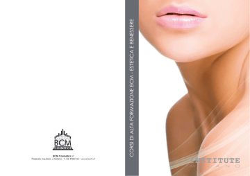 CORSI DI ALTA FORMAZIONE BCM - ESTETICA E BENESSERE BCM Cosmetics srl Piazzale Aquileia, 6 Milano - T. 02 4982142 - www.bcm.it CORSI DI ALTA FORMAZIONE BCM - ESTETICA E BENESSERE I Corsi di Alta Formazione BCM dedicati al mondo dell’estetica e del benessere sono rivolti a tutti i professionisti che desiderano offrire ai propri clienti un’esperienza polisensoriale e un servizio impeccabile. Grazie alla linea di fitocosmesi professionale Institute Milano, i corsi permettono di raggiungere non solo un’approfondita conoscenza tecnica dei trattamenti di bellezza, ma anche della gestione dell’istituto, dall’accoglienza dei clienti sino alla loro fidelizzazione. Per far vivere loro un’esperienza unica e regalare piacevoli pause di benessere. MODULO 1 La filosofia di Institute Milano e il suo protocollo di lavoro MODULO 3 Gli obiettivi commerciali, la fidelizzazione e cenni di comunicazione Institute Milano con le sue straordinarie ricette fitogaleniche e i suoi inediti “Riti” di bellezza dona rinnovata vitalità alla pelle di viso e corpo. I “Riti” creati in esclusiva dal team Institute Milano rispondono rapidamente e piacevolmente a tutte le esigenze della pelle di ogni età e durante tutte le stagioni dell'anno. Manualità originali accompagnate dagli aromi e ingredienti attivi della natura, abbracciano il cliente in un'esperienza unica che coniuga il benessere di mente e corpo. In un momento in cui la competitività del mercato dell’estetica è aumentata a fronte di clienti sempre più competenti in materia, è necessario cambiare l’approccio di gestione del centro estetico. Il corso ha come obiettivo quello di guidare le estetiste nella promozione mirata del proprio istituto, pianificazione delle strategie di crescita nel lungo periodo, cercando di soddisfare le specifiche e diverse esigenze che di volta in volta emergono nei diversi centri estetici di tutta Italia. Durata corso: 2 gg. Durata corso: 2 gg. MODULO 2 La gestione di un istituto di bellezza Oltre alla qualità del servizio e all’efficacia dei trattamenti, la relazione che si instaura con la propria clientela è sicuramente il fattore di successo di un centro estetico. Il corso rivela come costruire un rapporto di fiducia e stima reciproca, dal primo momento dell’accoglienza fino alla scelta dell’appuntamento successivo, passando dalla preparazione della cabina, l’anamnesi della cliente e la proposta di trattamento. Durata corso: 2 gg.
