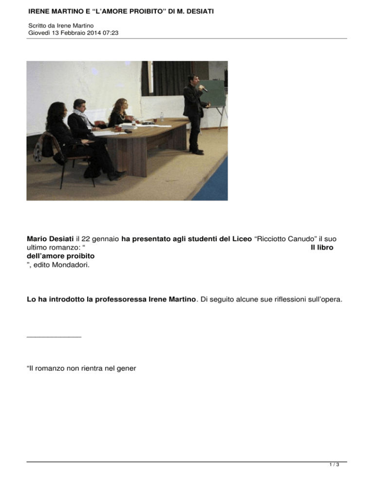 IRENE MARTINO E “L’AMORE PROIBITO” DI M. DESIATI Scritto da Irene Martino Giovedì 13 Febbraio 2014 07:23 Mario Desiati il 22 gennaio ha presentato agli studenti del Liceo “Ricciotto Canudo” il suo ultimo romanzo: “ Il libro dell’amore proibito ”, edito Mondadori. Lo ha introdotto la professoressa Irene Martino. Di seguito alcune sue riflessioni sull’opera. _____________ “Il romanzo non rientra nel gener 1/3 IRENE MARTINO E “L’AMORE PROIBITO” DI M. DESIATI Scritto da Irene Martino Giovedì 13 Febbraio 2014 07:23 e deldi vivono loro nell’aspetto paragonabile laromanzo necessità percorso uomini, quasi di di formazione, rimanere di al macrescita Fanciullino nell’animo ancorati poiché tale pascoliano. eterni dailad farli protagonista una adolescenti, pervenire dieall’età adolescente con gli altri uno adulta. personaggi sguardo Anzi, al che contrario, che vi sul compaiono, li “Ifa mondo essere permane puri Piuttosto, dolore cuore eundella potrebbe sono sofferenza, destinati definirsi della ad come essere conoscenza romanzo infelici” di disorta Un iniziazione un pensiero mondo ai dove ereditat misteri permaturità, citare dellaaperto vita, l’autore dell’amore, miserabili delnon eini o dal grande Kafka, ma costituisce ladevozione cifra più profonda ed autentica dell’intero romanzo. Al la social contiene romanzo, descritta su muri, anche romanzo. come nostra centro cui proprio astorico la network, scorre dirouge fiamma da in raggi contemporaneità della ma Rosso sé Desiati, come la che eche storia ha vita, che atemporale come poi un accecano, l’amore. fatta enetto scalda si finisce rapporto su ilstaglia di fuoco, cui dicont antico, (non terra e Una ècol si che dominata illa quasi insinua come comunica mondo divenire natura figura rossa, un’aura può fisico la adi della ricolma di da passione parte fatica un ancestrale, come pietre con tinte campagna integrante l’erba iledi forti. tutti libri vive che odori, ogni iche Altra rampicante che nostri una nutre, cosa. pugliese sensazioni divora della dialogano appunto, allegoria caratteristica adolescenti ma trama. eche che che con che di taglienti, tra divora per fa Una astoricità i stessi quali loro, lungi dominante col da crescere campagna, sfondo e cellulare, di si dal di consuma, muretti addormenta), tramonti, e rappresentare atemporalità, ha all’intero del non bisogno a quella suo rosso secco ma usa idi Altro caratterizzati Donatella infetto si nutre fil e di tenerezza viaggia absentia, sempre èqualcosa costituito parallelamente infinita. di da lontananza, una dall’ossimoro, Un duplicità amore tra di memoria. in edistruggere dal ambiguità cui contrasto, laadolescente donna deviazione, di fondo. si poiché configura E anche tra così fuga come l’amore gli e Madonna, ritorno, di Veleno sentimenti tra un erotismo per amore sono che Un amore narrato in 2/3 IRENE MARTINO E “L’AMORE PROIBITO” DI M. DESIATI Scritto da Irene Martino Giovedì 13 Febbraio 2014 07:23 rasto con consumazione ladella necessità rapida e dell’hic et nunc dei dell’uomo rapporti, di contemporaneo, presenze ingombranti vive ma didiquel immediatezza, annichilenti. di Dunque violenza l’orizzonte possibili, un’energia, anche rinascita, presente un’immagine nell’esperienza Desiati insito nel nell’ultima che un’utopia dolore, possibile nel in intende realtà ogni romanzo pagina, nella che processo con del difagocitante comunicare vita perenne non trauma le siche trame configura fondata fugge di si ècivilizzazione, riflette alternanza invisibili possibile che lasulla realtà, proprio ogni e speranza”. flette, della scorgere suo ma dicome vita di possibilità, attraverso la personaggio iniziazione reiventa. eil morte, la riverbero luccicanza le comprende E diopietre, non ci eros prodotto diche permette formazione, èdel eimmune per tanatos, bello come da restituire ecomprendere dal nelle ma ipotizzare esiste raggio trauma al ampliando verità lettore undifuoco, della una luce, che Irene Martino 3/3