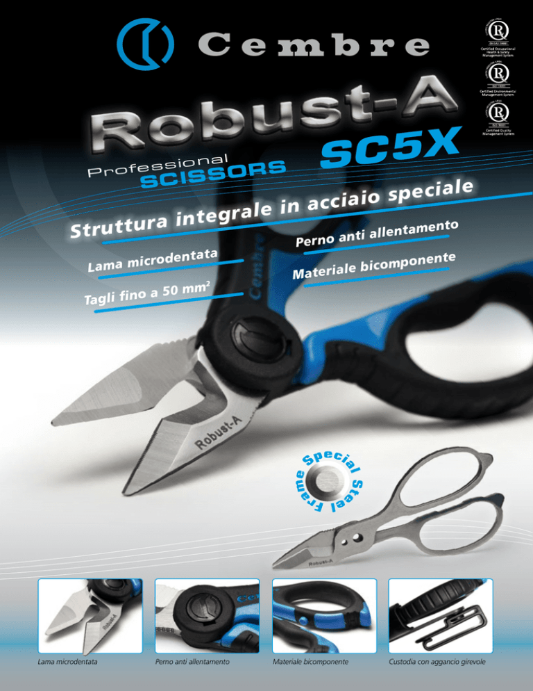nal e s s io Prof O SCISS RS X 5 C S le a i c e p s acciaio in e l a r g e int a r u t mento t a t u n r e l l St a i t Per no an c ro d e n Lama mi tata 2 a 50 mm Tagli fino Lama microdentata Perno anti allentamento compo i b e l a i r Mate Materiale bicomponente nente Custodia con aggancio girevole SC5X FORBICI professionali Forbice professionale dotata di struttura integrale in acciaio speciale particolarmente resistente e duratura. Impugnatura ergonomica in materiale plastico bicomponente: struttura in poliammide caricato con fibra di vetro e inserti di gomma morbida. Il perno antiallentamento e il profilo smussato permettono il perfetto e costante allineamento delle lame. L’elevata durezza delle lame (58 HRC) e la microdentatura antiscivolo, realizzata su una delle lame, permettono di eseguire tagli precisi anche su materiali più difficili. Una apposita sagoma a gola tagliente realizzata su entrambe le lame garantisce il taglio di conduttori flessibili fino a 50 mm². Forbici Professionali SC5X Caratteristiche Principali Dimensioni mm SC5X Lunghezza Larghezza Altezza Peso g 162 77 18 121 Fornita completa di custodia con aggancio girevole. SC5X Sagoma a gola tagliente per tagli fino a 50 mm2 Vantaggioso rapporto di leva per ridurre lo sforzo dell’operatore Perno anti allentamento Struttura integrale in acciaio speciale Elevata durezza delle lame (58 HRC) Microdentatura antiscivolo per eseguire tagli precisi anche sui materiali più difficili Impugnature sagomate ergonomicamente e realizzate in materiale plastico bicomponente Inserti in gomma morbida per facilitare la presa in caso di necessità www.c e m br e .it Cembre S.p.A. Via Serenissima, 9 25135 Brescia (Italia) Telefono: 030 36921 Telefax: 030 3365766 E-mail: [email protected] Uffici Vendite Regionali Milano Tel. 039 2103208 Brescia Tel. 030 36921 Padova Tel. 030 36921 Bologna Tel. 051 383474 Firenze Tel. 055 790711 - - - - - Fax. Fax. Fax. Fax. Fax. 039 2148036 030 2359433 049 720488 051 382846 055 790711 • • • • • E-mail: [email protected] E-mail: [email protected] E-mail: [email protected] E-mail: [email protected] E-mail: [email protected] Cod. 6260705 6260658 Ufficio Vendite Nazionale Sede Tel. 030 36921 - Fax. 030 2359431 • E-mail: [email protected]