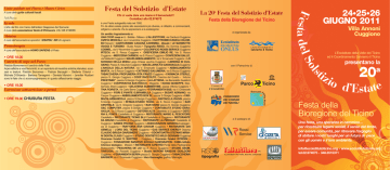 A cura delle guide culturali locali. Nel Parco Kyudo L’arte del tiro con l’arco dell’antico Giappone dei Samurai. A cura della associazione Vento di Primavera. info 338 2198089 Shiatsu A cura dell’associazione operatori SHIATSU XIN di Legnano Pranoterapia A cura dell’associazione HOMO SAPIENS di Prato • ORE 18.00 Concerto di arpe nel Parco Patrizia Borromeo e il cerchio delle Fate Arpe celtiche e voci femminili, in un repertorio di musiche antiche,irlandesi, scozzesi e bretoni. Patrizia Borromeo – Patrizia Barzaghi – Stefania Chierici – Michela D’Orlando - Barbara Tamagnini – Daniela Mancini – Jennifer Rustioni sono le fate che ci accompagneranno in questo affascinante viaggio. • ORE 19.00 Estrazione sottoscrizione a premi • ORE 19.30 CHIUSURA FESTA Festa del Solstizio d’Estate Chi ci vuole dare una mano è il benvenuto!!! Contattaci allo 02.974075 è una Festa autogestita nata nel 1992. Fin da allora esiste grazie alle associazioni più diverse, ai cittadini, a commercianti, artigiani e aziende che la apprezzano e la sostengono Un sentito ringraziamento a: UNA COOP coop a r.l. - Bollate - Milano • L’ALLESTITORE, via Carducci Cuggiono CIZETA MEDICALI, via 4 novembre Cuggiono • ELETTROMECCANICA COLOMBO Mesero • AGRITURISMO CASCINA CAREMMA - Besate • LE MARMOTTE VIAGGI E TURISMO - Busto Arsizio • Tipografia RISSO, Via Somma Cuggiono COSMEL, via IV Novembre Cuggiono • COLORIFICIO ROSSI SERVICE Cuggiono IRTECH, via S. Rocco Cuggiono • OREFICERIA EMILIO RE, Via S. Rocco Cuggiono • MERCERIA CARMEN, via S. Rocco Cuggiono • CONFEZIONI GALLO, via Matteotti Cuggiono • MAURI ABBIGLIAMENTO, via V. Emanuele Cuggiono • LO SCRIGNO DELLA MODA Largo Chiesa vecchia Cuggiono • LIBRERIA DI CUGGIONO, Piazza S. Maurizio Cuggiono • MACELLERIA F.lli GARAVAGLIA Cuggiono L’ANGOLO DELLA NATURA, via V. Emanuele Cuggiono • ABBIGLIAMENTO MARTA, via S.Rocco Cuggiono • CATTANEO SALUMERIA, via S.Rocco Cuggiono TABACCHERIA PROFUMERIA RITA FRAZZI Cuggiono • FARMACIA STERLE, piazza S. Giorgio Cuggiono • COOP RACCOLTO, Cascina del Guado - Induno PRESTINEE”, piazza S.Giorgio Cuggiono • LA LATTERIA, via Benedetto Gualdoni Cuggiono • COOPERATIVA SAN ROCCO - Magenta • NAGGI GIUSEPPE, Staz. Servizio Shell Cuggiono • GELATERIA SUMMERTIME, piazza Vittoria Cuggiono • TINA FIORISTA, via Carlo Berra Cuggiono • FERRAMENTA B&B, via V. Emanuele Cuggiono • FIORI E PIANTE G.BRAMBILLA Cuggiono • SUDATI ADRIANO, via Cavour Cuggiono • ABBIGLIAMENTO BOX 92, piazza S.Giorgio Cuggiono • FARMACIA ARMANDOLA, piazza S.Giorgio Cuggiono • RAFFAELLA VIAGGI, piazza S.Giorgio Cuggiono • RF/MAX-STUDIO TICINO, via S. Rocco Cuggiono • BAR CENTRALE, via S. Gregorio Cuggiono • BAR IVANO piazza S. Giorgio Cuggiono G&C COMPUTER, piazza S.Giorgio Cuggiono • CONTABILITÀ STUDIO GARAVAGLIA, via S.Rocco Cuggiono • OSTERIA ALTA Castelletto di Cuggiono • OSTERIA IL PONTE Castelletto di Cuggiono • RISTORANTE MARIO IL PESCATORE Castelletto • RISTORANTE TICINO BLU Castelletto di Cuggiono • RISTORANTE DA BRUNO Castelletto di Cuggiono • RISTORANTE LA PIROGUE Castelletto di Cuggiono • GAMES PISCINA Cuggiono • ASSICURAZIONI GENERALI subagenzia di Cuggiono • TRATTORIA BAR CAVOUR Cuggiono • RISTORANTE DAI GEMELLI - L’ORO DEL TICINO Cuggiono • GAS SERVICE ENERGY Ossona CLAUDIO BRUSA GIARDINIERE Cuggiono • ODONTOIATRA STEFANO MIRIANI DENTALCLASS Cuggiono • STUDIO DENTISTICO WILD GIOVANNI Cuggiono Onoranze funebri S. MARTINO – Cuggiono • Onoranze funebri INTROINI – Cuggiono • FONDAZIONE INIZIATIVE SOCIALI CANEGRATESI • FAMA Istituto Chimico biologico - Mesero • RISTORANTE S.PIETRO Ponte della Padregnana Robecchetto • PESCHERIA DE LIO via S. Rocco Cuggiono • STUDIO GEOM. TAVEGGIA, via Rossetti Cuggiono • Studio MORONI RANZANI GUALDONI Cuggiono • FERRAMENTA BERRA piazza S. Giorgio Cuggiono • TABACCHERIA BARBIERI via V. Emanuele Cuggiono • Vera Garavaglia, grafica, Malvaglio. La 20a Festa del Solstizio d’Estate Festa della Bioregione del Ticino è organizzata da: con il Patrocinio di: ols F e el S s d t a Visite guidate nel Parco e Museo Civico 24•25•26 GIUGNO 2011 Villa Annoni Cuggiono L’Ecoistituto della Valle del Ticino ed il Coordinamento Salviamo il Ticino presentano la tiz 20 io d’Estate Comune di CUGGIONO CONSORZIO DEI COMUNI DEI NAVIGLI a Festa della Bioregione del Ticino e il sostegno di: Una festa, una speranza in cammino… per ricostruire legami sociali, il senso del limite, per essere comunità, per ritrovare l’orgoglio di abitare i nostri luoghi per un futuro di pace con gli uomini e il loro ambiente. Rossi Service S.R.L. ALLESTIMENTI PER FIERE, MOSTRE, CONGRESSI [email protected] - www.ecoistitutoticino.org tel.02.974075 - 348.3515371 Venerdì 24 giugno • ORE 20.00 APERTURA FESTA E SPAZIO RISTORO • ORE 22.00 - Chiostro Enrico Gerli&Folks Friends in “Canzoni d’autore e tributo a Van De Sfroos” Enrico Gerli • chitarra, voce, armonica Sergio Gerli • voce e percussioni Flavio Gozzoli • chitarra acustica Paolo Salvaggio • violino Claudio Merlo • fisarmonica • ORE 14.30 - Sala Porticato presso l’Aia Primo torneo semilampo di Scacchi “Solstizio d’Estate” A cura del circolo scacchistico Cavalli & Segugi di Robecchetto con Induno. Musica e danze per tutti i gusti - spettacoli di ballo latino, Hip Hop e Break Dance. Sala delle Mangiatoie Domenica 26 giugno dalla mattina Un’idea “altra” di approvvigionamento di alimenti, in modo solidale ed equo, fondato sul rispetto della Terra e di chi la coltiva. Una cooperativa che vede insieme piccoli agricoltori biologici, e fruitori provenienti dai gruppi di acquisto solidale e dal mondo del lavoro. www.lestradedelfresco.com Libri in Mostra Nel parco e nei cortili di Villa Annoni Realizzati dai bambini delle scuole dell’infanzia di Castelletto e di Cuggiono. Nel Parco Mercatini e stands delle Associazioni NEMETON: Perdersi nel bosco iniz