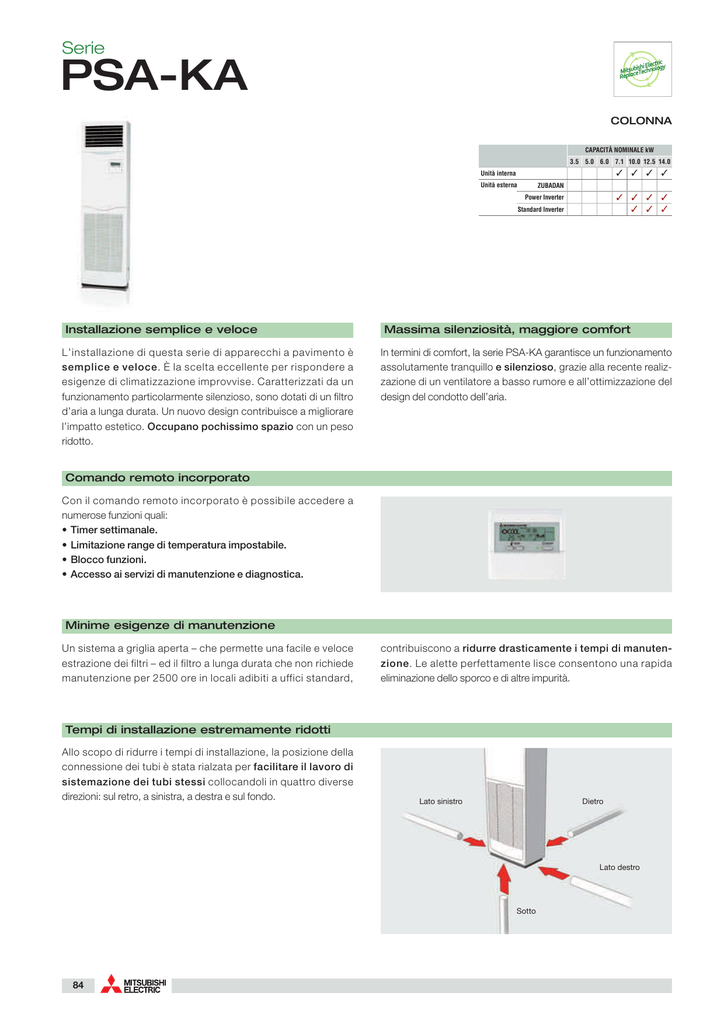 Serie PSA-KA COLONNA CAPACITÀ NOMINALE kW 3.5 5.0 6.0 7.1 10.0 12.5 14.0 Unità interna Unità esterna ZUBADAN Power Inverter Standard Inverter Installazione semplice e veloce L’installazione di questa serie di apparecchi a pavimento è semplice e veloce. È la scelta eccellente per rispondere a esigenze di climatizzazione improvvise. Caratterizzati da un funzionamento particolarmente silenzioso, sono dotati di un filtro d’aria a lunga durata. Un nuovo design contribuisce a migliorare l’impatto estetico. Occupano pochissimo spazio con un peso ridotto. ✓ ✓ ✓ ✓ ✓ ✓ ✓ ✓ ✓ ✓ ✓ ✓ ✓ ✓ ✓ ✓ ✓ ✓ ✓ ✓ ✓ ✓ ✓ ✓ ✓ ✓ Massima silenziosità, maggiore comfort In termini di comfort, la serie PSA-KA garantisce un funzionamento assolutamente tranquillo e silenzioso, grazie alla recente realizzazione di un ventilatore a basso rumore e all’ottimizzazione del design del condotto dell’aria. Comando remoto incorporato Con il comando remoto incorporato è possibile accedere a numerose funzioni quali: • Timer settimanale. • Limitazione range di temperatura impostabile. • Blocco funzioni. • Accesso ai servizi di manutenzione e diagnostica. Minime esigenze di manutenzione Un sistema a griglia aperta – che permette una facile e veloce estrazione dei filtri – ed il filtro a lunga durata che non richiede manutenzione per 2500 ore in locali adibiti a uffici standard, contribuiscono a ridurre drasticamente i tempi di manutenzione. Le alette perfettamente lisce consentono una rapida eliminazione dello sporco e di altre impurità. Tempi di installazione estremamente ridotti Allo scopo di ridurre i tempi di installazione, la posizione della connessione dei tubi è stata rialzata per facilitare il lavoro di sistemazione dei tubi stessi collocandoli in quattro diverse direzioni: sul retro, a sinistra, a destra e sul fondo. Lato sinistro Dietro Lato destro Sotto 84 Unità interna Unità esterne PSA-RP71/100/125/140KA Joint Lap - 71 Comando remoto Rare Earth Magnet PUHZ-ZRP71 DC Fan Motor PUHZ-ZRP100/125/140 Grooved Piping DC Scroll - 100-140 LINEA COMMERCIAL Optional Optional INVERTER POMPA DI CALORE SPECIFICHE TECNICHE UNITÀ INTERNA PSA-RP71KA Unità esterna PUHZ-ZRP71VHA Alimentazione Tensione/Freq./Fasi Raffreddamento Capacità nominale (min/max) T=+35°C Potenza assorbita nominale T=+35°C EER T=+35°C Carico teorico (PdesignC) SEER Classe di efficienza energetica Consumo energetico annuo1 Riscaldamento Capacità nominale (min/max) T=+7°C Stagione media Potenza assorbita nominale T=+7°C COP Carico teorico (Pdesignh) T=-10°C SCOP Classe di efficienza energetica Consumo energetico annuo1 Capacità dichiarata a Tdesignh a Tbivalent a Tol Potenza termica di back-up (elbuTj) Unità interna Dimensioni AxLxP Peso Portata aria Pressione sonora Potenza sonora Unità esterna Dimensioni AxLxP Peso Pressione sonora Raffreddamento Riscaldamento Potenza sonora Massima corrente assorbita Magnetotermico consigliato 1f / 3f Linee frigorifere Diametri Liquido/Gas Lunghezza max Dislivello max Campo di funz. Raffreddamento garantito Riscaldamento Refrigerante (GWP)2 1, 2 V/Hz/n° kW kW kW 1f / 3f kWh/a kW kW kW kWh/a kW kW kW kW mm kg m3/min dB(A) dB(A) mm kg dB(A) dB(A) dB(A) A A mm m m °C °C PSA-RP100KA PSA-RP125KA PSA-RP140KA PUHZ-ZRP100VKA PUHZ-ZRP125VKA PUHZ-ZRP140VKA PUHZ-ZRP100YKA PUHZ-ZRP125YKA PUHZ-ZRP140YKA 230 / 50 / 1 230 / 50 / 1 230 / 50 / 1 400 / 50 / 3+N 400 / 50 / 3+N 400 / 50 / 3+N 7,1 (3,3 - 8,1) 10,0 (4,9 - 11,4) 12,5 (5,5 - 14,0) 13,4 (6,2 - 15,0) 1,89 2,75 4,09 4,06 3,76 3,64 3,06 3,30 7,1 10,0 12,5 13,4 6,3 5,6 / 5,5 5,0 / 4,9 5,3 A++ A+ / A - - 396 629 / 640 - - 7,6 (3,5 - 10,2) 11,2 (4,5 - 14,0) 14,0 (5,0 - 16,0) 16,0 (5,7 - 18,0) 2,21 3,08 4,24 4,79 3,44 3,64 3,30 3,34 4,7 7,8 9,3 10,6 4,0 4,0 4,0 4,4 A+ A+ - - 1666 2761 - - 4,7 (-10°C) 7,8 (-10°C) 9,3 (-10°C) 10,6 (-10°C) 4,7 (-10°C) 7,8 (-10°C) 9,3 (-10°C) 10,6 (-10°C) 3,5 (-20°C) 5,8 (-20°C) 7,0 (-20°C) 7,9 (-20°C) 0 0 0 0 230 / 50 / 1 1900 x 600 x 360 46 46 46 48 20 - 22 - 24 25 - 28 - 30 25 - 28 - 31 25 - 28 - 31 40 - 42 - 44 45 - 49 - 51 45 - 49 - 51 45 - 49 - 51 60 65 66 66 943 x 950 x 330(+30) 1338 x 1050 x 330(+30) 67 116 / 124 116 / 126 119 / 132 47 49 50 50 48 51 52 52 67 69 70 70 19,4 27,2 / 8,7 27,2 / 10,2 28,7 / 11,7 25 32 / 16 40 / 16 9,52 / 15,88 50 75 30 -15 ~ +46 -20 ~ +21 R-410A (1975) Note di riferimento vedi ultima pagina. 85 Unità interna Unità esterne STANDARD INVERTER PSA-RP100/125/140KA Joint Lap - 71 Comando remoto Rare Earth Magnet PUHZ-P100 DC Fan Motor 100-140 100-140 PUHZ-P125/140 DC Rotary Grooved Piping SERIE PSA-GA Optional Optional INVERTER POMPA DI CALORE SPECIFICHE TECNICHE UNITÀ INTERNA Unità esterna Alimentazione Tensione/Freq./Fasi Raffreddamento Capacità nominale (min/max) T=+35°C Potenza assorbita nominale T=+35°C EER T=+35°C Carico teorico (PdesignC) SEER Classe di efficienza energetica Consumo energetico annuo1 Riscaldamento Capacità nominale (min/max) T=+7°C Stagione media Potenza assorbita nominale T=+7°C COP Carico teorico (Pdesignh) T=-10°C SCOP Classe di efficienza energetica Consumo energetico annuo1 Capacità dichiarata a Tdesignh a Tbivalent a Tol Potenza termica di back-up (elbuTj) Unità interna Dimensioni AxLxP Peso Portata aria Pressione sonora Potenza sonora Unità esterna Dimensioni AxLxP Peso Pressione sonora Raffreddamento Riscaldamento Potenza sonora Massima corrente assorbita Magnetotermico consigliato 1f / 3f Linee frigorifere Diametri Liquido/Gas Lunghezza max Dislivello max Campo di funz. Raffreddamento garantito Riscaldamento Refrigerante (GWP)2 1, 2 Note di riferimento vedi ultima pagina. 86 V/Hz/n° kW kW kW 1f / 3f kWh/a kW kW kW kWh/a kW kW kW kW mm kg m3/min dB(A) dB(A) mm kg dB(A) dB(A) dB(A) A A mm m m °C °C PSA-RP100KA PSA-RP125KA PSA-RP140KA PUHZ-P100VHA4 PUHZ-P125VHA3 PUHZ-P140VHA3 PUHZ-P100YHA2 PUHZ-P125YHA PUHZ-P140YHA 230 / 50 / 1 230 / 50 / 1 230 / 50 / 1 400 / 50 / 3+N 400 / 50 / 3+N 