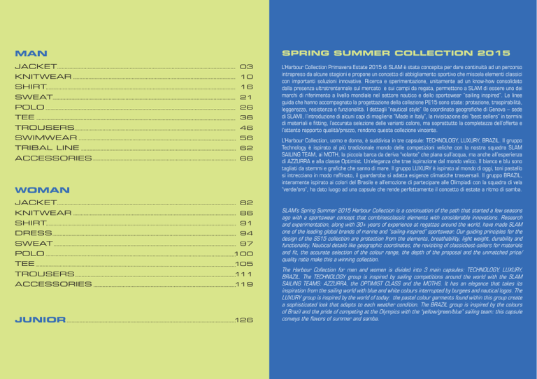 SPRING SUMMER COLLECTION 2015 MAN JACKET 03 KNITWEAR 10 SHIRT 16 SWEAT 21 POLO 26 TEE 36 TROUSERS 46 SWIMWEAR 56 TRIBAL LINE 62 ACCESSORIES 66 WOMAN JACKET 82 KNITWEAR 86 SHIRT 91 DRESS 94 SWEAT 97 POLO 100 TEE 105 TROUSERS 111 ACCESSORIES 119 JUNIOR 126 L’Harbour Collection Primavera Estate 2015 di SLAM è stata concepita per dare continuità ad un percorso intrapreso da alcune stagioni e propone un concetto di abbigliamento sportivo che miscela elementi classici con importanti soluzioni innovative. Ricerca e sperimentazione, unitamente ad un know-how consolidato dalla presenza ultratrentennale sul mercato e sui campi da regata, permettono a SLAM di essere uno dei marchi di riferimento a livello mondiale nel settore nautico e dello sportswear “sailing inspired”. Le linee guida che hanno accompagnato la progettazione della collezione PE15 sono state: protezione, traspirabilità, leggerezza, resistenza e funzionalità. I dettagli “nautical style” (le coordinate geografiche di Genova – sede di SLAM), l’introduzione di alcuni capi di maglieria “Made in Italy”, la rivisitazione dei “best sellers” in termini di materiali e fitting, l’accurata selezione delle varianti colore, ma soprattutto la completezza dell’offerta e l’attento rapporto qualità/prezzo, rendono questa collezione vincente. L’Harbour Collection, uomo e donna, è suddivisa in tre capsule: TECHNOLOGY, LUXURY, BRAZIL. Il gruppo Technology è ispirato al più tradizionale mondo delle competizioni veliche con la nostra squadra SLAM SAILING TEAM, ai MOTH, la piccola barca da deriva “volante” che plana sull’acqua, ma anche all’esperienza di AZZURRA e alla classe Optimist. Un’eleganza che trae ispirazione dal mondo velico. Il bianco e blu sono tagliati da stemmi e grafiche che sanno di mare. Il gruppo LUXURY è ispirato al mondo di oggi, toni pastello si intrecciano in modo raffinato, il guardaroba si adatta esigenze climatiche trasversali. Il gruppo BRAZIL, interamente ispirato ai colori del Brasile e all’emozione di partecipare alle Olimpiadi con la squadra di vela “verde/oro“, ha dato luogo ad una capsule che rende perfettamente il concetto di estate a ritmo di samba. SLAM’s Spring Summer 2015 Harbour Collection is a continuation of the path that started a few seasons ago with a sportswear concept that combinesclassic elements with considerable innovations. Research and experimentation, along with 30+ years of experience at regattas around the world, have made SLAM one of the leading global brands of marine and “sailing-inspired” sportswear. Our guiding principles for the design of the SS15 collection are protection from the elements, breathability, light weight, durability and functionality. Nautical details like geographic coordinates, the revisiting of classicbest-sellers for materials and fit, the accurate selection of the colour range, the depth of the proposal and the unmatched price/ quality ratio make this a winning collection. The Harbour Collection for men and women is divided into 3 main capsules: TECHNOLOGY, LUXURY, BRAZIL. The TECHNOLOGY group is inspired by sailing competitions around the world with the SLAM SAILING TEAMS: AZZURRA, the OPTIMIST CLASS and the MOTHS. It has an elegance that takes its inspiration from the sailing world with blue and white colours interrupted by burgees and nautical logos. The LUXURY group is inspired by the world of today: the pastel colour garments found within this group create a sophisticated look that adapts to each weather condition. The BRAZIL group is inspired by the colours of Brazil and the pride of competing at the Olympics with the “yellow/green/blue” sailing team: this capsule conveys the flavors of summer and samba. S110769S00 S110762S00 S110762S00 S110769S00 SUMMER SAILING JKT SUMMER SAILING G VEST Water repellent Windproof 100 WHITE C/C 150 NAVY NYLON TASLON 120 0 gr 100% NY XS-3XL 210 ICE 500 BLACK 625 SLAM RED 739 STEEL MANJACKET NYLON TASLON 120 gr 100% NY XS-3XL 3 100 WHITE 150 NAVY C/C 210 ICE 625 SLAM RED S101096S00 S101102S00 S101102S00 S101096S00 01096S00 PORTOFINO MAN SJ JACKET KET BAYONNE Waterproof Water repellent 3000 mm Breathable Windproof 3000 gr/sqm/24h Thermotape Windproof 065 LT GREY GR REY NYLON ON TASLON 120 gr 100% % NY S-3XL 100 WHITE WHITTE T C/C 150 NAVY NAVVYY 625 SLAM M RED MANJACKET NYLON RIP STOP 135 gr 100% NY XS-3XL 4 150 NAVY C05 SILVER CLOUD C/C S123043S00 S123012S00 S123012S00 2S00 S123043S00 SHORT JACKET CKET SABAYA NEW SHORT ORT JACKET CALAIS Water repellent epellent Water repellent Windproof of Windproof NYLON TASLON LON 120 gr 100% NY S-3XL NYLON YLON TASLON 120 gr 100% 00% NY S-3XL The fabric of the sample is not correct, refer to the SUMMER SAILING JKT NEW fabric. 100 WHITE 150 0 NAVY 640 6 0 PAPAYA C/C C02 PALACE BLUE C08 STILL WATER C 0 C10 HEDGE GREEN C C11 DOESKIN MANJACKET Il tessuto del campione non è corretto, fare riferimento al SUMMER SAILING JKT NEW. 5 150 0 NAVY C05 SILVER C0 S CCLOUD O C09 ARCTIC C C contrast PALACE BLUE lining LT GREY MEL contrast STILL WATER lining LT GREY MEL contrast SMOKE lining LT GREY MEL C/C S123061S00 S101067S00 S101067S00 67S00 S123061S00 3061S00 JACKET KNOCK SHORT T JACKET OREGON Waterproof terproof Waterproof 5000 mm 3000 mm Breathable athable Breathable 5000 gr/sqm/24h 3000 gr/sqm/24h Thermotape rmotape Thermotape Essential ential SUPERSOFT RSOFT NYLON 65 gr 100% NY S-3XL The hood will be re-proportioned. The lining grey melange colour is wrong, pls refer to the S123043S00 CALAIS lining colour; the logoed tape at inner face flap is wrong, pls refer to S123060S00 BONIFACIO. Il cappuccio verrà ridimensionato. Il colore grigio melange della fodera è sbagliato, riferirsi allo stile S123043S00 CALAIS. Il tape logato lungo l’apertura è sbagliato, riferirsi allo stile S123060S00 BONIFACIO. 144 OCEAN BLUE C02 PALACE BLUE C0 C16 C1 16 CANARY YELLOW lining SILVER chest zipper PALACE BLUE lining SILVER chest zipper DEEP SEA lining SILVER chest