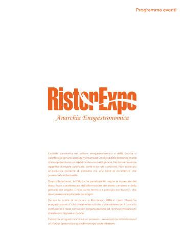 Programma eventi Ristorexpo2016 Mercoledì 17 febbraio 2016 Ore 11.00 | Sondrio, Consorzio di Tutela vini di Valtellina Conferenza stampa di presentazione della 19^ edizione di Ristorexpo Domenica 21 febbraio 2016 Ore 10.30 | Sala Porro Inaugurazione ufficiale della 19^ edizione di Ristorexpo Intervengono: Giovanni Ciceri, Ideatore e curatore di Ristorexpo Giacomo Mojoli, Giornalista, Design Thinking food and wine Davide Paolini, Giornalista Marco Stabile, Presidente Jeunes Restaurateurs d’Europe Davide Scabin, Chef Presenta: Federico Quaranta, Decanter - Rai Radio2 Nel corso dell’inaugurazione, cerimonia di assegnazione del Premio alla Carriera Ristorexpo 2016 Intera giornata | Pad. C LE OSTERIE SlowCooking Menù della tradizione territoriale accompagnati da prestigiosi vini della Valtellina Presenti le Osterie: Al Gigianca, San Gerolamo, Osteria del Crotto Ore 12.00 | Pad. A Stand n. 18 Il benessere nel primo piatto Concetto e Bilanciamento Nutrizionale di un Primo Piatto a base di Gnocchi Artigianali senza Glutine e Lattosio – Indice di Digeribilità e Glicemico. Relazione e Degustazione a cura del Maestro: Raimondo Mendolia – Technology Chef A cura della BGS Srl di Travagliato BS Ore 14.00 | Corpo Centrale SCUOLA DI CUCINA Incontro con gli chef Fabrizio Ferrari, Al Porticciolo 84| Lecco e Giancarlo Morelli, Pomiroeu | Seregno Passato alla guida del ristorante di famiglia “Al Porticciolo 84”, locale storico del panorama gourmet di Lecco, Fabrizio Ferrari ha maturato diverse esperienze al fianco di chef di fama internazionale, tra cui René Redzepi al Noma di Copenaghen e Mauro Uliassi. Stella Michelin da 2006, Ferrari dal 2012 è membro dell’Associazione “Jeunes Réstaurateurs d’Europe”. Giancarlo Morelli fin da piccolo ha avuto ben chiaro cosa volesse fare da grande: il cuoco. Come tutti gli chef fa la gavetta, quella dura. Studia, viaggia, gira il mondo, viene a contatto con i grandi esponenti della cultura e dell’arte, incontra e si confronta con i simulacri dell’alta cucina, sperimenta fornelli esotici, assaggia, prova, affina il palato e la tecnica, trova la sua strada, la sua filosofia, la sua idea di bellezza. Giancarlo Morelli, dirompente, visionario, creativo, eclettico, è convinto che il cibo sia la poesia della terra, che un piatto debba scatenare emozioni, attivare la memoria e generare benessere. Ore 15.00 | Spazio Forum DEGUSTAZIONE VINI Degustazione guidata vini a cura di ONAV Ore 16.30 | Corpo centrale INCONTRO CON DEGUSTAZIONE: Ripopoliamo con l’alborella. Intervengono: Giovanni Ciceri, Ideatore e curatore di Ristorexpo Valentina Tepedino, Consulente specializzata nella formazione e promozione per il settore ittico Giacomo Mojoli, Giornalista, Design Thinking food and wine Mauro Elli, Chef Andrea Camesasca, Delegato al turismo Camera di Commercio di Como Durante l’incontro verrà preparata e offerta al pubblico una degustazione di alborelle fritte Ore 20.00 | Ristorante Castello di Casiglio, Erba CENA DI GALA “Anarchia enogastronomica”: la cucina secondo gli chef Mauro Elli, Fabrizio Ferrari, Giancarlo Morelli, Carmelo Sciarrabba Prenotazione obbligatoria (Tel. 031 637402 – [email protected]) Lunedì 22 febbraio 2016 Intera giornata – Pad. C LE OSTERIE SlowCooking Menù della tradizione territoriale accompagnati da prestigiosi vini della Valtellina Presenti le Osterie: da Sapì, La Madia, La Piana Ore 10.00 – Pad B Stand n. 170 1° CONCORSO DI GELATERIA: Campioni in Erba Competizione di gelateria con tema: “Il miele” organizzata da Fabar in collaborazione con Delicati Equilibri. Ore 10.30 – Corpo Centrale CAMPARI ACADEMY: Masterclass Ore 10.30 – Sala Lario CONVEGNO: Ristorazione, etichettatura alimentare, allergeni e salute Come soddisfare il consumatore più attento: la nuova normativa sugli allergeni e sull'etichettatura degli alimenti, l’alimentazione in salute. Apertura dei lavori e saluti: Giuseppe Ciresa, Presidente Confcommercio Lecco "Etichettatura degli alimenti: cosa dobbiamo sapere? I dati del territorio" "Allergie alimentari e tutela del consumatore" Intervengono: Angelo Ferraroli, Responsabile del Servizio Igiene Alimenti e Nutrizione ATS Brianza sede Territoriale di Lecco Emanuela Donghi, Dietista del Servizio Igiene Alimenti e Nutrizione ATS Brianza sede territoriale di Lecco “Alimenti in salute: una nuova alleanza tra produttore e consumatore” Interviene: Franco Tortorella, Coordinatore Rete "Alimenti in Salute” - ATS della Brianza, S. Medicina Preventiva di Comunità sede territoriale Lecco Modera: Matteo Frasson, Responsabile Confcommercio Lecco in materia di Igiene e Sanità. A cura di Confcommercio Lecco Ore 11.00 – Sala Porro LECTIO MAGISTRALIS Incontro con lo chef Igles Corelli | Atman | Lamporecchio Chef geniale e creativo, Igles Corelli è stato per molti versi un precursore: è lui tra i primi professionisti ad intuire la potenzialità della cucina come spettacolo, ma anche ad identificare la necessità di confronto e scambio tra i professionisti alla ricerca di nuovi stimoli. Igles arriva alla ribalta nazionale e internazionale tra gli anni ottanta e novanta, come chef dell’ormai mitico ristorante Trigabolo di Argenta, in provincia di Ferrara. Nei quattordici anni a capo della brigata di cucina, che ha poi prodotto molti chef di successo, Corelli raccoglie numerosi riconoscimenti, oltre all’assegnazione di due stelle dalla Guida Michelin, collocandosi tra i primi ristoranti d’Italia del periodo e contribuendo all’avanzamento della cucina italiana con piatti considerati oggi storici. Dal 2010 Igles Corelli è lo chef del ristorante Atman di Lamporecchio, in provincia di Pistoia, dove propone la propria cucina, definita spesso come “cucina garibaldina”, poiché valorizza le eccellenze di tutta Italia. Da anni è protagonista di programmi televisivi nazionali tra cui il più recente “Il gusto di Igles” su Gambero Rosso Channel, collabora con la scuola di alta formazione del