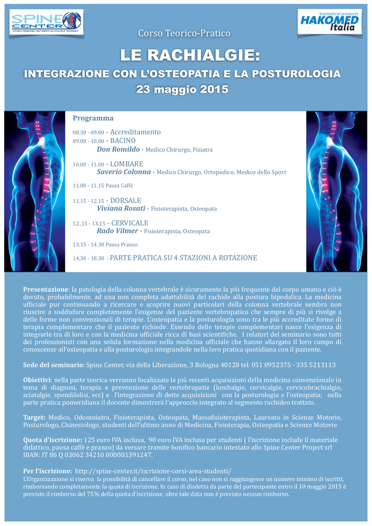 Corso Teorico-‐Pratico LE RACHIALGIE: INTEGRAZIONE CON L’OSTEOPATIA E LA POSTUROLOGIA 23 maggio 2015 ! Programma 08.30 -‐ 09.00 -‐ Accreditamento 09.00 -‐ 10.00 -‐ BACINO ! ! ! ! ! ! Don Romildo -‐ Medico Chirurgo, Fisiatra 10.00 -‐ 11.00 -‐ LOMBARE Saverio Colonna -‐ Medico Chirurgo, Ortopedico, Medico dello Sport 11.00 -‐ 11.15 Pausa Caffè 11.15 -‐ 12.15 -‐ DORSALE Viviana Rosati -‐ Fisioterapista, Osteopata 12.,15 -‐ 13.15 -‐ CERVICALE Rado Vilmer -‐ Fisioterapista, Osteopata 13.15 -‐ 14.30 Pausa Pranzo 14.30 -‐ 18.30 -‐ PARTE PRATICA SU 4 STAZIONI A ROTAZIONE Presentazione: la patologia della colonna vertebrale è sicuramente la più frequente del corpo umano e ciò è dovuto, probabilmente, ad una non completa adattabilità del rachide alla postura bipodalica. La medicina uf>iciale pur continuando a ricercare e scoprire nuovi particolari della colonna vertebrale sembra non riuscire a soddisfare completamente l’esigenze del paziente vertebropatico che sempre di più si rivolge a delle forme non convenzionali di terapie. L’osteopatia e la posturologia sono tra le più accreditate forme di terapia complementare che il paziente richiede. Essendo delle terapie complementari nasce l’esigenza di integrarle tra di loro e con la medicina uf>iciale ricca di basi scienti>iche. I relatori del seminario sono tutti dei professionisti con una solida formazione nella medicina uf>iciale che hanno allargato il loro campo di conoscenze all’osteopatia e alla posturologia integrandole nella loro pratica quotidiana con il paziente. !Sede del seminario: Spine Center, via della Liberazione, 3 Bologna 40128 tel. 051 0952375 -‐ 335 5213113 !Obiettivi: nella parte teorica verranno focalizzate le più recenti acquisizioni della medicina convenzionale in tema di diagnosi, terapia e prevenzione delle vertebropatie (lombalgie, cervicalgie, cervicobrachialgie, sciatalgie, spondilolisi, ecc) e l’integrazione di dette acquisizioni con la posturologia e l’osteopatia; nella parte pratica pomeridiana il docente dimostrerà l’approccio integrato al segmento rachideo trattato. !Target: Medico, Odontoiatra, Fisioterapista, Osteopata, Masso>isioterapista, Laureato in Scienze Motorie, Posturologo, Chinesiologo, studenti dell’ultimo anno di Medicina, Fisioterapia, Osteopatia e Scienze Motorie !Quota d’iscrizione: 125 euro IVA inclusa, 90 euro IVA inclusa per studenti ( l’iscrizione include il materiale didattico, pausa caffè e pranzo) da versare tramite boni>ico bancario intestato allo Spine Center Project srl IBAN: IT 86 Q 03062 34210 000001391247. ! Per l’iscrizione: http://spine-‐center.it/iscrizione-‐corsi-‐area-‐studenti/ L’Organizzazione si riserva la possibilità di cancellare il corso, nel caso non si raggiungesse un numero minimo di iscritti, rimborsando completamente la quota di iscrizione. In caso di disdetta da parte del partecipante entro il 10 maggio 2015 è previsto il rimborso del 75% della quota d’iscrizione, oltre tale data non è previsto nessun rimborso.