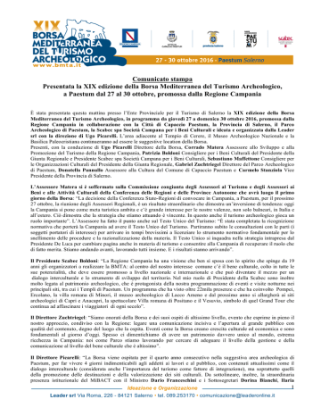 Comunicato stampa Presentata la XIX edizione della Borsa Mediterranea del Turismo Archeologico, a Paestum dal 27 al 30 ottobre, promossa dalla Regione Campania È stata presentata questa mattina presso l’Ente Provinciale per il Turismo di Salerno la XIX edizione della Borsa Mediterranea del Turismo Archeologico, in programma da giovedì 27 a domenica 30 ottobre 2016, promossa dalla Regione Campania in collaborazione con la Città di Capaccio Paestum, la Provincia di Salerno, il Parco Archeologico di Paestum, la Scabec spa Società Campana per i Beni Culturali e ideata e organizzata dalla Leader srl con la direzione di Ugo Picarelli. L’area adiacente al Tempio di Cerere, il Museo Archeologico Nazionale e la Basilica Paleocristiana continueranno ad essere le suggestive location della Borsa. Presenti, con la conduzione di Ugo Picarelli Direttore della Borsa, Corrado Matera Assessore allo Sviluppo e alla Promozione del Turismo della Regione Campania, Patrizia Boldoni Consigliere per i Beni Culturali del Presidente della Giunta Regionale e Presidente Scabec spa Società Campana per i Beni Culturali, Sebastiano Maffettone Consigliere per le Organizzazioni Culturali del Presidente della Giunta Regionale, Gabriel Zuchtriegel Direttore del Parco Archeologico di Paestum, Donatella Pannullo Assessore alla Cultura del Comune di Capaccio Paestum e Carmelo Stanziola Vice Presidente della Provincia di Salerno. L’Assessore Matera si è soffermato sulla Commissione congiunta degli Assessori al Turismo e degli Assessori ai Beni e alle Attività Culturali della Conferenza delle Regioni e delle Province Autonome che avrà luogo il primo giorno della Borsa: “La decisione della Conferenza Stato-Regioni di convocare in Campania, a Paestum, per il prossimo 27 ottobre, la riunione degli Assessori Regionali, è un risultato straordinario che dimostra un’inversione di tendenza: oggi la Campania si pone come meta turistica ambita e c’è grande interesse per le nostre valenze, non solo balneari, in Italia e all’estero. Ciò dimostra che la strategia che stiamo attuando è vincente. In questo anche il turismo archeologico gioca un ruolo importante”. L’Assessore ha fatto il punto anche sul Testo Unico del Turismo: “È stata completata la ricognizione normativa che porterà la Campania ad avere il Testo Unico del Turismo. Partiranno subito le consultazioni con le parti (i soggetti portatori di interesse) per arrivare in tempi brevissimi a licenziare lo strumento normativo fondamentale per lo snellimento delle procedure e la razionalizzazione della materia. Il Testo Unico si inquadra nella strategia intrapresa dal Presidente De Luca per cambiare pagina anche in materia di turismo e consentire alla Campania di recuperare il ruolo che di fatto merita. Stiamo andando avanti, lavorando tutti insieme. E i risultati stanno arrivando”. Il Presidente Scabec Boldoni: “La Regione Campania ha una visione che ben si sposa con lo spirito che spinge da 19 anni gli organizzatori a realizzare la BMTA: al centro del nostro interesse comune c’è il bene culturale, colto in tutte le sue potenzialità, che deve essere promosso a livello nazionale e internazionale e che può diventare il mezzo per un dialogo interculturale e lo strumento di sviluppo del territorio. Nel mio ruolo di Presidente della Scabec sono inoltre molto legata al patrimonio archeologico, che è protagonista della nostra programmazione di eventi e visite notturne nei principali siti, tra cui i Templi di Paestum. Un programma che ha visto oltre 22mila presenze e che ha coinvolto Pompei, Ercolano, la villa romana di Minori, il museo archeologico di Lacco Ameno e dal prossimo anno si allargherà ai siti archeologici di Capri e Anacapri, la spettacolare Villa romana di Positano e il Vesuvio, simbolo di quel Grand Tour che continua ad affascinare i viaggiatori di ogni secolo”. Il Direttore Zuchtriegel: “Siamo onorati della Borsa e dei suoi ospiti di altissimo livello, evento che esprime in pieno il nostro approccio, condiviso con la Regione: legare una comunicazione incisiva e l’apertura al grande pubblico con qualità del contenuto, degno del luogo che la ospita. Eventi come la Borsa creano crescita culturale ed economica e sono fondamentali al giorno d’oggi. Spesso ci dimentichiamo di avere un patrimonio davvero unico al mondo, estrema ricchezza in Campania: noi come Parco stiamo lavorando per cercare di adeguare il livello della gestione e della comunicazione al livello del bene culturale che è altissimo”. Il Direttore Picarelli: “La Borsa viene ospitata per il quarto anno consecutivo nella suggestiva area archeologica di Paestum, per far vivere 4 giorni indimenticabili agli addetti ai lavori e al pubblico, con contenuti attualissimi come il dialogo interculturale (considerata anche l’importanza del turismo come fattore di integrazione), ma soprattutto quelli della promozione delle destinazioni e della valorizzazione dei siti culturali. Da sottolineare, inoltre, la straordinaria presenza istituzionale del MiBACT con il Ministro Dario Franceschini e i Sottosegretari Dorina Bianchi, Ilaria Ideazione e Organizzazione Leader srl Via Roma, 226 - 84121 Salerno • tel. 089.253170 • [email protected] 1 Borletti Buitoni e Antimo Cesaro, oltre che a Silvia Costa Presidente Commissione Cultura e Istruzione del Parlamento Europeo, Antonia Pasqua Recchia Segretario Generale del MiBACT, Giuliano Volpe Presidente Consiglio Superiore per i Beni Culturali e Paesaggistici, Caterina Bon Valsassina Direttore Generale Archeologia, Belle Arti e Paesaggio del MiBACT, Francesco Palumbo Direttore Generale Turismo del MiBACT, Fabrizio Parrulli Comandante Carabinieri Tutela Patrimonio Culturale. IL PROGRAMMA La BMTA si conferma un format di successo – testimoniato dalle prestigiose collaborazioni di organismi internazionali quali UNESCO, UNWTO e ICCROM – e un evento originale nel suo genere: sede dell’unico Salone espositivo al mondo del patrimonio a
