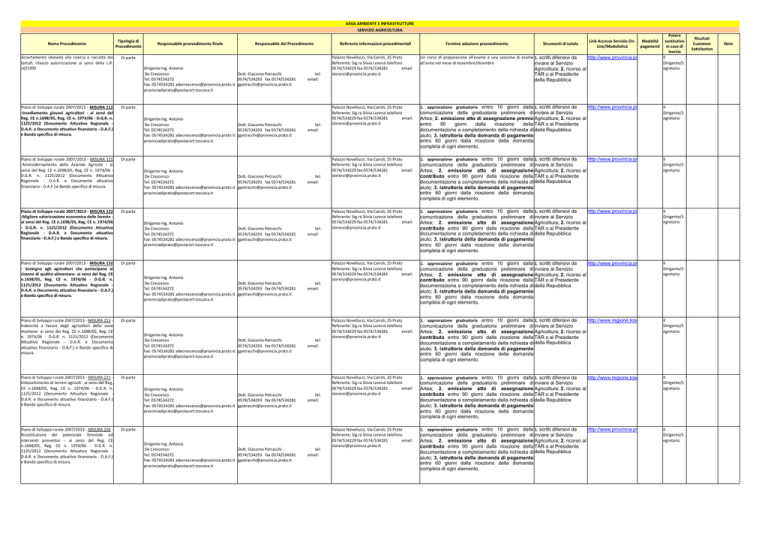 AREA AMBIENTE E INFRASTRUTTURE SERVIZIO AGRICOLTURA Nome Procedimento Accertamento idoneità alla ricerca e raccolta dei tartufi; rilascio autorizzazione ai sensi della L.R. 50/1995 Tipologia di Procedimento Responsabile provvedimento finale Responsabile del Procedimento Di parte Dirigente Ing. Antonio De Crescenzo Dott. Giacomo Petracchi Tel: 0574534272 0574/534293 fax 0574/534281 Fax: 0574534281 [email protected] [email protected] [email protected] Piano di Sviluppo rurale 2007/2013 - MISURA 112 -Insediamento giovani agricoltori - ai sensi del Reg. CE n.1698/05, Reg. CE n. 1974/06 - D.G.R. n. 1125/2012 (Documento Attuativo Regionale D.A.R. e Documento attuativo finanziario - D.A.F.) e Bando specifico di misura. Di parte Piano di Sviluppo rurale 2007/2013 - MISURA 121 -Ammodernamento delle Aziende Agricole - ai sensi del Reg. CE n.1698/05, Reg. CE n. 1974/06 D.G.R. n. 1125/2012 (Documento Attuativo Regionale - D.A.R. e Documento attuativo finanziario - D.A.F.) e Bando specifico di misura. Di parte Piano di Sviluppo rurale 2007/2013 - MISURA 122 -Migliore valorizzazione economica delle foreste ai sensi del Reg. CE n.1698/05, Reg. CE n. 1974/06 - D.G.R. n. 1125/2012 (Documento Attuativo Regionale - D.A.R. e Documento attuativo finanziario - D.A.F.) e Bando specifico di misura. Di parte Piano di Sviluppo rurale 2007/2013 - MISURA 132 - Sostegno agli agricoltori che partecipano ai sistemi di qualità alimentare- ai sensi del Reg. CE n.1698/05, Reg. CE n. 1974/06 - D.G.R. n. 1125/2012 (Documento Attuativo Regionale D.A.R. e Documento attuativo finanziario - D.A.F.) e Bando specifico di misura. Di parte Piano di Sviluppo rurale 2007/2013 - MISURA 211 Indennità a favore degli agricoltori delle zone montane- ai sensi del Reg. CE n.1698/05, Reg. CE n. 1974/06 - D.G.R. n. 1125/2012 (Documento Attuativo Regionale - D.A.R. e Documento attuativo finanziario - D.A.F.) e Bando specifico di misura. Di parte Piano di Sviluppo rurale 2007/2013 - MISURA 221 Imboschimento di terreni agricoli - ai sensi del Reg. CE n.1698/05, Reg. CE n. 1974/06 - D.G.R. n. 1125/2012 (Documento Attuativo Regionale D.A.R. e Documento attuativo finanziario - D.A.F.) e Bando specifico di misura. Di parte Piano di Sviluppo rurale 2007/2013 - MISURA 226 Ricostituzione del potenziale forestale ed interventi preventivi - ai sensi del Reg. CE n.1698/05, Reg. CE n. 1974/06 - D.G.R. n. 1125/2012 (Documento Attuativo Regionale D.A.R. e Documento attuativo finanziario - D.A.F.) e Bando specifico di misura. Di parte Dirigente Ing. Antonio De Crescenzo Dott. Giacomo Petracchi Tel: 0574534272 0574/534293 fax 0574/534281 Fax: 0574534281 [email protected] [email protected] [email protected] Dirigente Ing. Antonio De Crescenzo Dott. Giacomo Petracchi Tel: 0574534272 0574/534293 fax 0574/534281 Fax: 0574534281 [email protected] [email protected] [email protected] Dirigente Ing. Antonio De Crescenzo Dott. Giacomo Petracchi Tel: 0574534272 0574/534293 fax 0574/534281 Fax: 0574534281 [email protected] [email protected] [email protected] Dirigente Ing. Antonio De Crescenzo Dott. Giacomo Petracchi Tel: 0574534272 0574/534293 fax 0574/534281 Fax: 0574534281 [email protected] [email protected] [email protected] Dirigente Ing. Antonio De Crescenzo Dott. Giacomo Petracchi Tel: 0574534272 0574/534293 fax 0574/534281 Fax: 0574534281 [email protected] [email protected] [email protected] Dirigente Ing. Antonio De Crescenzo Dott. Giacomo Petracchi Tel: 0574534272 0574/534293 fax 0574/534281 Fax: 0574534281 [email protected] [email protected] [email protected] Dirigente Ing. Antonio De Crescenzo Dott. Giacomo Petracchi Tel: 0574534272 0574/534293 fax 0574/534281 Fax: 0574534281 [email protected] [email protected] [email protected] tel: email: tel: email: tel: email: tel: email: tel: email: tel: email: tel: email: tel: email: Referente informazioni procedimentali Palazzo Novellucci, Via Cairoli, 25 Prato Referente: Sig.ra Silvia Lorenzi telefono 0574/534229 fax 0574/534281 email: [email protected] Potere Risultati sostitutivo Customer Note in caso di Satisfaction inerzia Un corso di preparazione all'esame e una sessione di esame 1. scritti difensivi da Il http://www.provincia.prato.it/w2d3/internet/cache/provprato/internet2/index.html?fld all'anno nel mese di novembre/dicembre Dirigente/S inviare al Servizio egretario Agricoltura; 2. ricorso al Termine adozione provvedimento Strumenti di tutela Link Accesso Servizio OnLine/Modulistica Modalità pagamenti TAR o al Presidente della Repubblica Palazzo Novellucci, Via Cairoli, 25 Prato Referente: Sig.ra Silvia Lorenzi telefono 0574/534229 fax 0574/534281 email: [email protected] 1. approvazione graduatoria entro 10 giorni dalla 1. scritti difensivi da Il http://www.provincia.prato.it/w2d3/internet/cache/provprato/internet2/index.html?fld Palazzo Novellucci, Via Cairoli, 25 Prato Referente: Sig.ra Silvia Lorenzi telefono 0574/534229 fax 0574/534281 email: [email protected] 1. approvazione graduatoria entro 10 giorni dalla 1. scritti difensivi da Il http://www.provincia.prato.it/w2d3/internet/cache/provprato/internet2/index.html?fld Palazzo Novellucci, Via Cairoli, 25 Prato Referente: Sig.ra Silvia Lorenzi telefono 0574/534229 fax 0574/534281 email: [email protected] 1. approvazione graduatoria entro 10 giorni dalla 1. scritti difensivi da Il http://www.provincia.prato.it/w2d3/internet/cache/provprato/internet2/index.html?fld Palazzo Novellucci, Via Cairoli, 25 Prato Referente: Sig.ra Silvia Lorenzi telefono 0574/534229 fax 0574/534281 email: [email protected] 1. approvazione graduatoria entro 10 giorni dalla 1. scritti difensivi da Il http://www.provincia.prato.it/w2d3/internet/cache/provprato/internet2/index.html?fld Palazzo Novellucci, Via Cairoli, 25 Prato Referente: Sig.ra Silvia Lorenzi telefono 0574/534229 fax 0574/534281 email: [email protected] 1. approvazione graduatoria entro 10 giorni dalla 1. scritti difensivi da Il http://www.regione.toscana.it/imprese/bandi-e-finanziamenti/bandi-di-agricoltura/fea P