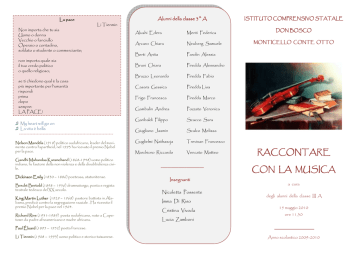 La pace Non importa che tu sia Uomo o donna Vecchio o fanciullo Operaio o contadino, soldato o studente o commerciante; Li Tienmin non importa quale sia il tuo credo politico o quello religioso; se ti chiedono qual è la cosa più importante per l’umanità rispondi prima dopo sempre: LA PACE! ♫ My heart will go on ♫ La vita è bella ---------------------------------------------------------------- Nelson Mandela (1918) politico sudafricano, leader del movimento contro l’apartheid, nel 1993 ha ricevuto il premio Nobel per la pace. Gandhi Mahandas Mahandas Karamchand (1868-1948) uomo politico indiano, fu fautore della non violenza e della disubbidienza civile. Dickinson Emily (1830 – 1886) poetessa, statunitense. Brecht Bertold (1898 – 1956) drammaturgo, poeta e regista teatrale tedesco del XX secolo. King Martin Luther (1929 – 1968) pastore battista in Alabama, predicò contro la segregazione razziale . Ha ricevuto il premio Nobel per la pace nel 1964. Richard Rive (1931-1989) poeta sudafricano, nato a Capetown da padre afroamericano e madre africana. Alunni della classe classe 3^ A Alushi Edera Menti Federica Arcaro Chiara Neuberg Samuele Berti Anita Parolin Alessia Bruni Chiara Piredda Alessandro Bruzzo Leonardo Piredda Fabio Casara Gessica Piredda Lisa Frigo Francesca Piredda Marco Gambalin Andrea Pozzato Veronica Garibaldi Filippo Scacco Sara Giugliano Jasmin Scalco Melissa Guglielmi Nathascja Trevisan Francesco Marchioro Riccardo Vencato Matteo --------------------------Insegnanti Nicoletta Possente Imma Di Riso Cristina Vivoda Lucia Zamboni ISTITUTO COMPRENSIVO STATALE DON BOSCO MONTICELLO CONTE OTTO RACCONTARE CON LA MUSICA a cura degli alunni della classe III A 15 maggio 2010 ore 11,30 Paul Éluard (1895 – 1952) poeta francese. Li Tienmin (1908 – 1993) uomo politico e storico taiwanese. Anno scolastico 2009-2010 RACCONTARE CON LA MUSICA Introduzione LE GRANDI GUERRE, LO STERMINIO Dichiarazione universale dei diritti umani (art 1) Tutti gli esseri umani nascono liberi ed uguali in dignità e diritti. Essi devono agire gli uni verso gli altri in spirito di fratellanza. (art 2) Gli stati devono rispettare, nel loro territorio, i diritti di tutti gli uomini, senza nessuna distinzione di colore della pelle, sesso, lingua, religione, opinione politica, origine nazionale o sociale. (art 3) Ogni individuo ha diritto alla vita, alla libertà e alla sicurezza della propria persona. ♫ Fratelli d’Italia ♫ Les feuilles mortes Chi sta in alto dice La guerra che verrà Chi sta in alto dice: si va verso la gloria chi sta in basso dice: si va verso la fossa. La guerra che verrà non è la prima. Prima ci sono state altre guerre. Alla fine dell’ultima c’erano vincitori e vinti. Fra i vinti la povera gente faceva la fame. Fra i vincitori faceva la fame la povera gente ugualmente. (Bertold Brecht) ♫ Gam Gam ♫ Le deserteur Non verremo alla alla meta ad uno ad uno Paul Éluard Non verremo alla meta ad uno ad uno ma due a due. Se ci conosceremo a due a due, noi ci conosceremo tutti, noi ci ameremo tutti e i figli un giorno rideranno della leggenda nera dove un uomo lacrima in solitudine. ♫ Auschwitz Nelson Mandela o L’uomo coraggioso non è colui che non prova paura, ma colui che riesce a superarla. [...] o Ho sempre saputo che nel fondo di ogni cuore umano si trovano pietà e generosità. Nessuno nasce odiando i propri simili a causa della razza, della religione, o della classe alla quale appartengono. [...] o Gli uomini hanno imparato a odiare, e se possono imparare a odiare possono anche imparare ad amare, perché l’amore, per il cuore umano, è più naturale dell’odio. [...] o Nell’uomo la bontà è una fiamma che può rimanere celata, ma mai estinguersi completamente. [...] LA PROTESTA, I DIRITTI ♫ Blow’ the wind ♫ No woman no cry Dove termina l’arcobaleno Richard Rive Dove termina l’arcobaleno deve esserci un luogo, fratello, dove si potrà cantare ogni genere di canzoni, e noi canteremo insieme, fratello, tu ed io, anche se tu sei bianco e io non lo sono, sarà una canzone triste, fratello, perché non sappiamo come fa, ed è difficile da imparare, ma possiamo riuscirci, fratello, tu ed io. Non esiste una canzone nera. Non esiste una canzone bianca. Esiste solo musica, fratello, ed è musica quella che canteremo dove termina l’arcobaleno. ♫ El pueblo unido M. L. King o I have a dream that one day this nation will rise up and live out the true meaning of its creed: "we hold these truths to be self-evident, that all man are created equal. Io ho un sogno, che un giorno questa nazione si sveglierà e vivrà il vero significato del suo credo: "noi riteniamo che questa verità sia evidente, che tutti gli uomini sono creati uguali". o I have a dream that one day on the red hills of Georgia the sons of former slaves and the sons of former slaveowners will be able to sit down together at a table of brotherhood. Io ho un sogno, che un giorno sulle rosse colline della Georgia i figli degli antichi schiavi e i figli degli antichi proprietari di schiavi, potranno sedere insieme al tavolo della fratellanza. o I have a dream that my four children will one day live in a nation where they will not be judged by the color of their skin but by the content of their character. Io ho un sogno, che i miei quattro piccoli figli vivranno un giorno in una nazione dove non saranno giudicati per il colore della loro pelle, ma per il loro carattere. o I have a dream today. Ho davanti a me un sogno, oggi! IL SOGNO, LA LIBERTÀ ♫ We shall overcome ♫ Greensleaves If I can stop... Se io po potrò impe impedire... Emily Dickinson If I can stop one Heart from breaking I shall not live in vain If I can ease one Life the Aching Or cool one Pain Or help one fainting Robin Unto his Nest again I shall not live in vain. ♫ Let it be ♫ Libertango Se io potrò impedire a un cuore di spezzarsi non avrò vissuto invano Se allevierò il dolore di una vita o guarirò una pena o aiut